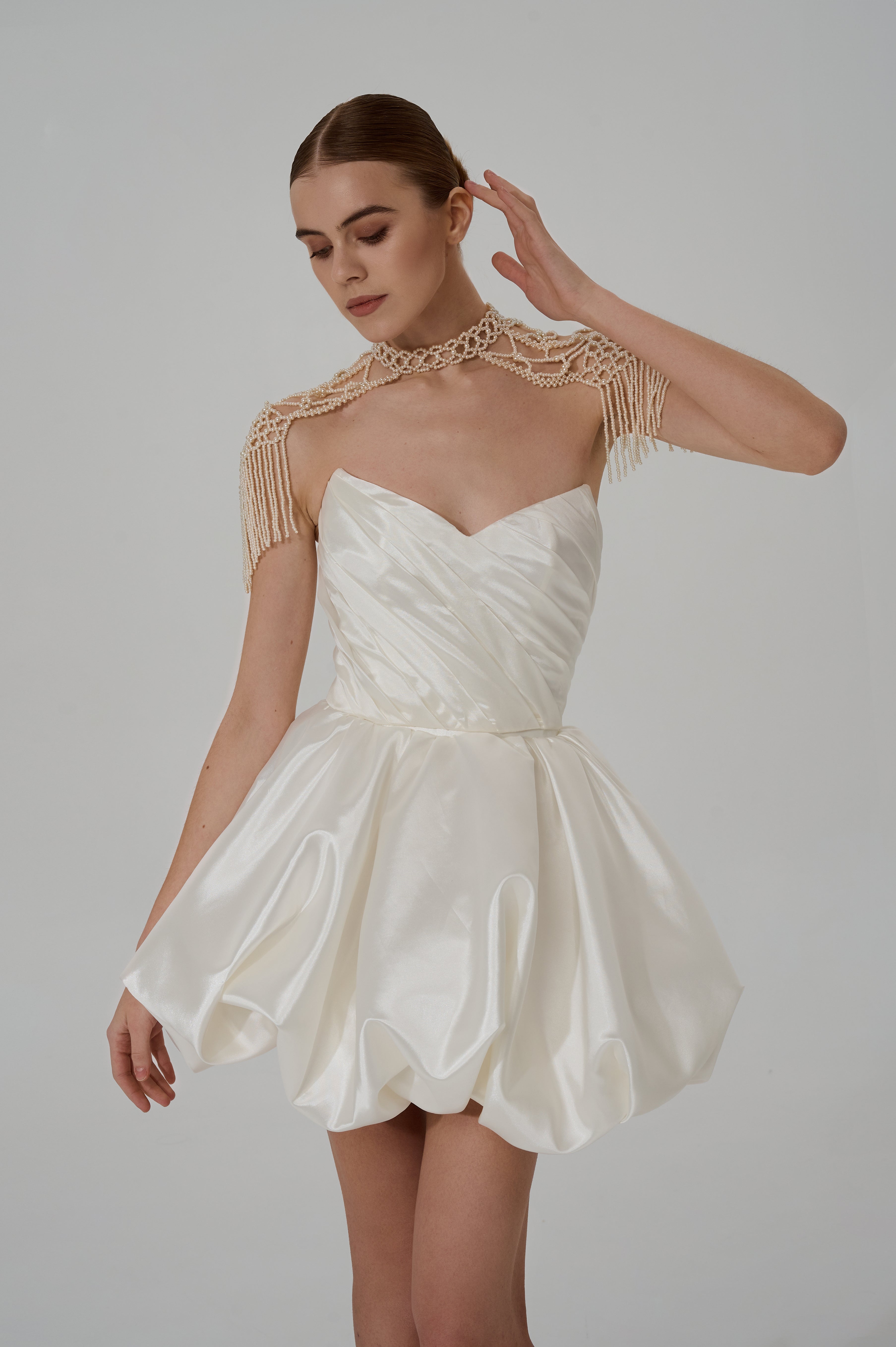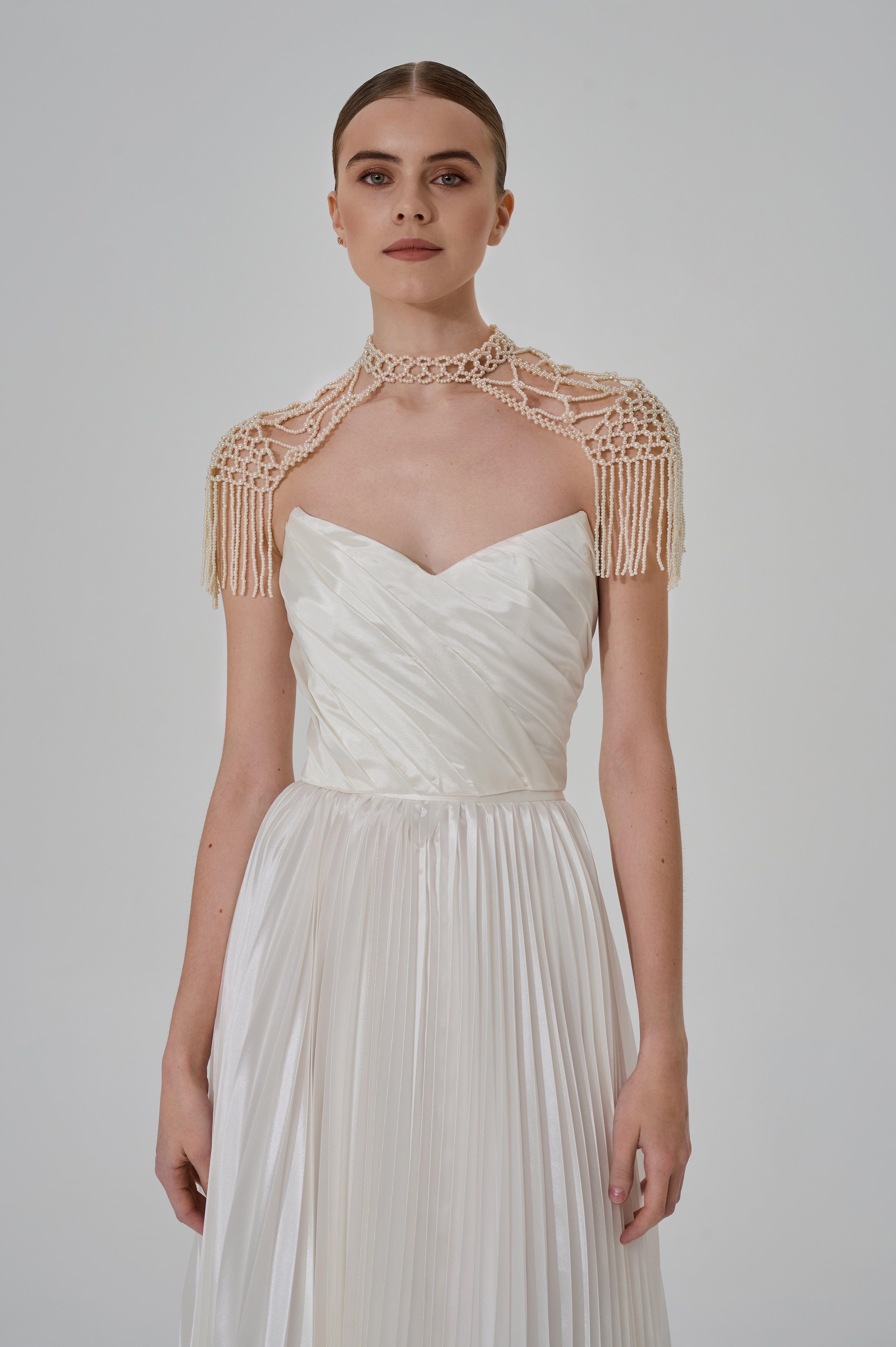 Pearl fringes falling along the arms create a special dynamic: when in motion, they sway gently, creating a dramatic yet delicate visual accent. It is this detail that makes the accessory ideal for photo shoots, formal ceremonies, and evening events where every detail matters.