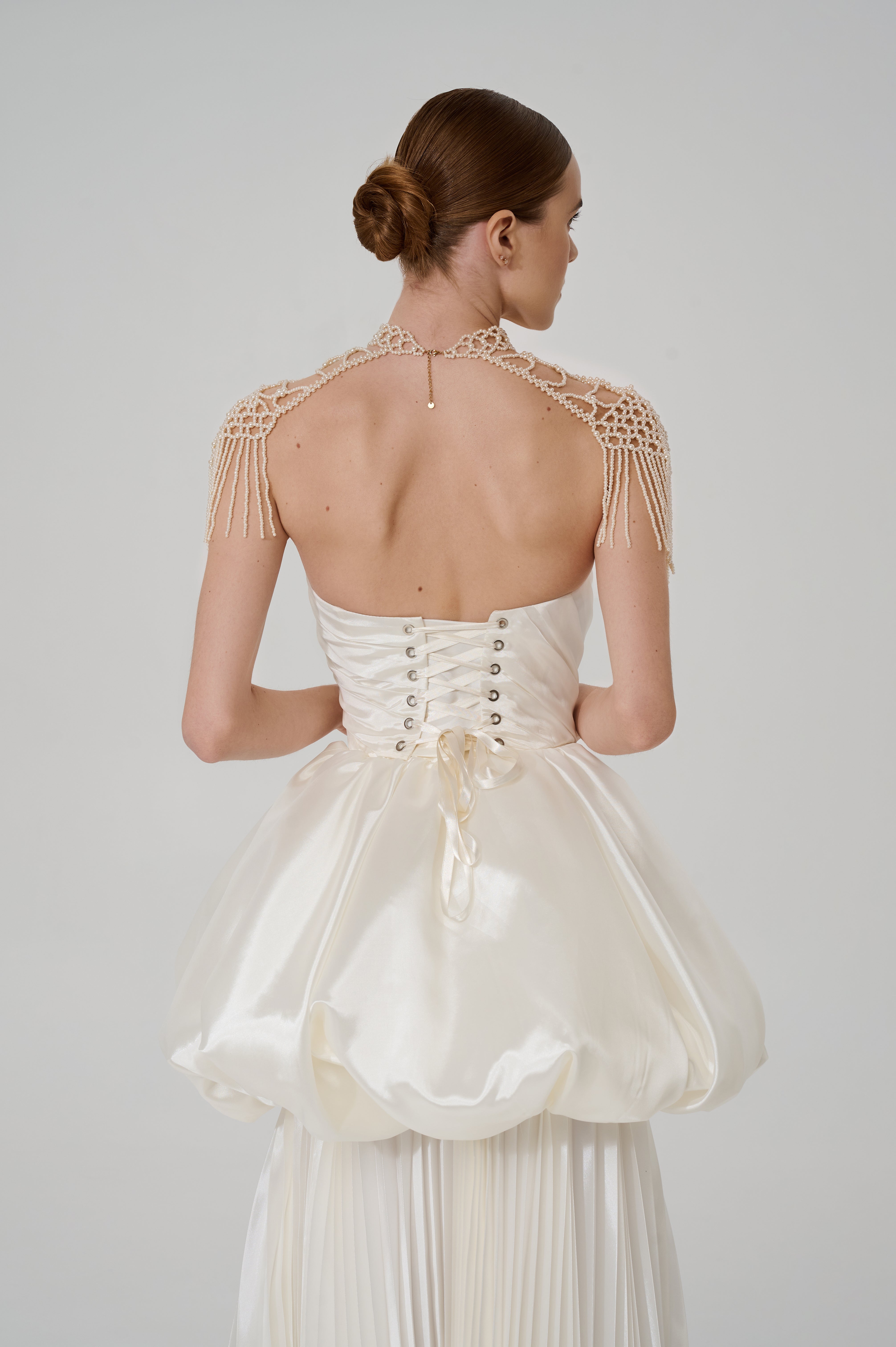 These pearl backpacks are designed as a jewelry accent that can completely transform a festive or wedding look, giving it luxury and unique character. They are made in the form of an openwork woven structure of pearls, forming a beautiful geometric pattern along the shoulder line. This shape gently outlines the silhouette and creates a delicate contour that goes well with open corsets, asymmetrical dresses, or minimalist tops.