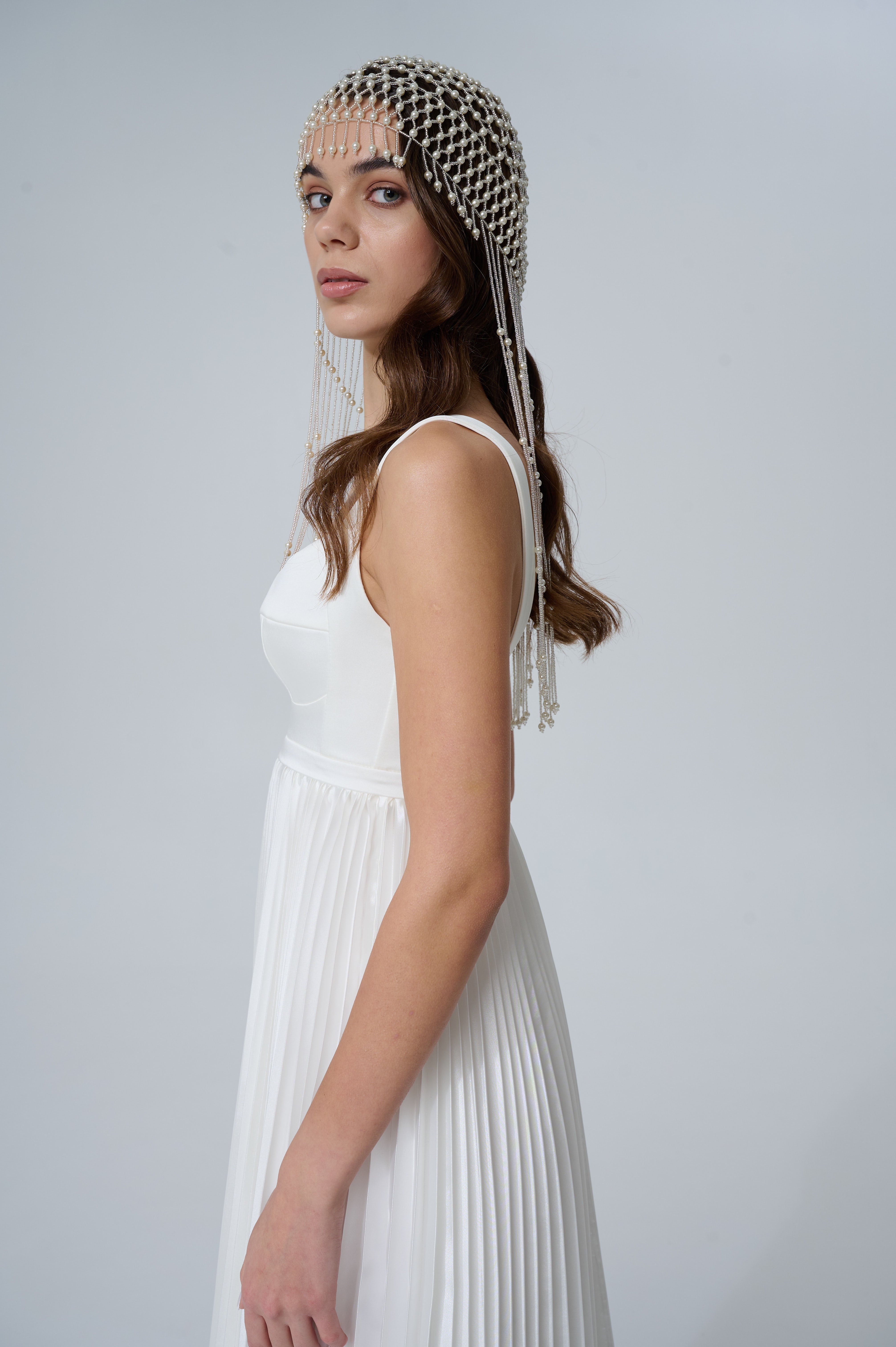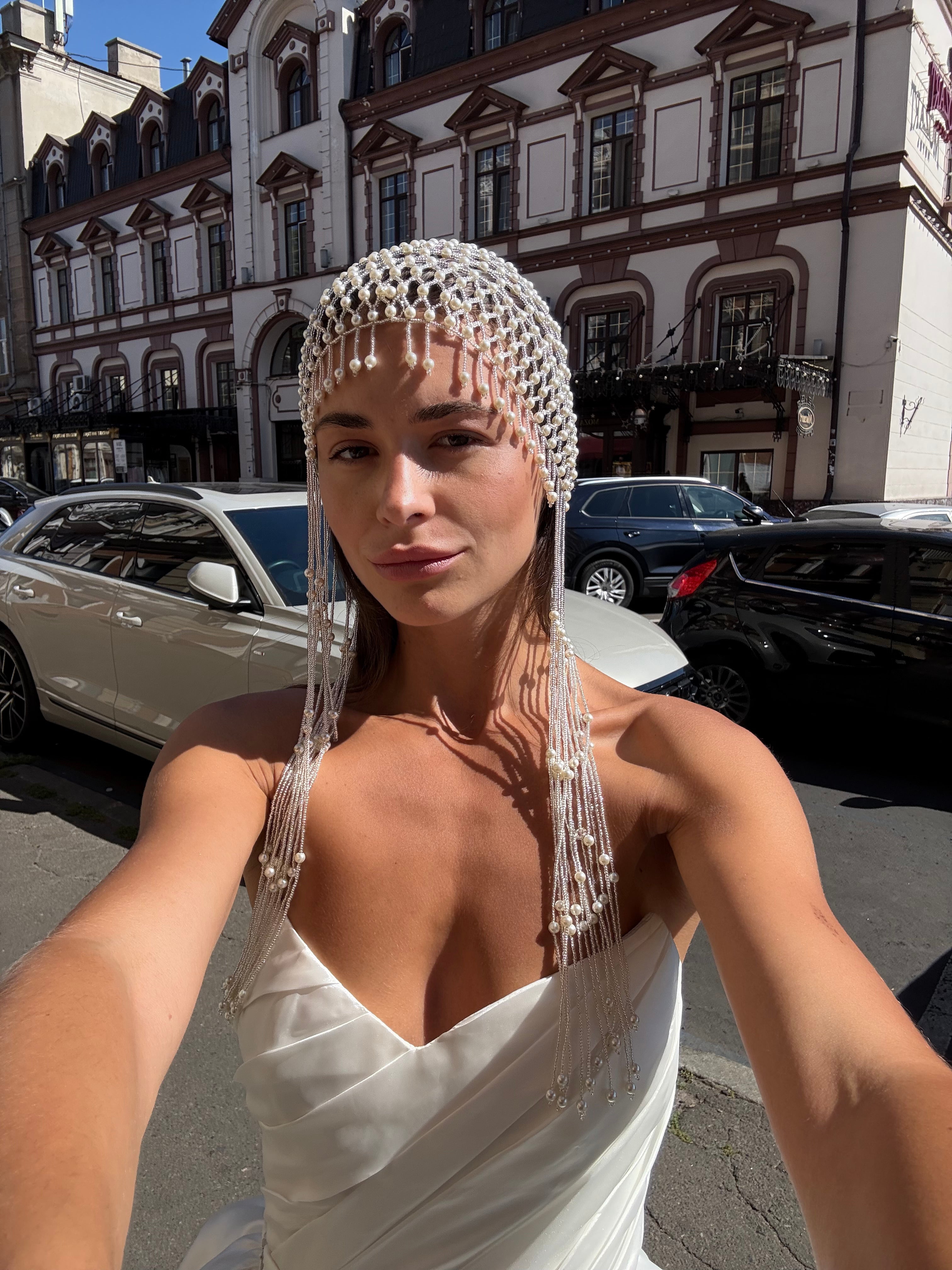 Each pearl is fixed by hand, giving the cap a flawless shape that fits comfortably on the head and does not slip even during active movement. The front is decorated with vertical pearl pendants that form a delicate fringe above the face, visually elongating the oval and adding an air of refined mystery to the look.