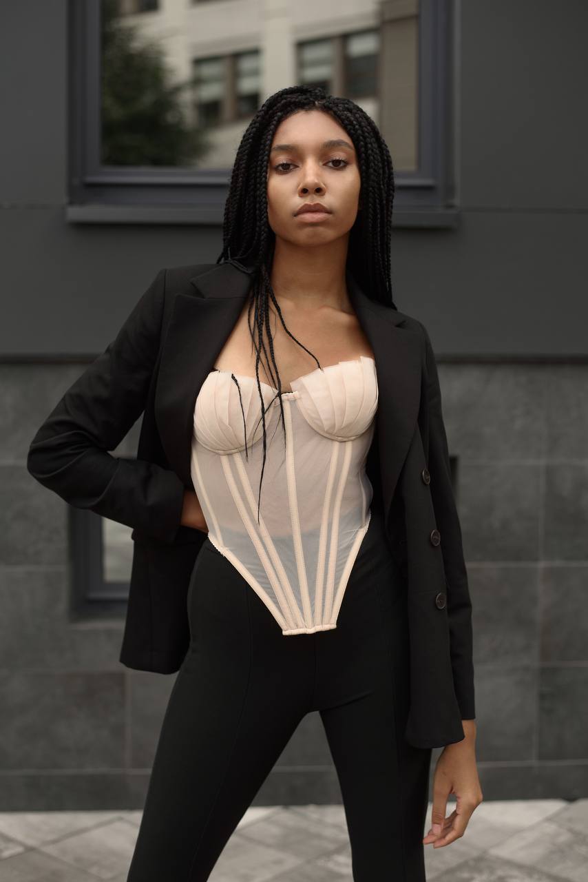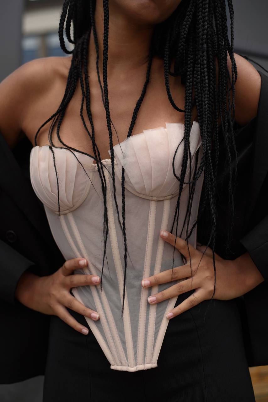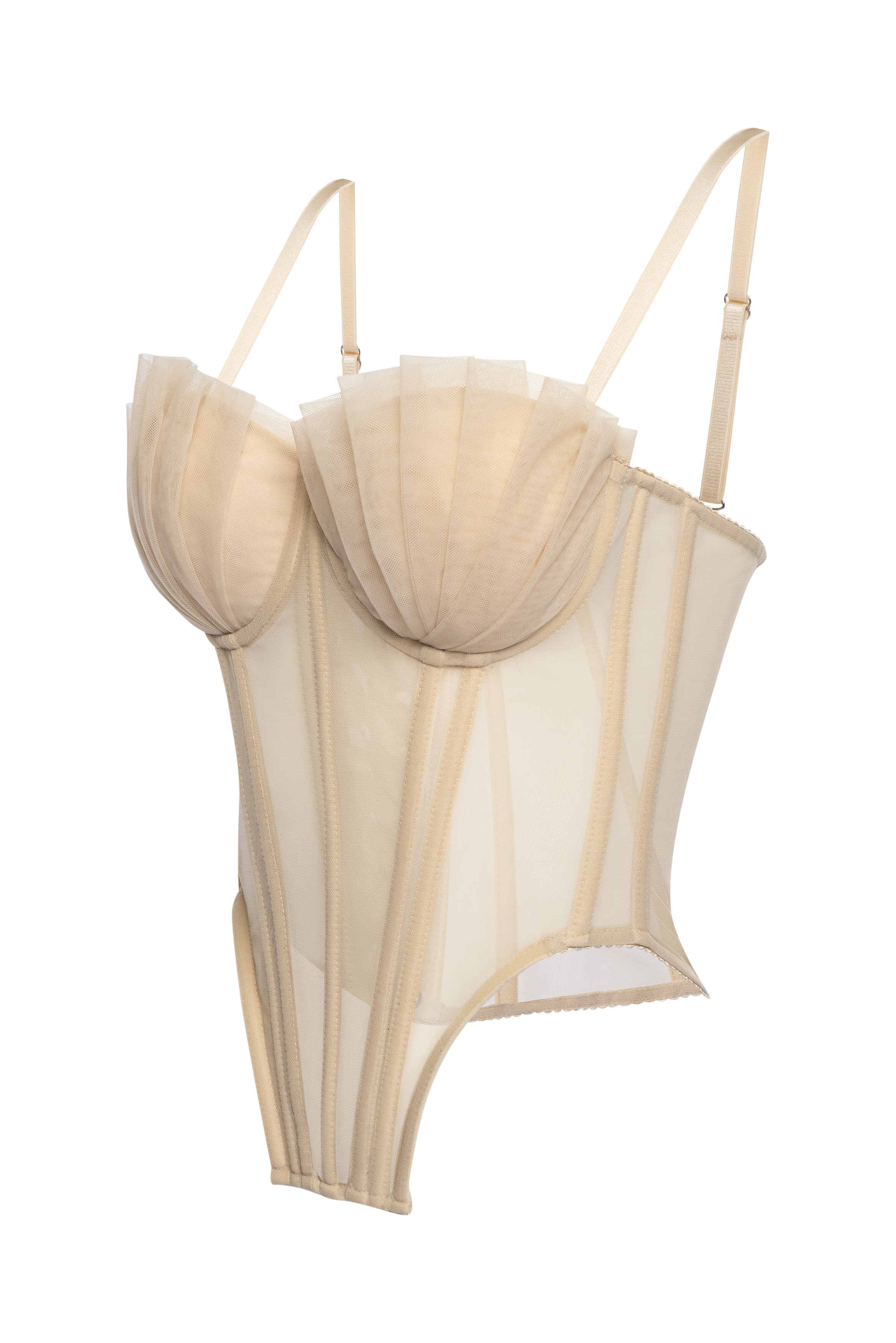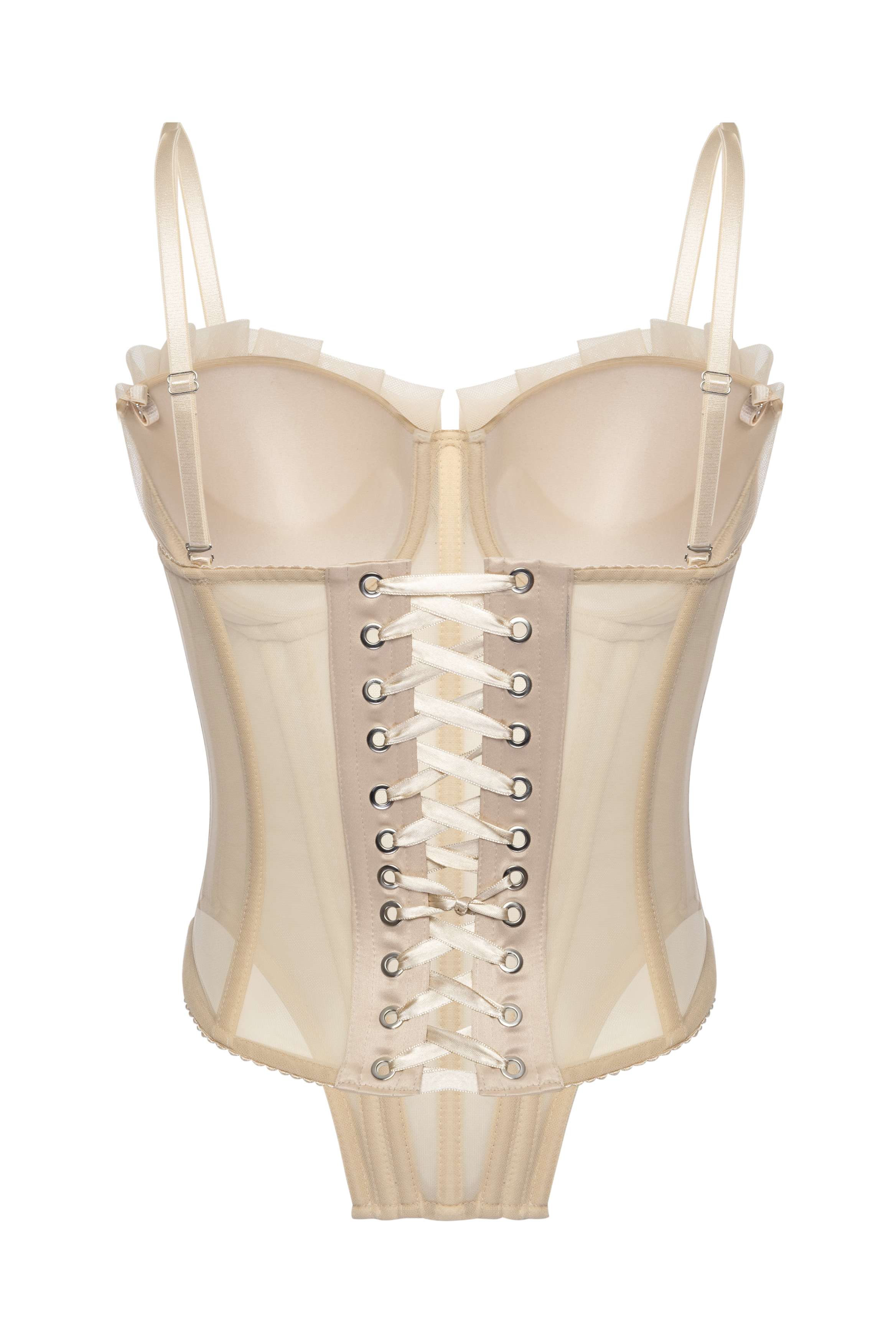 Beige Mesh Corset Top With Folds Cups, Removable Straps Nude Crop Top, Lacing Up Custom Corset