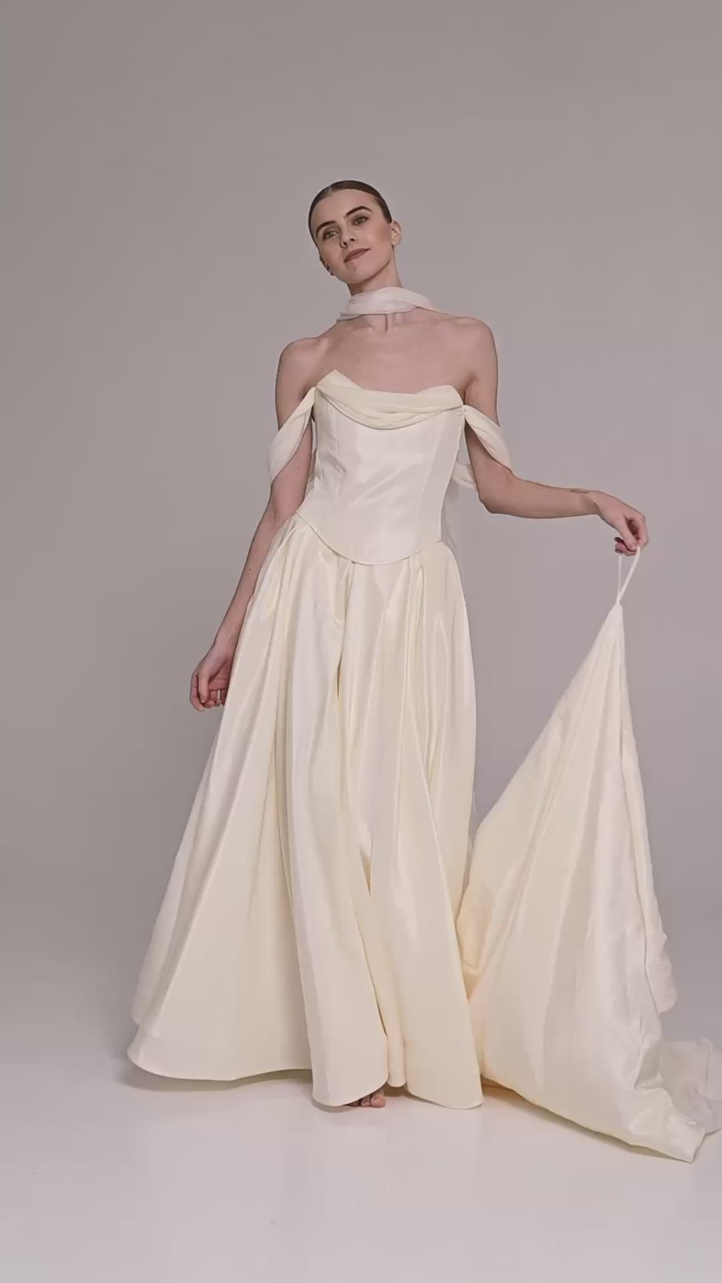 The lush A-line wedding skirt creates a stunning wedding silhouette, complemented by an elegant long train. A special feature of the skirt is a special loop for the arms, which ensures comfortable wearing of the train during the ceremony and celebration. This taffeta wedding dress looks royally rich thanks to the material's ability to hold its shape.