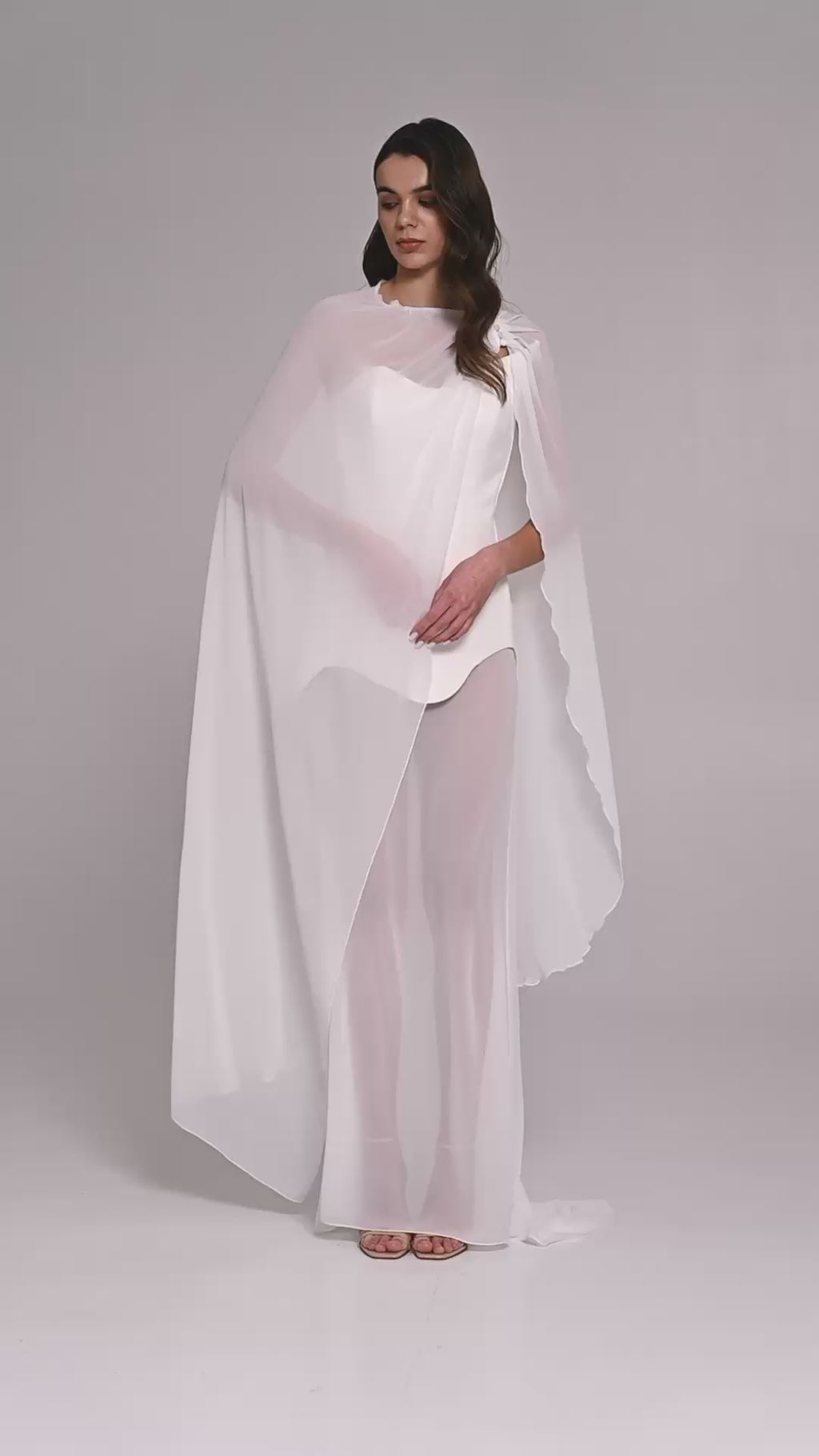The set includes a chiffon cape and scarf, allowing you to create different variations of the look. This wedding dress with detachable skirt is a versatile solution for the modern bride who appreciates mixed styles. Thanks to the different ways it can be worn, this wedding set allows you to create several looks during one celebration. The perfect choice for a wedding, photo shoot, or special occasion.