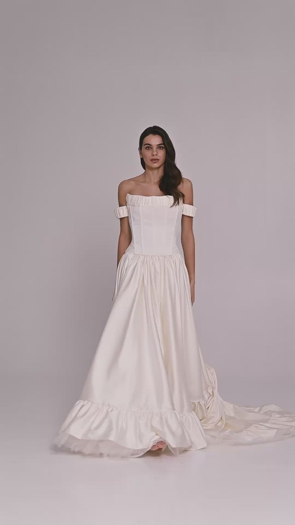 This elegant wedding set in an exquisite dark ivory shade combines two separate elements to create the perfect wedding ensemble. The satin corset top with dropped sleeves and lacing at the back lends the look a romantic sophistication, while ensuring a perfect fit thanks to its corset base.