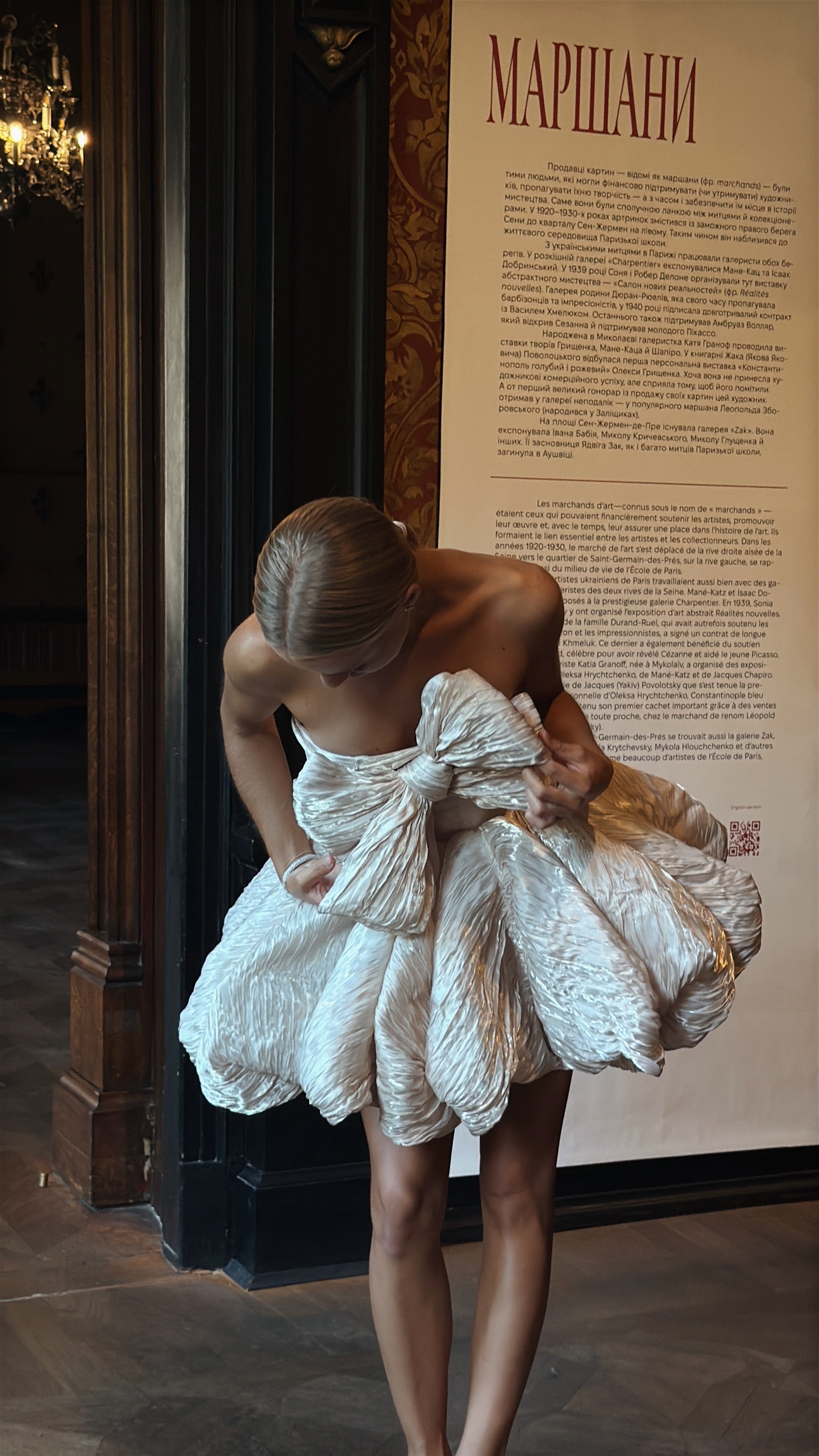 A short wedding dress that combines bold design and a perfect fit. The model is strapless, but thanks to the corset base, it holds its shape perfectly without causing discomfort. The main accent is a luxurious slanted bow, which is effectively placed across the entire chest area. It adds grace and girlish energy to the look.