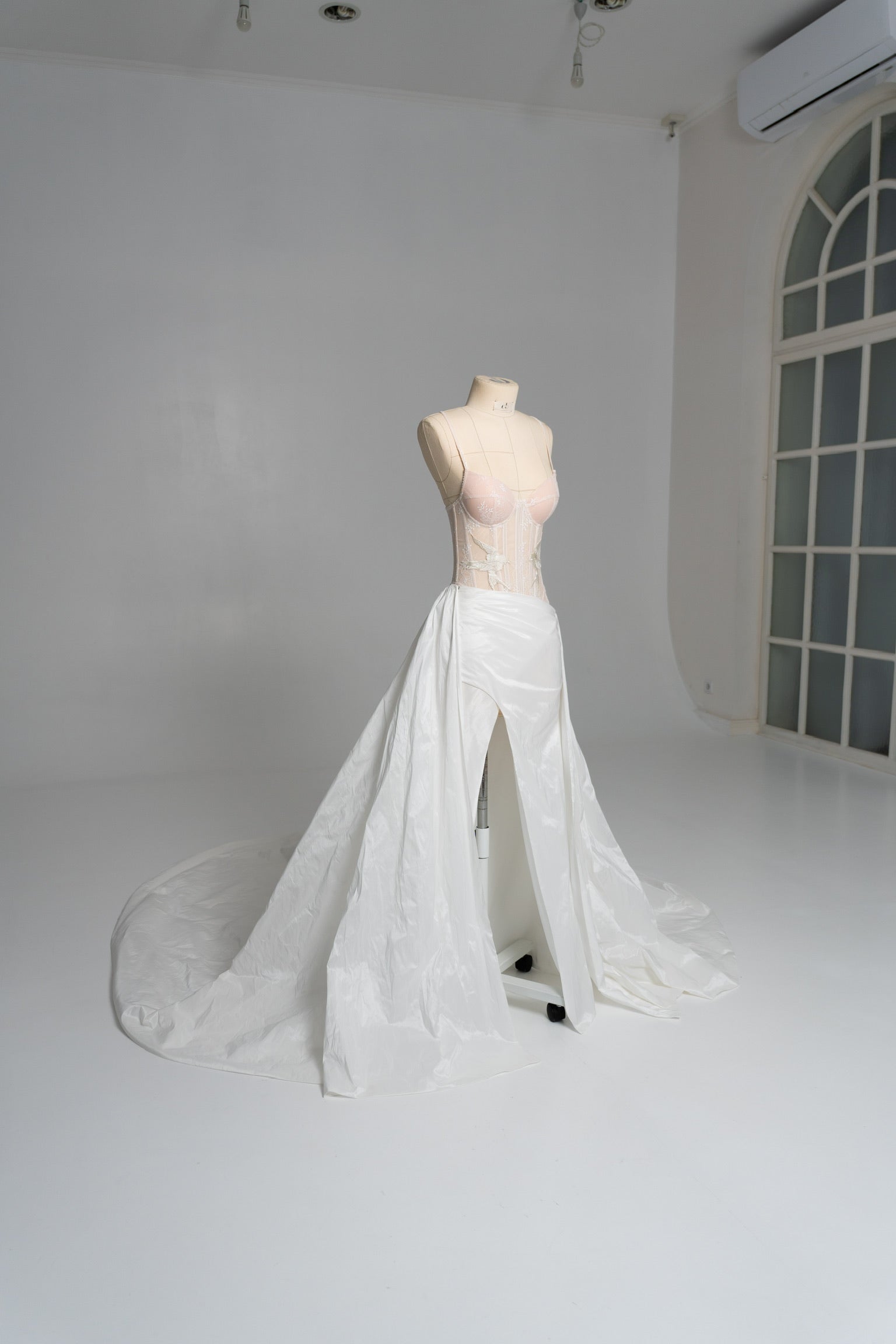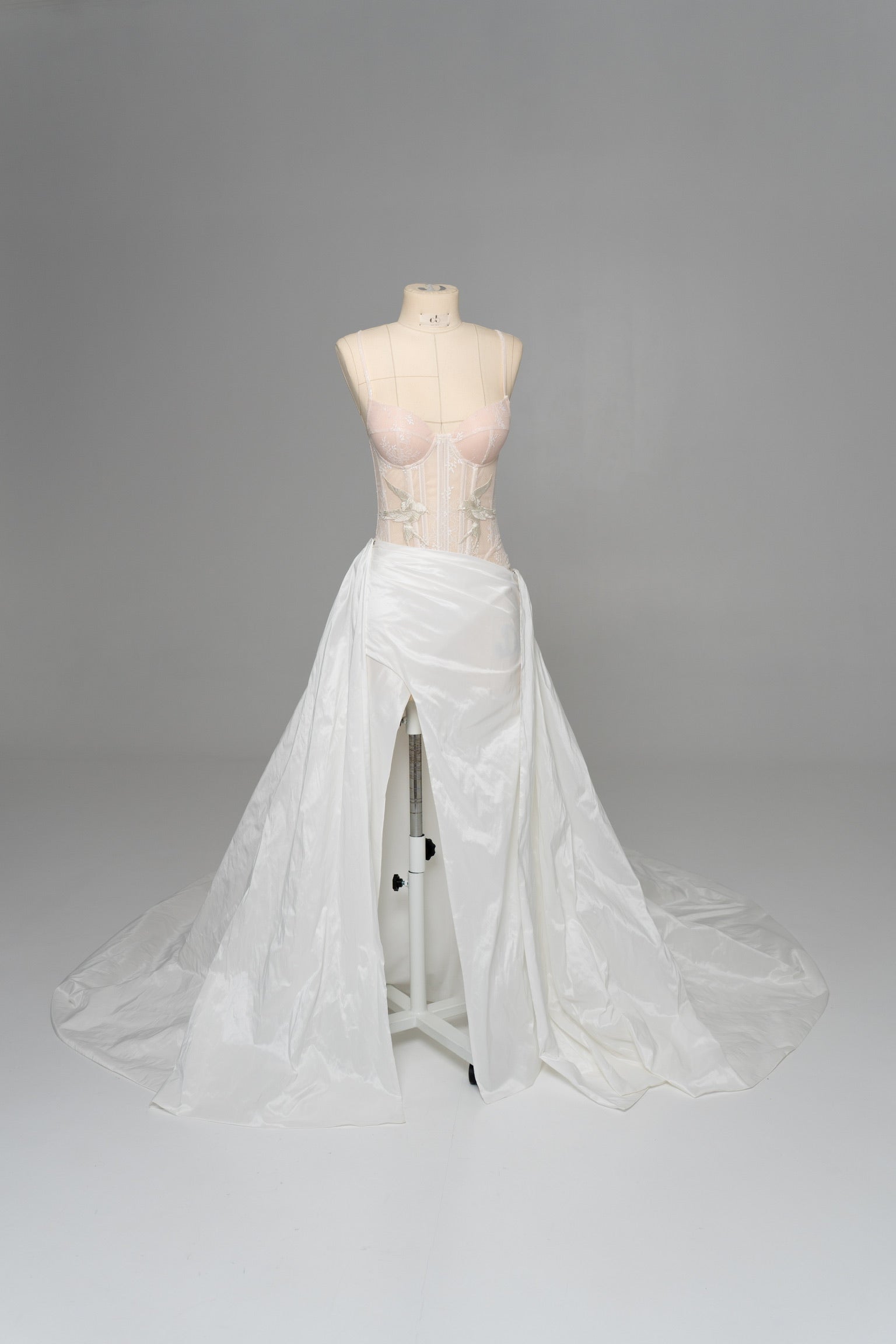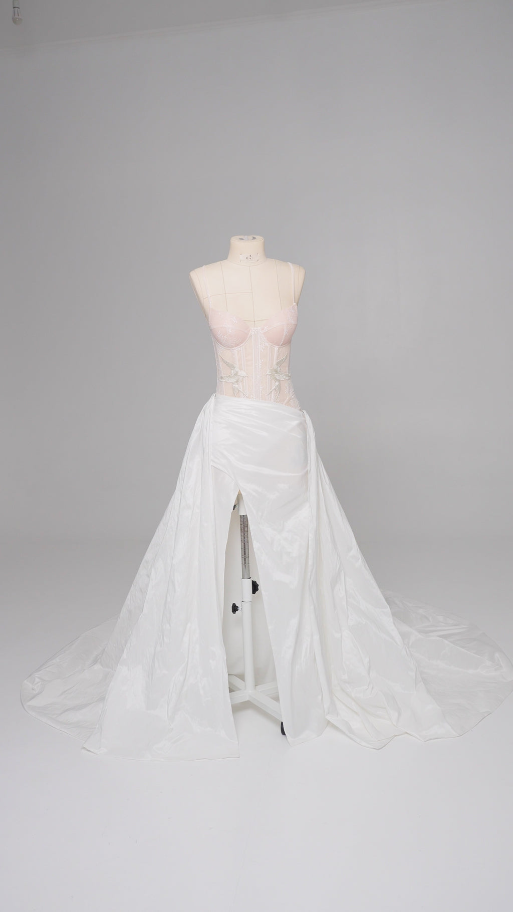The bottom is represented by a luxurious white skirt made of light but dense taffeta, which forms a noble shine and retains volume even during movement. Thanks to convenient fasteners, the skirt can be changed or combined with other elements, making it part of a versatile wedding skirt. It transitions into a long, flowing train, which adds solemnity to the look and makes the silhouette expressive in space, creating the impression of a complete wedding dress.