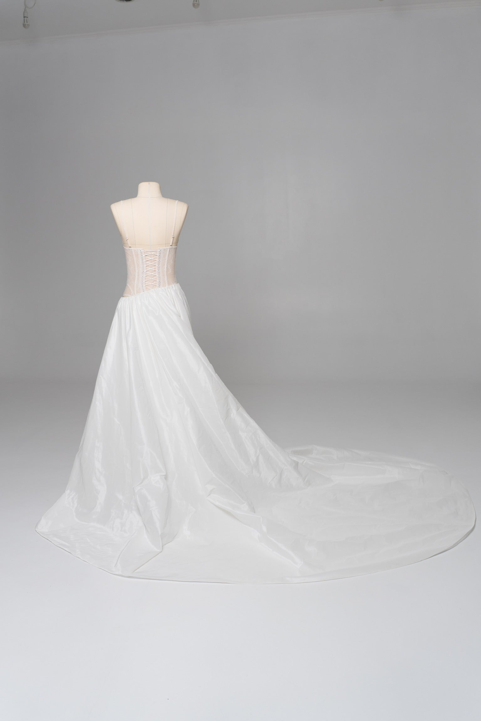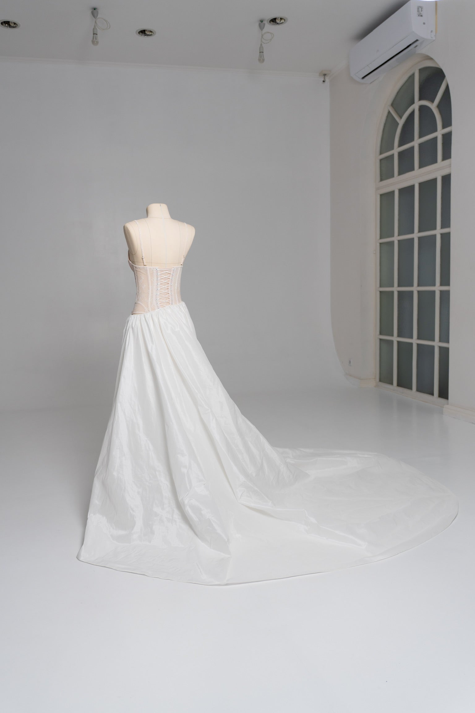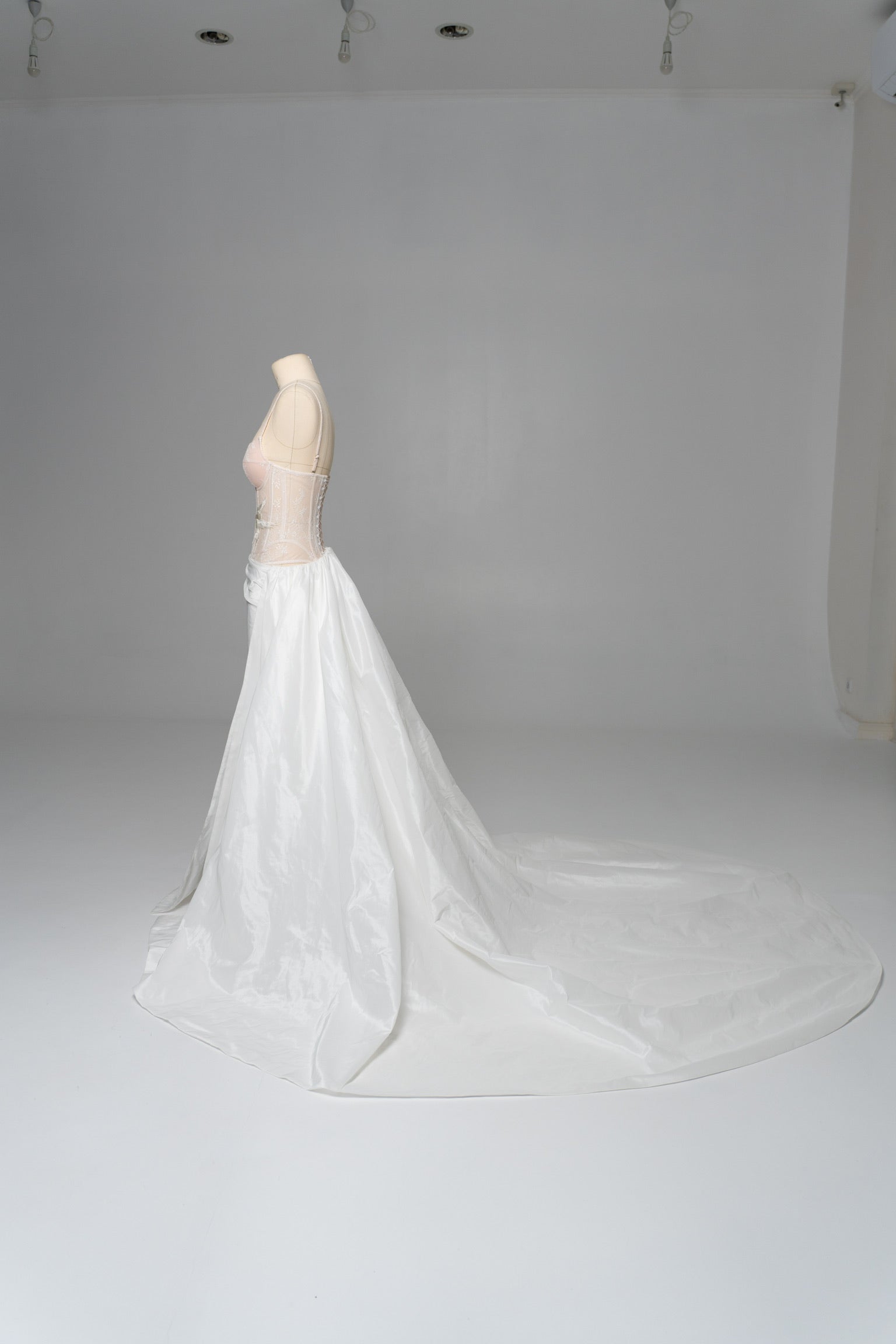 The bottom is represented by a luxurious white skirt made of light but dense taffeta, which forms a noble shine and retains volume even during movement. Thanks to convenient fasteners, the skirt can be changed or combined with other elements, making it part of a versatile wedding skirt. It transitions into a long, flowing train, which adds solemnity to the look and makes the silhouette expressive in space, creating the impression of a complete wedding dress.