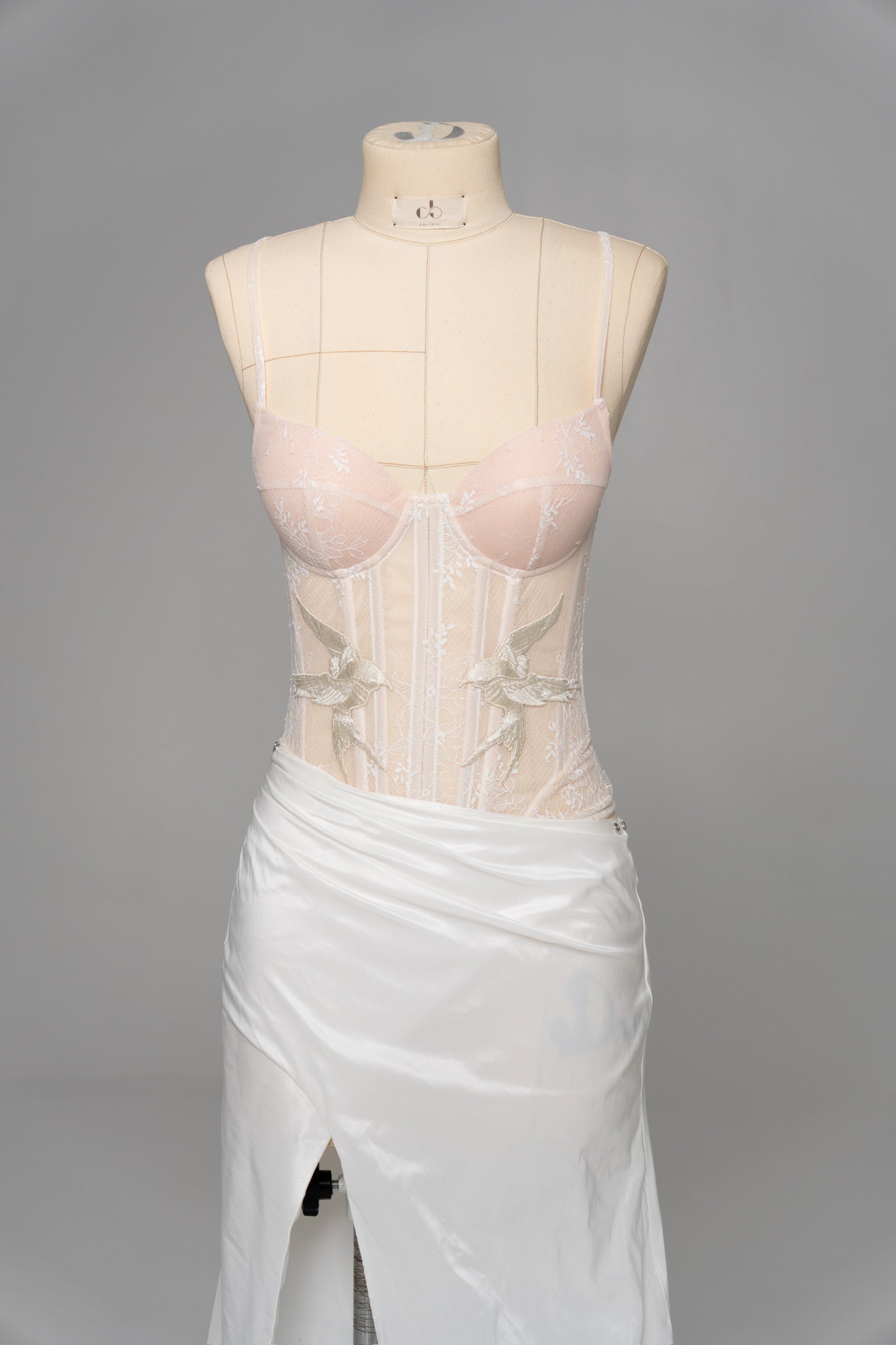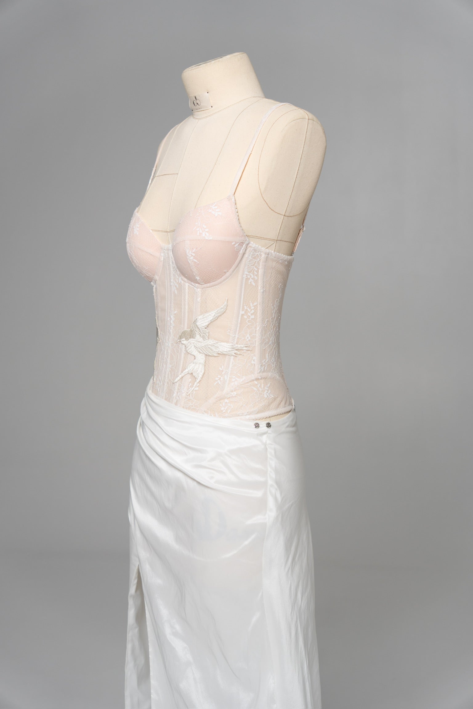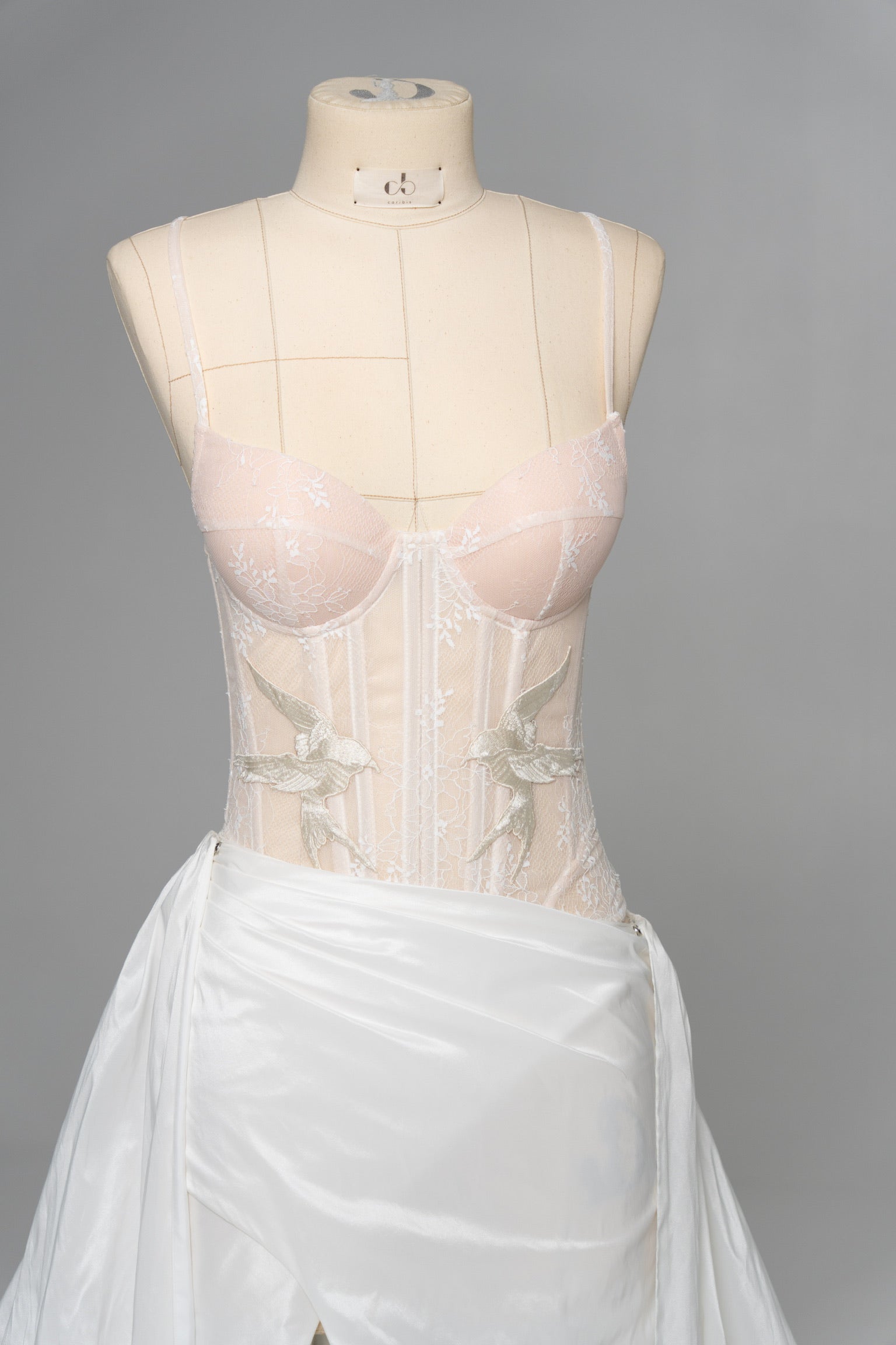 This look is designed for brides who want to combine the lightness of lace with the expressiveness of textured fabric, creating an exquisite wedding set with a sophisticated interplay of textures. The top is a sheer corset with a deep neckline, made in the style of a wedding corset top, where delicate lace is decorated with filigree embroidery in the form of birds — symbols of freedom and new beginnings. The soft nude lining creates a nude effect, but at the same time provides the comfort and support characteristic of a classic corset top. The back of the corset has corset lacing, which allows you to precisely adjust the fit and emphasize the natural lines of the body.