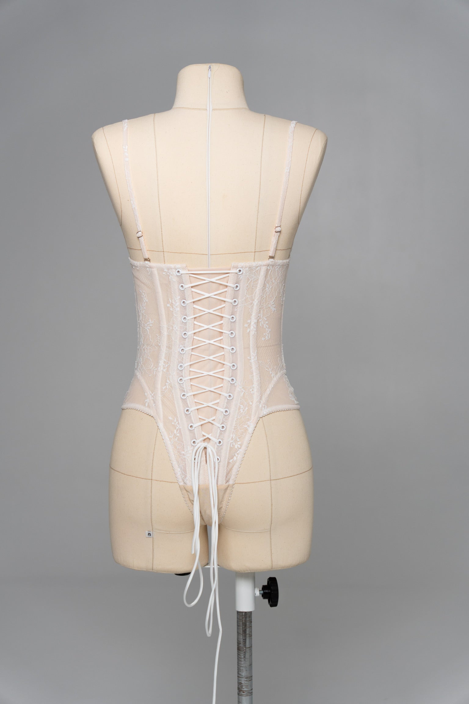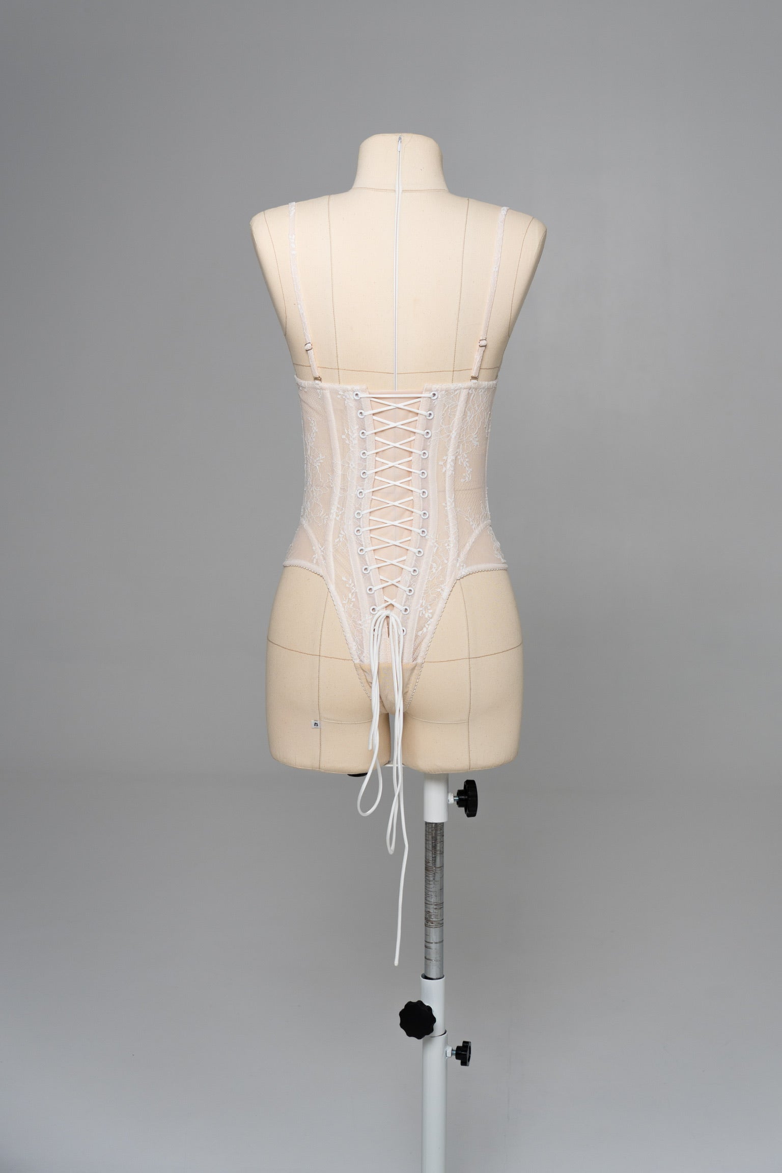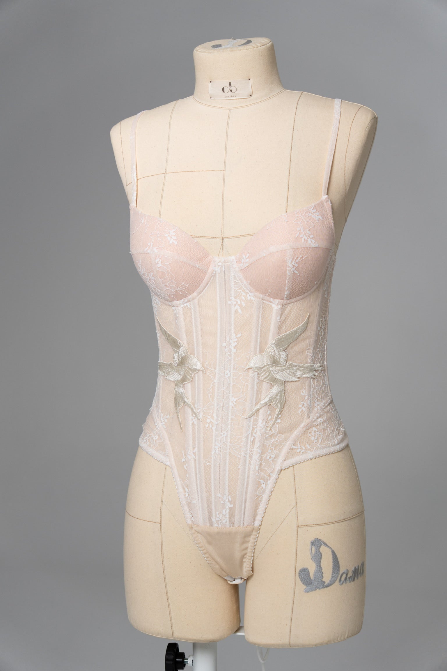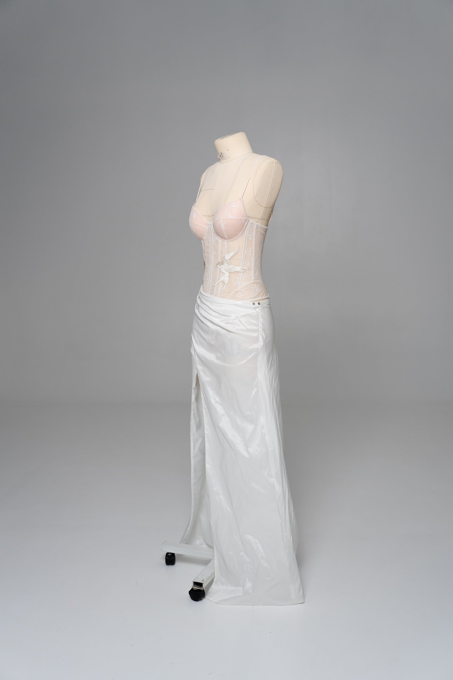 This look is designed for brides who want to combine the lightness of lace with the expressiveness of textured fabric, creating an exquisite wedding set with a sophisticated interplay of textures. The top is a sheer corset with a deep neckline, made in the style of a wedding corset top, where delicate lace is decorated with filigree embroidery in the form of birds — symbols of freedom and new beginnings. The soft nude lining creates a nude effect, but at the same time provides the comfort and support characteristic of a classic corset top. The back of the corset has corset lacing, which allows you to precisely adjust the fit and emphasize the natural lines of the body.