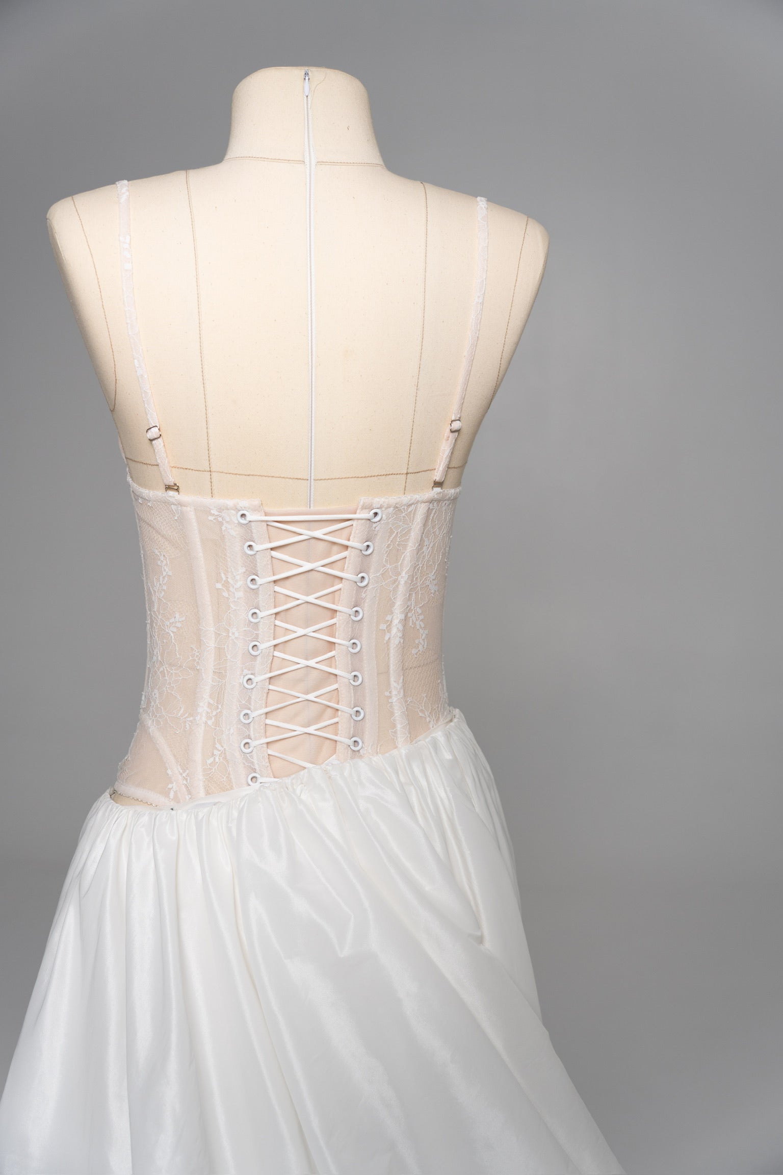A special detail of the design is the slit at the front, which reveals a delicate play of textures and emphasizes the lightness of movement. Thanks to the transformable elements, the set can serve as a full-fledged wedding dress with a detachable skirt, allowing the bride to create two looks — a luxurious ceremonial one and a lighter festive one for the evening part. This ensemble is the perfect combination of romanticism, individuality, and a modern interpretation of classic taffeta corsets & sets.