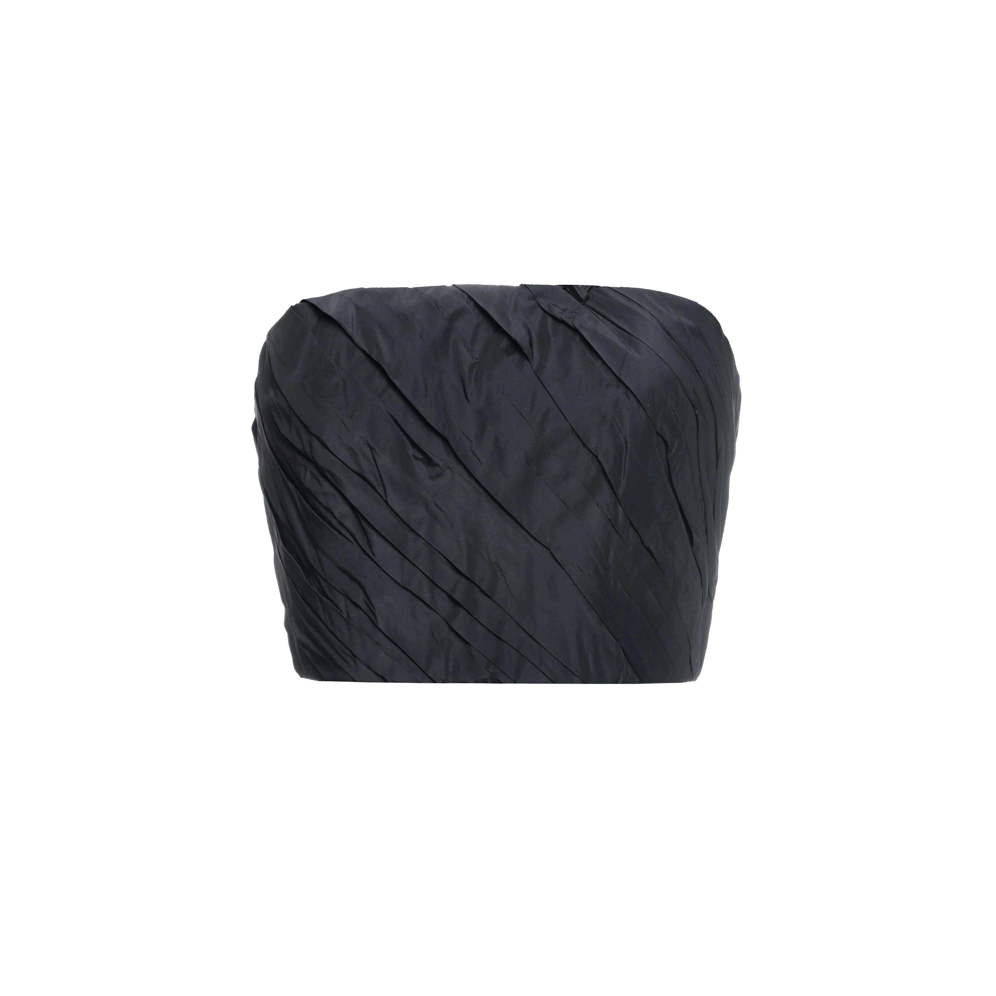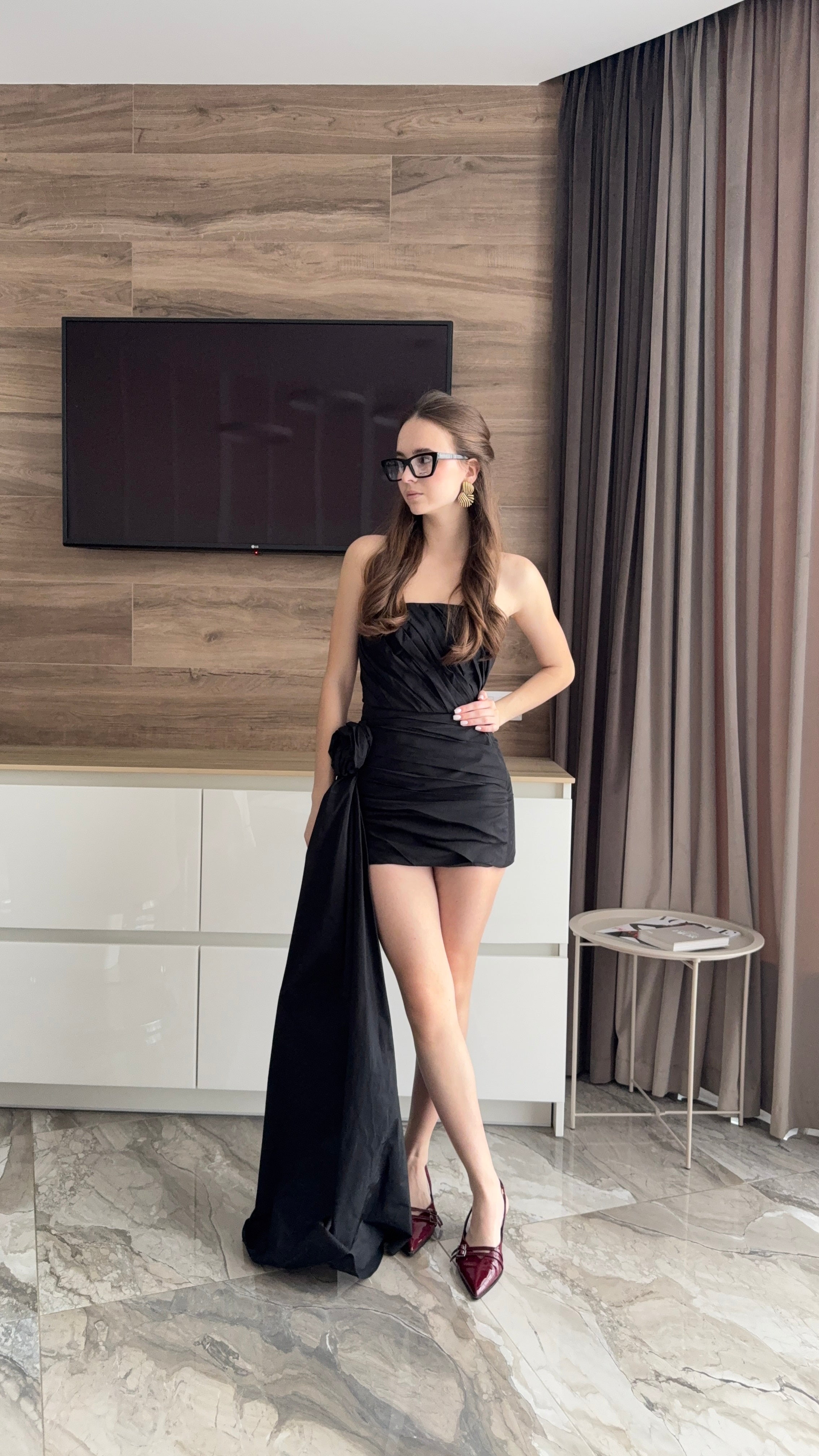 The main accent of the model is an asymmetrical long train, fastened at the hip in the form of a voluminous knot. It holds its shape well and creates a beautiful, wavy movement when walking. The short bottom emphasizes the legs, and the contrast between the minimalist cut and the luxurious train makes the look dynamic and festive.