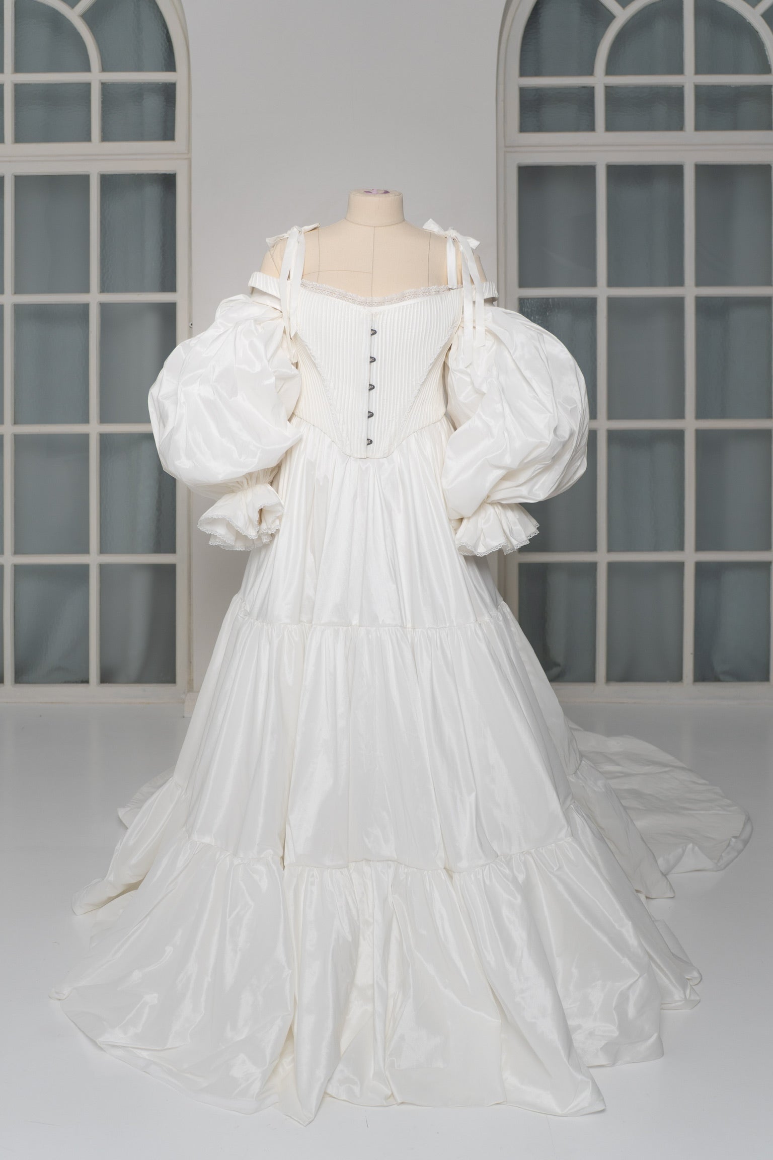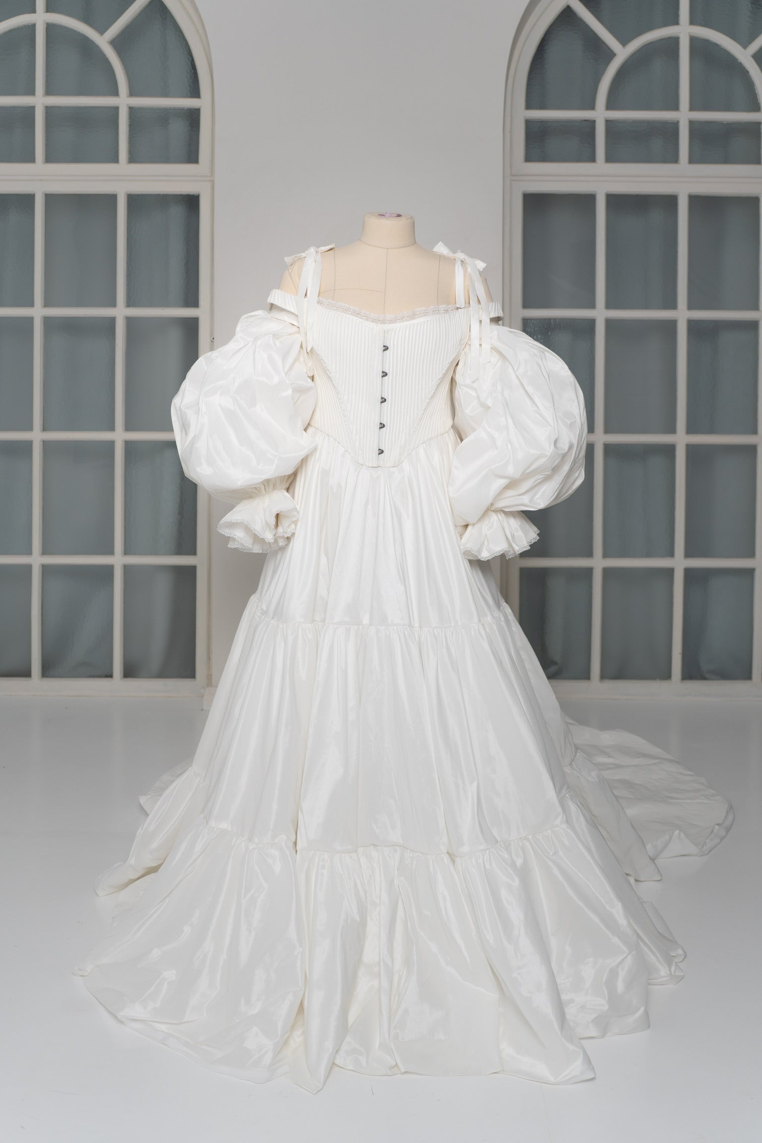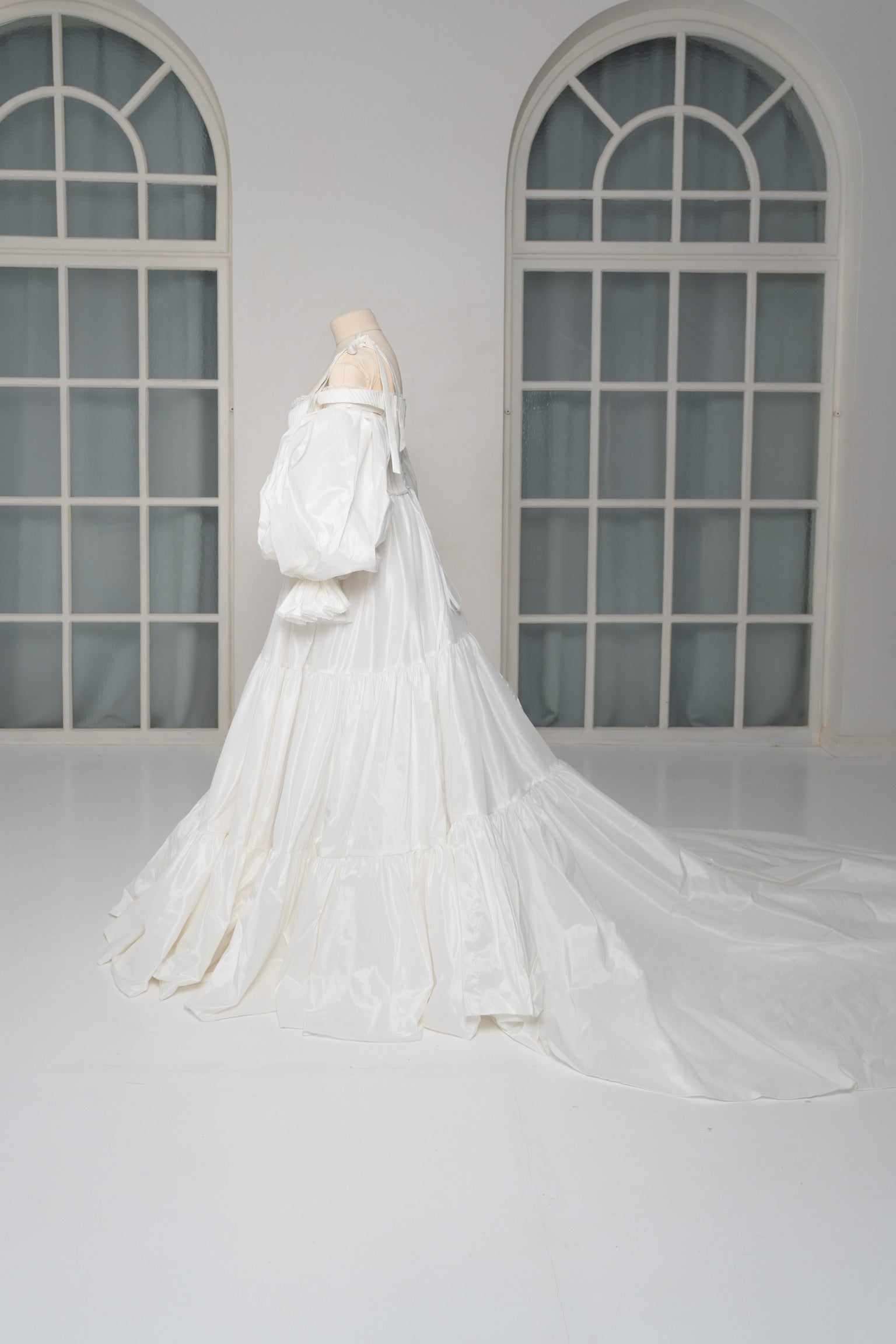 A lush taffeta wedding dress with an adjustable design. The multi-layered taffeta wedding skirt, like a musical note to your first wedding dance, ends with a long train-accordion. The draped wedding corset top with lacing at the back perfectly emphasizes the waist. It has fasteners at the front and seems to hug the figure, while the delicate lace on the chest and around the edge of the corset adds a delicate accent.