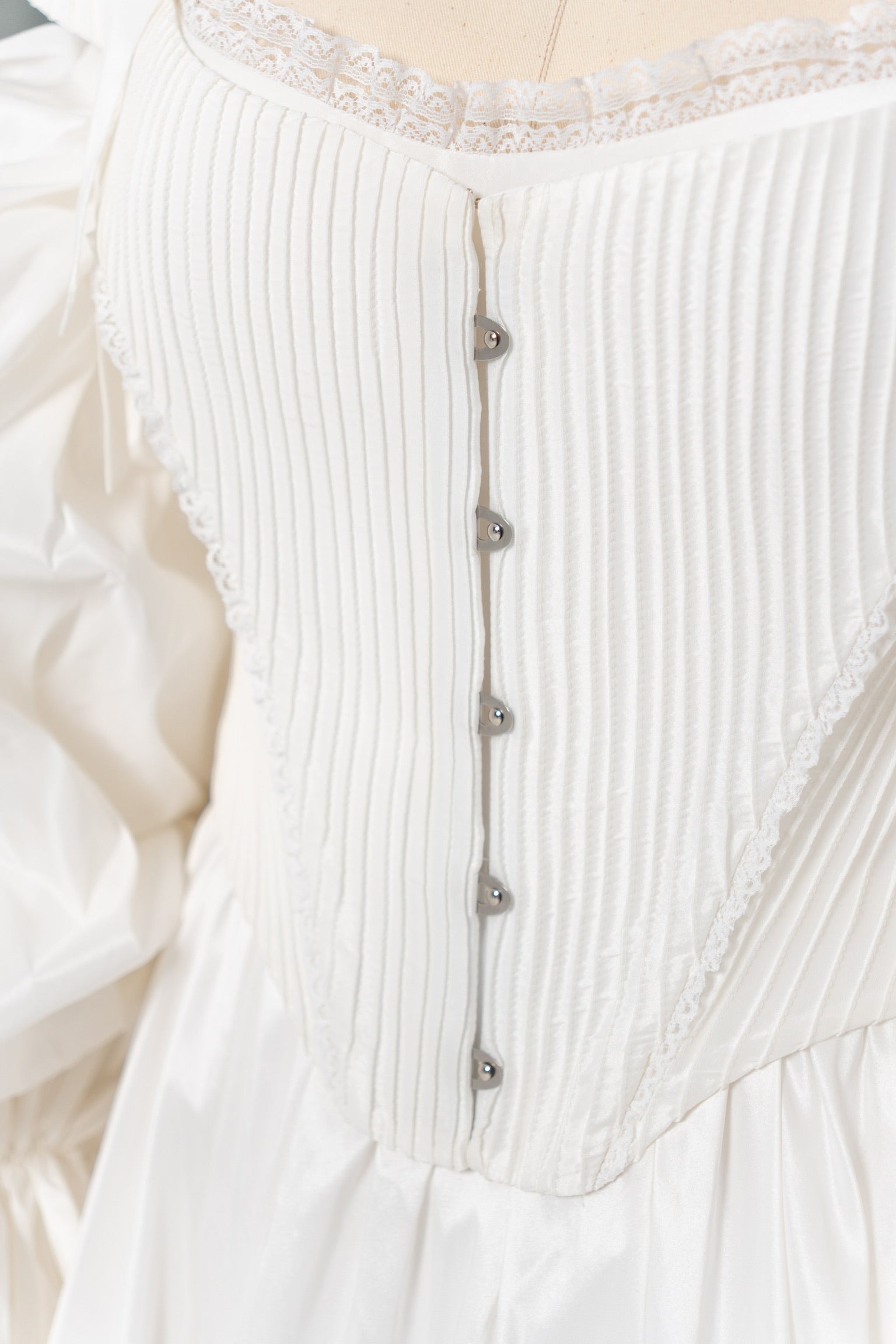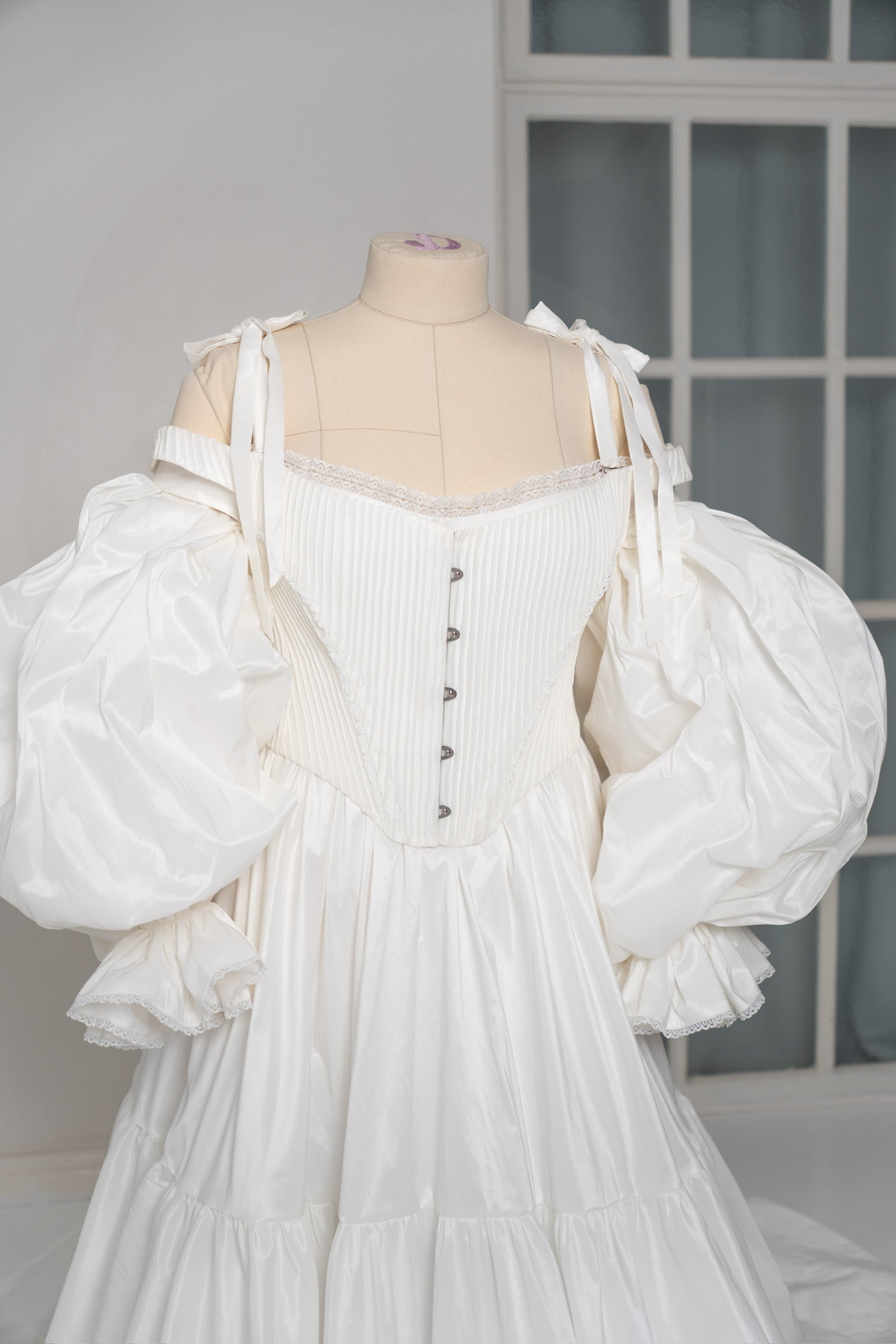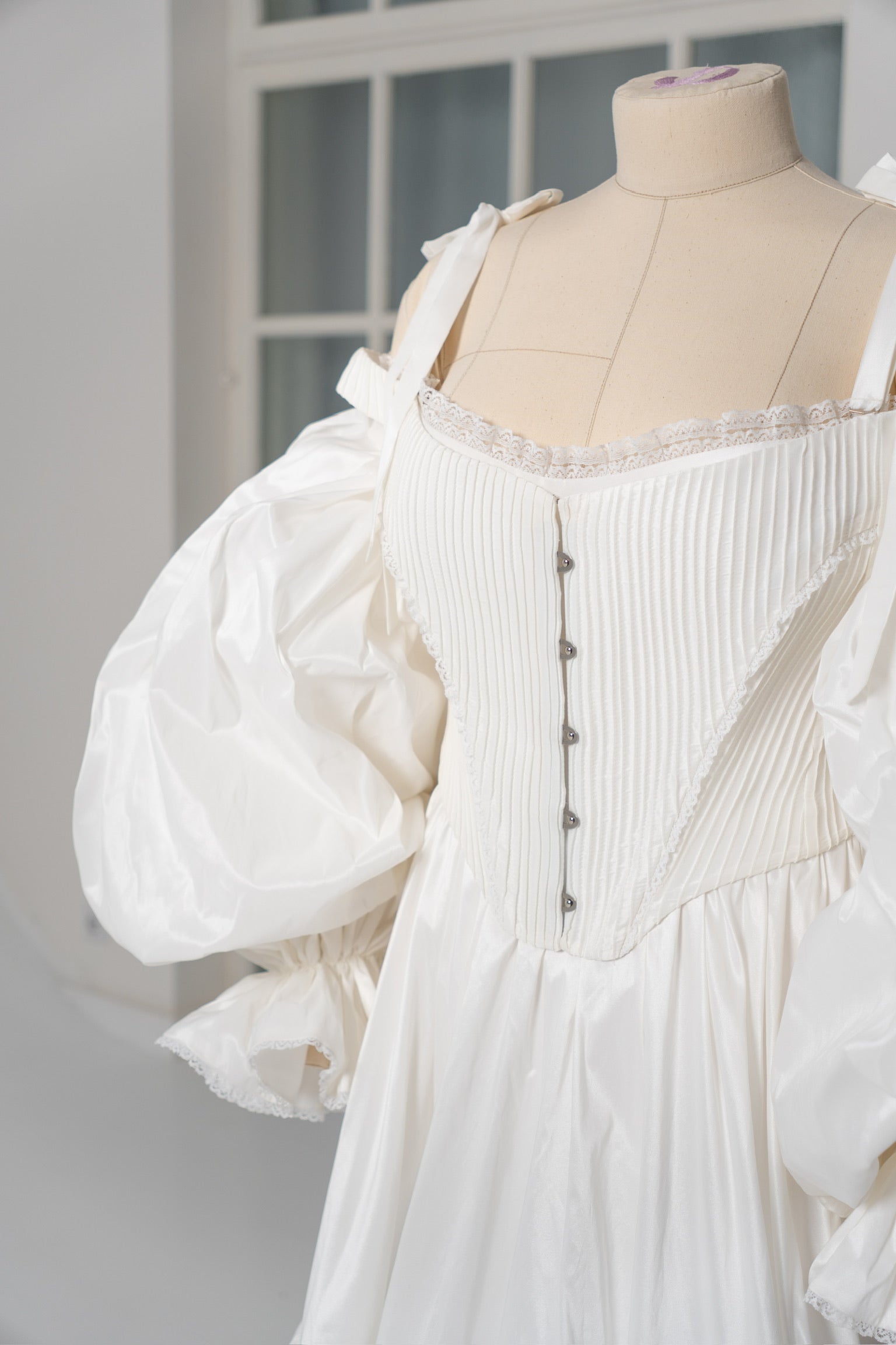 A lush taffeta wedding dress with an adjustable design. The multi-layered taffeta wedding skirt, like a musical note to your first wedding dance, ends with a long train-accordion. The draped wedding corset top with lacing at the back perfectly emphasizes the waist. It has fasteners at the front and seems to hug the figure, while the delicate lace on the chest and around the edge of the corset adds a delicate accent.
