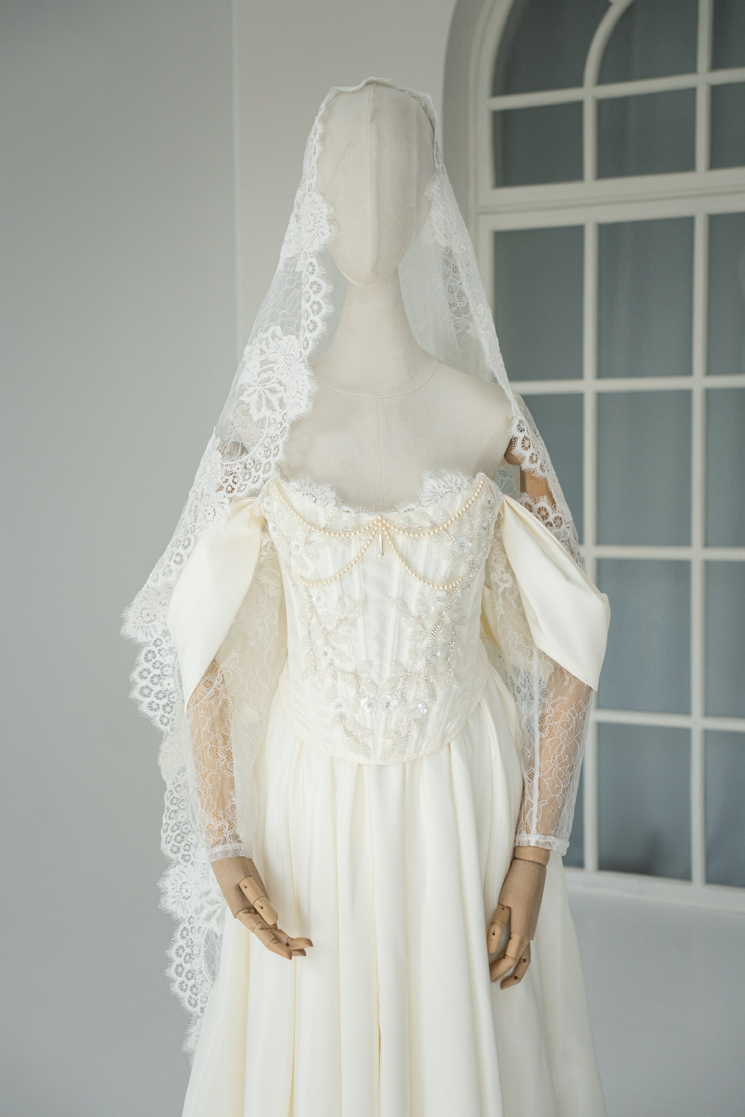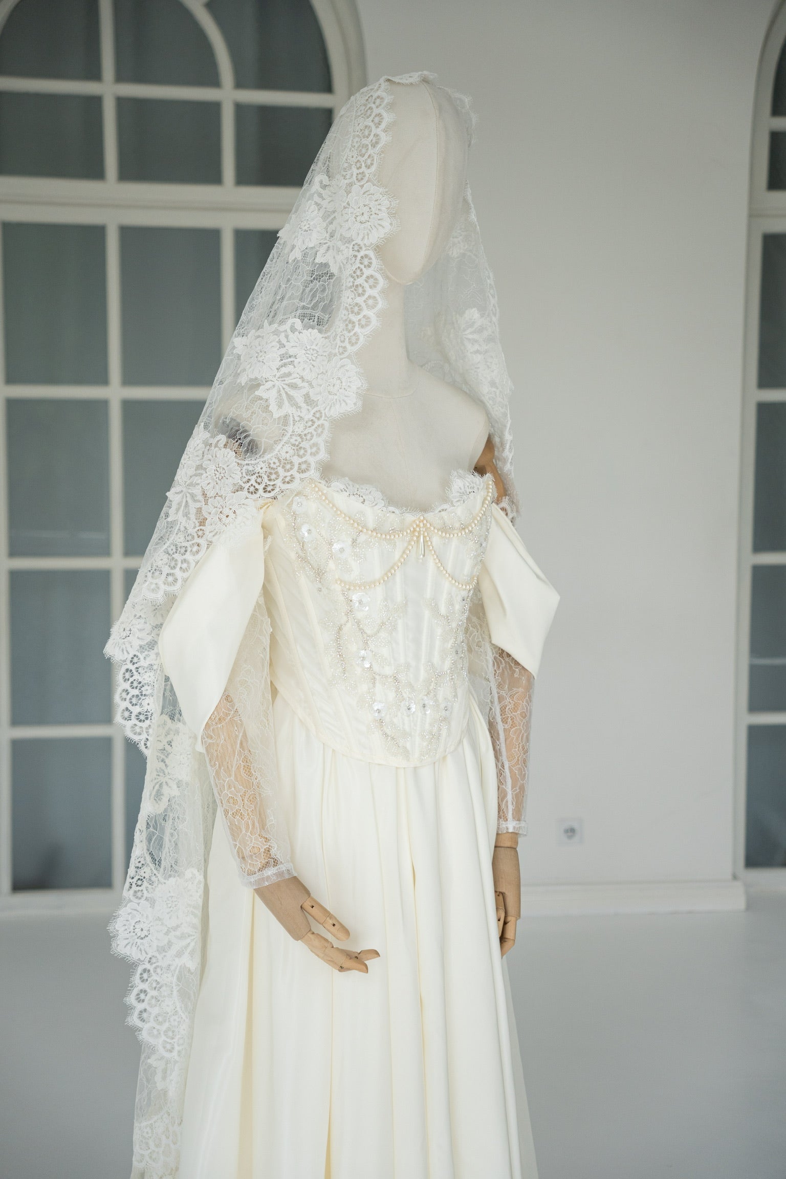 The heart of the look is an elegant wedding corset top. Its front is decorated with openwork lace inserts that create a delicate pattern. Low-set lace sleeves that fall softly give the look unmatched poetry and romance. The bodice is crowned with beadwork in the form of flowers and leaves — meticulous handiwork. On the chest are two-tiered pearl beads that mimic the natural shape of the breasts. They are joined in the center by a long teardrop-shaped pearl.