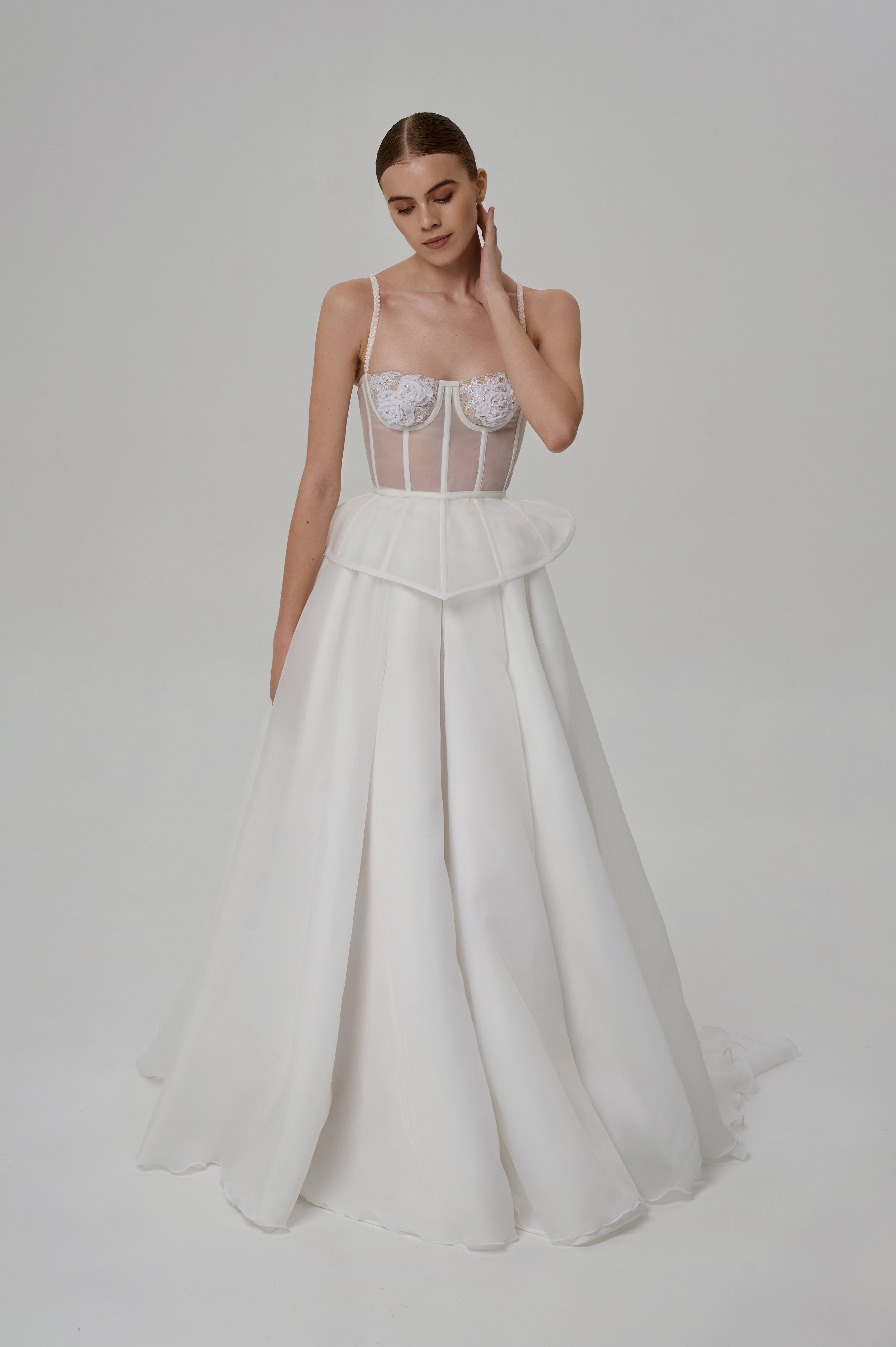 A practical wedding set with a strapless corset and a fluffy organza skirt. The wedding corset top with lacing at the back and metal boning is equipped with comfortable straps and embroidered cups that provide additional support.