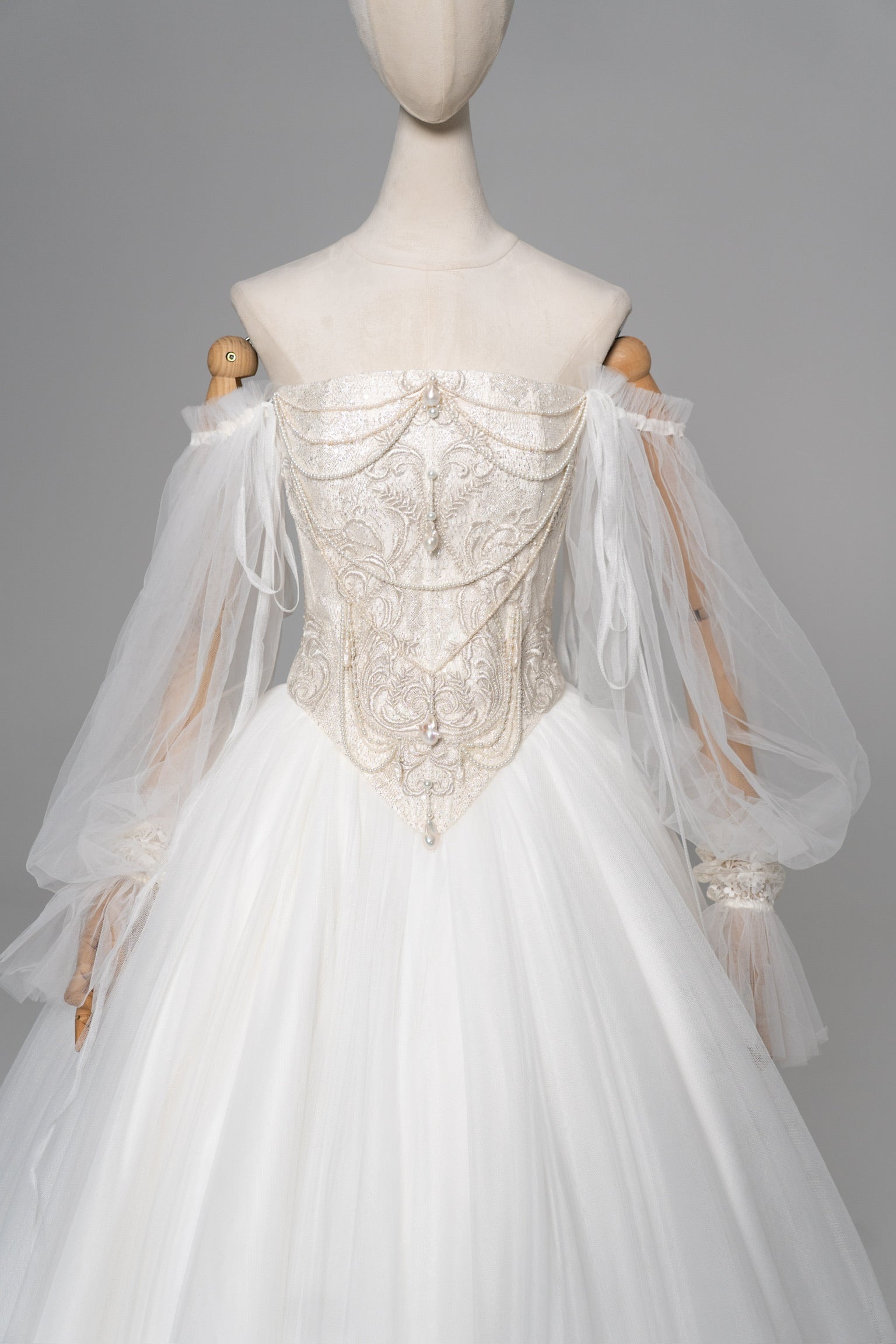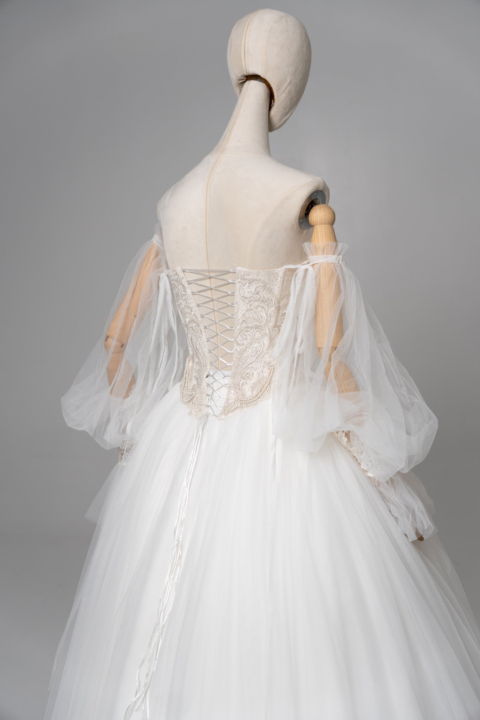 A delicate contrast of colors comes to life in this wedding ensemble. The Ivory classic corset top with a deep V-neckline is decorated with hand embroidery that shimmers with every movement. The enchanting atmosphere is complemented by removable mesh sleeves. Their cuffs, embroidered with the same delicate pattern, seem to continue the love story on your hands.