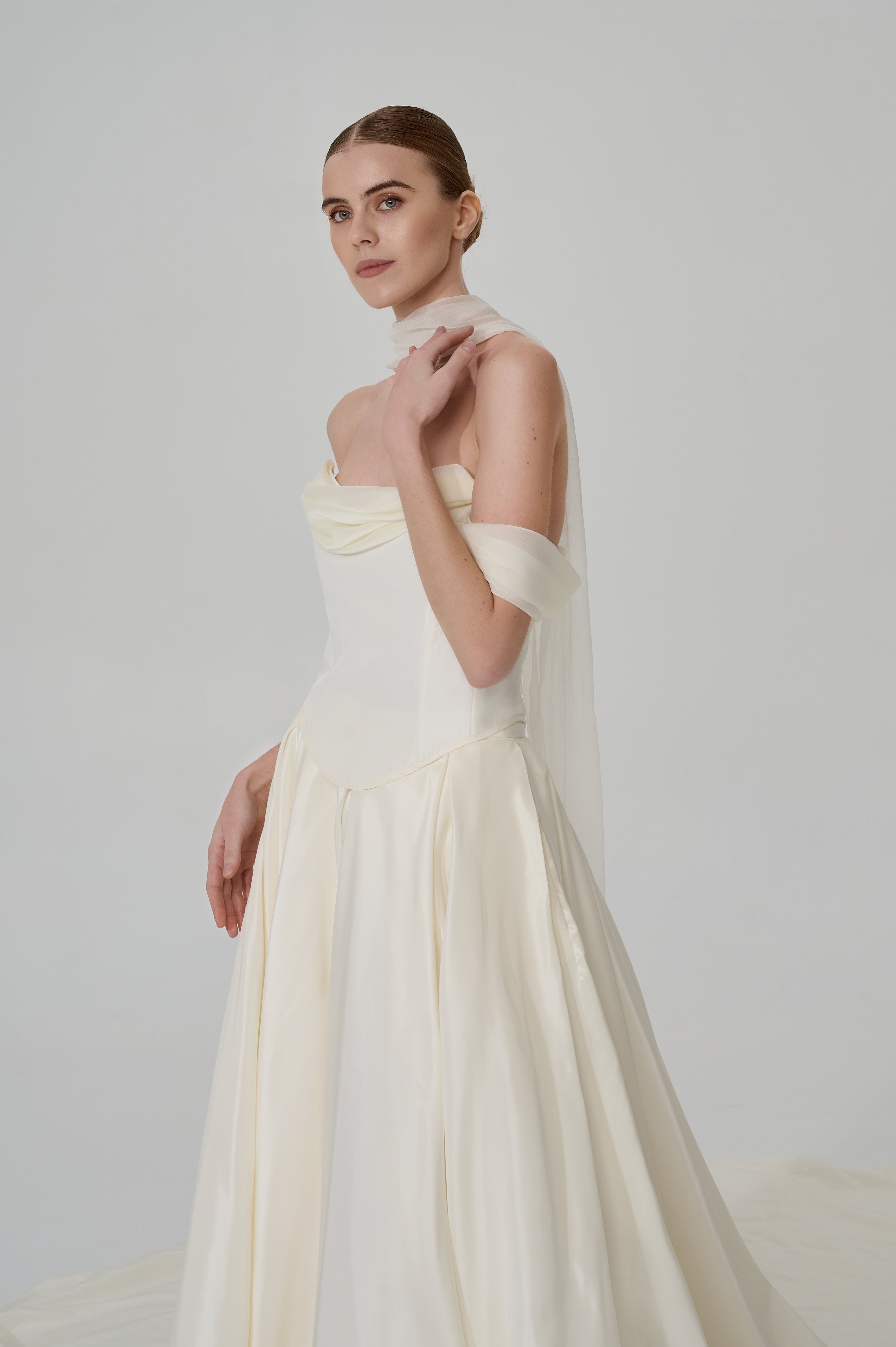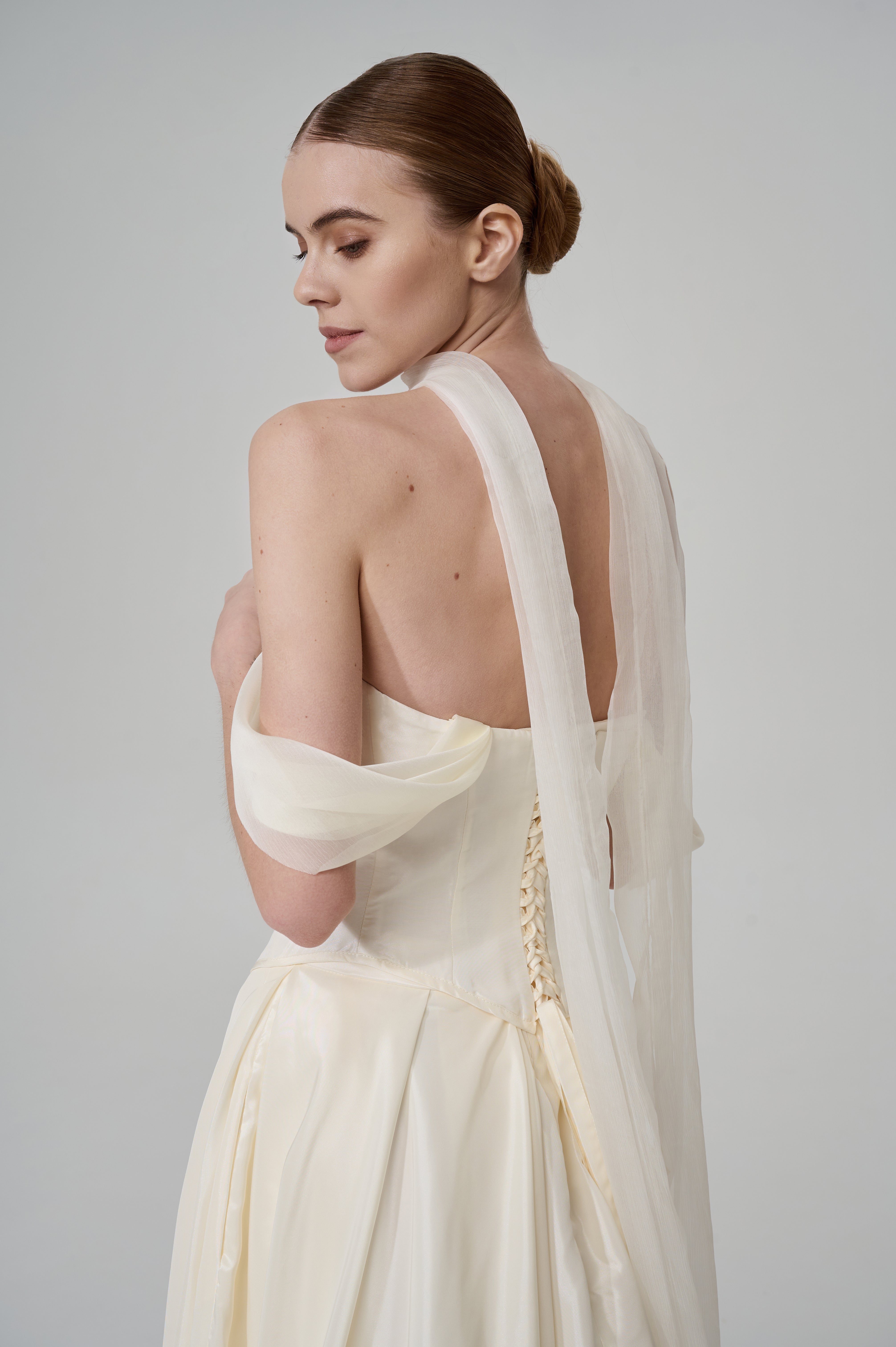 This elegant wedding set made of luxurious taffeta is the perfect combination of classic and modern wedding fashion. The classic corset top with lacing at the back ensures a perfect fit, while the romantic dropped chiffon sleeves add lightness and airiness to the look.