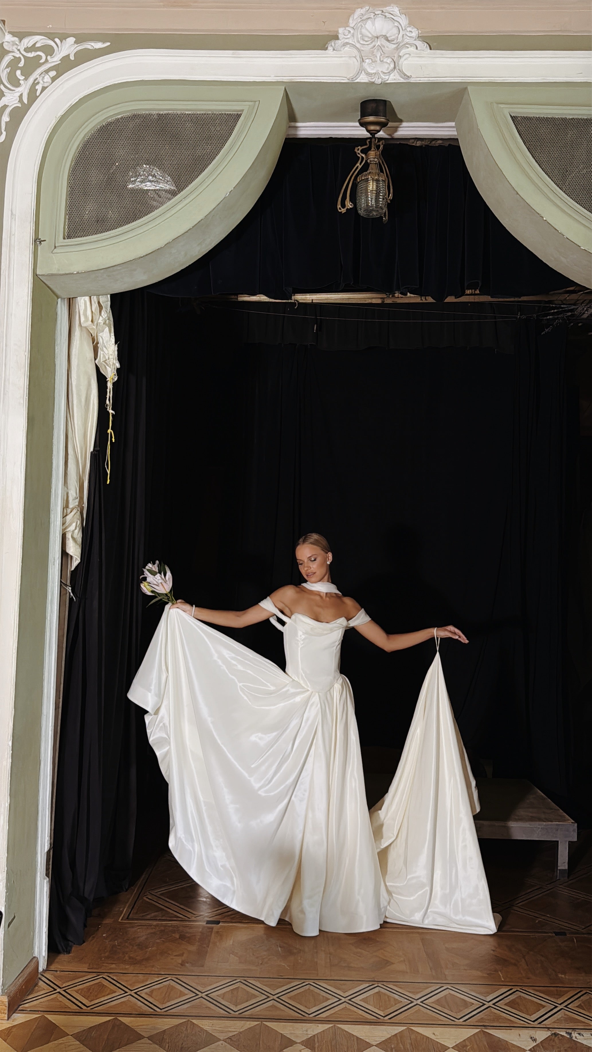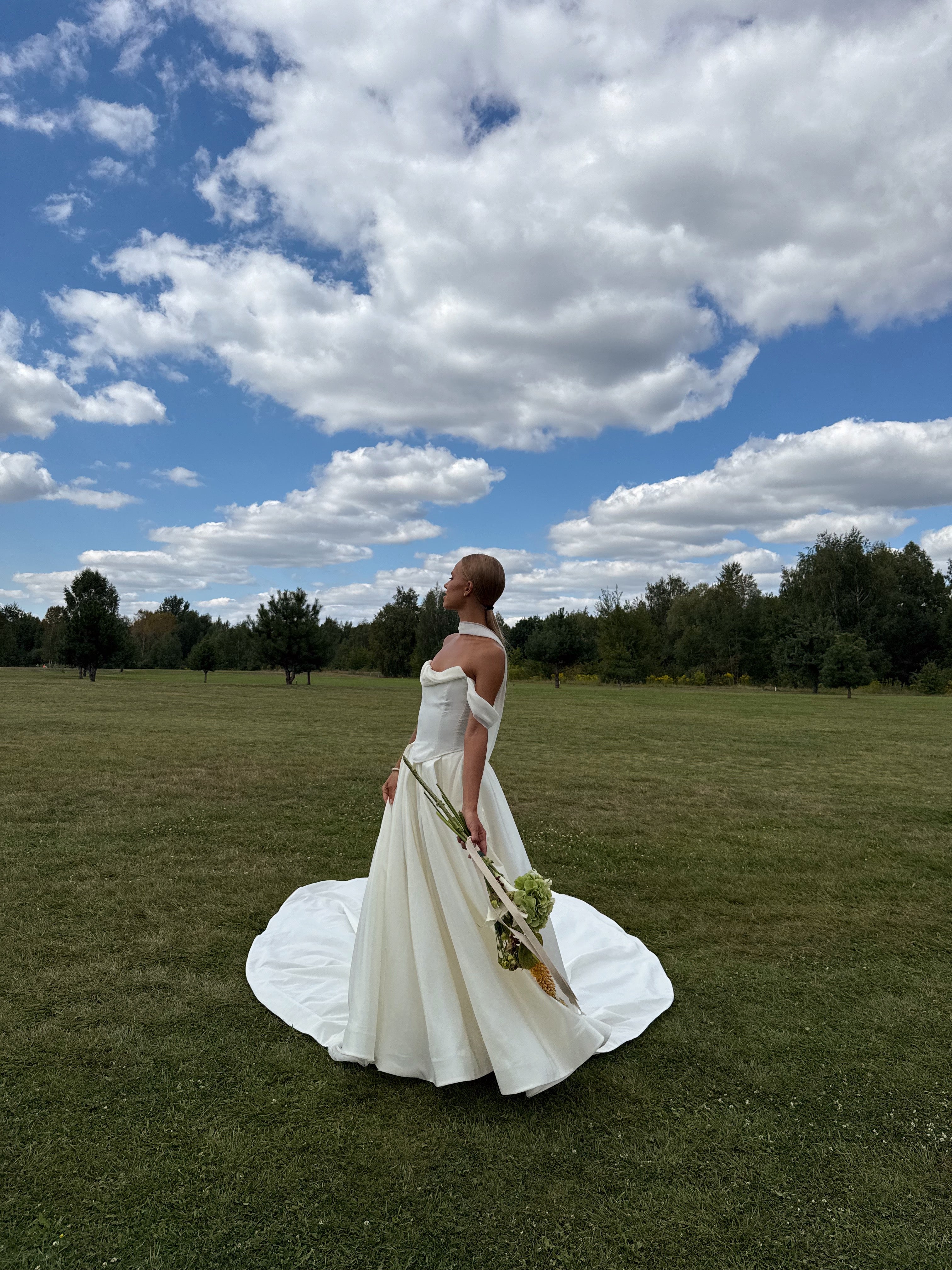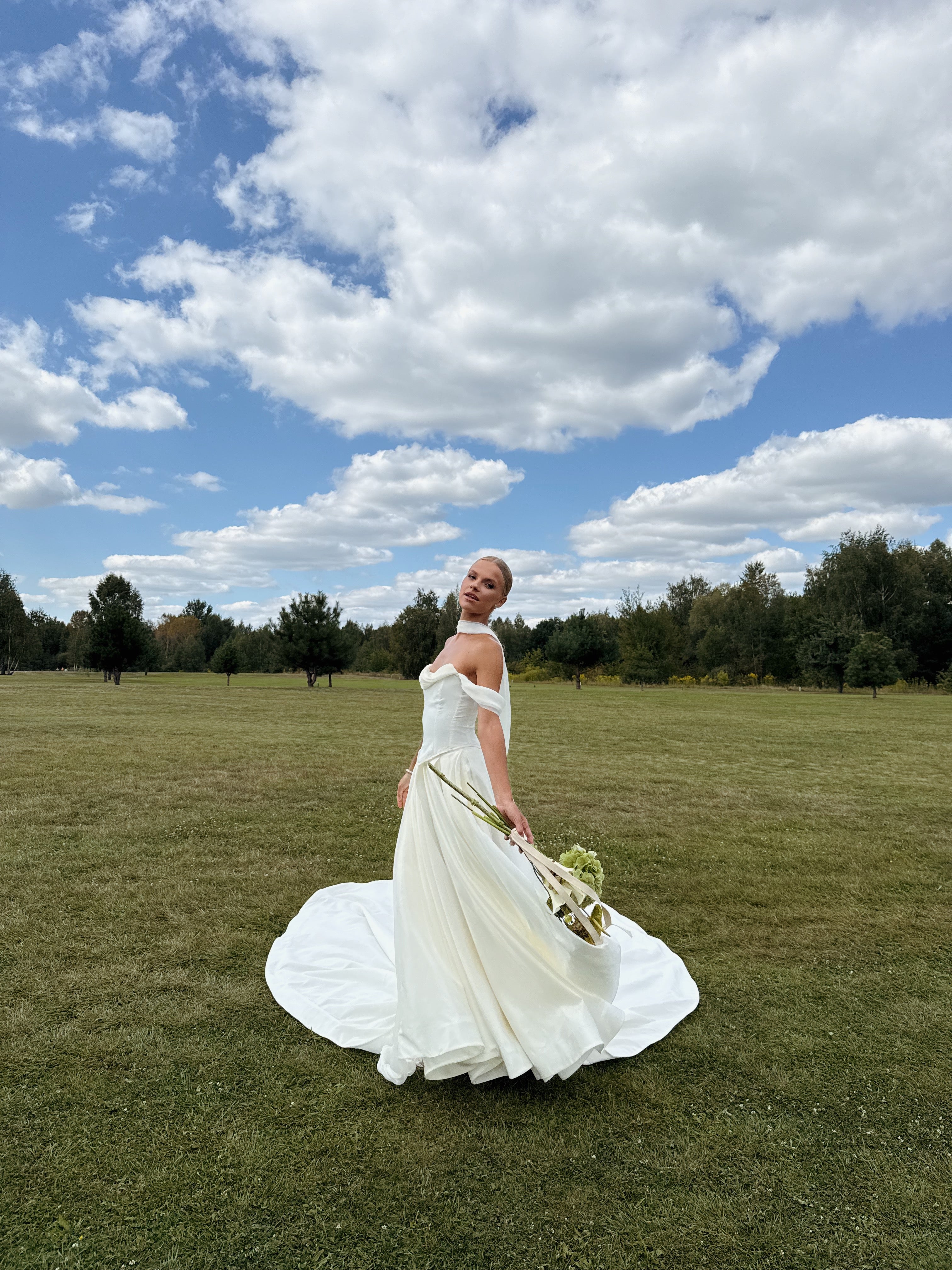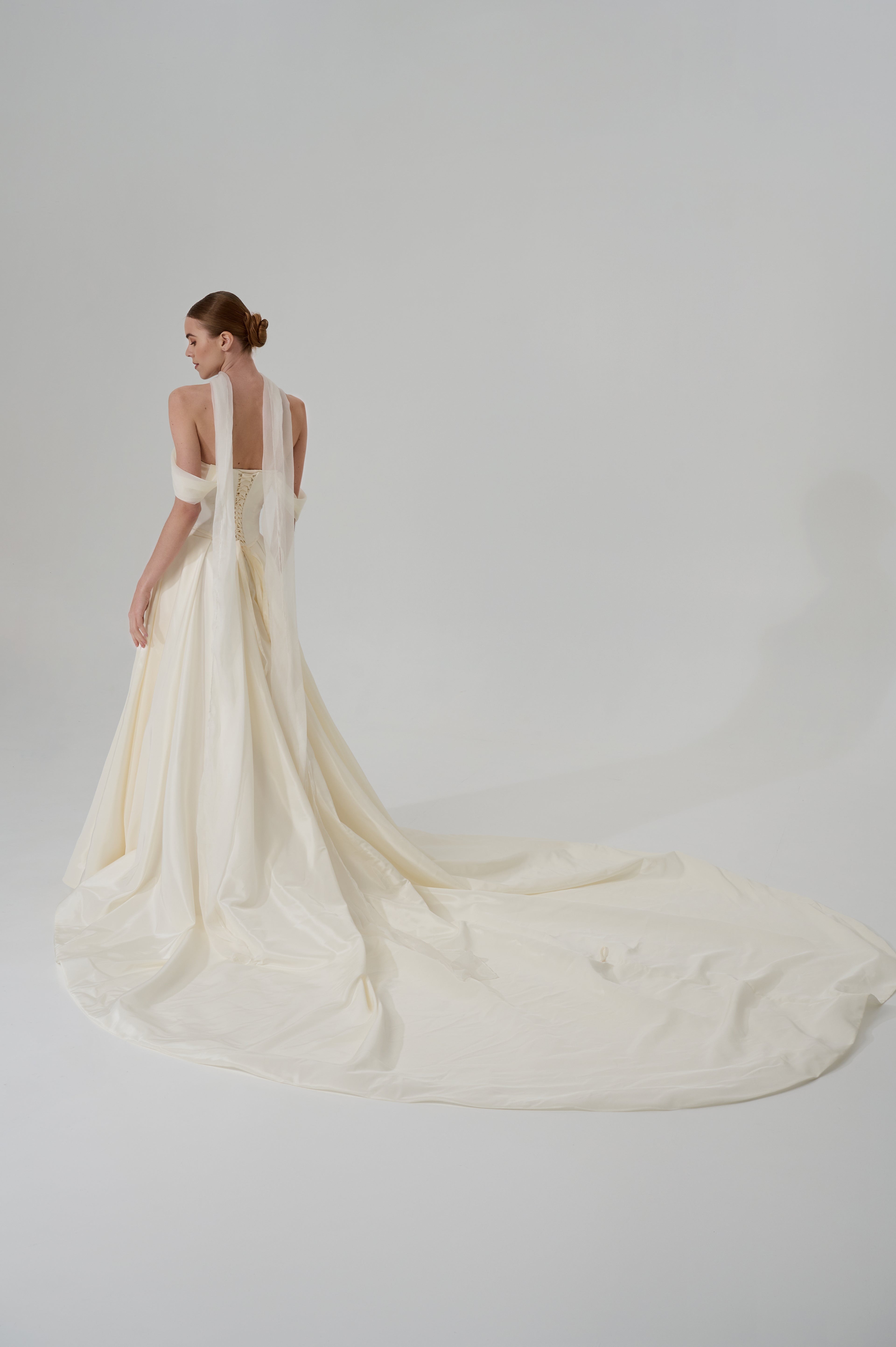 The lush A-line wedding skirt creates a stunning wedding silhouette, complemented by an elegant long train. A special feature of the skirt is a special loop for the arms, which ensures comfortable wearing of the train during the ceremony and celebration. This taffeta wedding dress looks royally rich thanks to the material's ability to hold its shape.