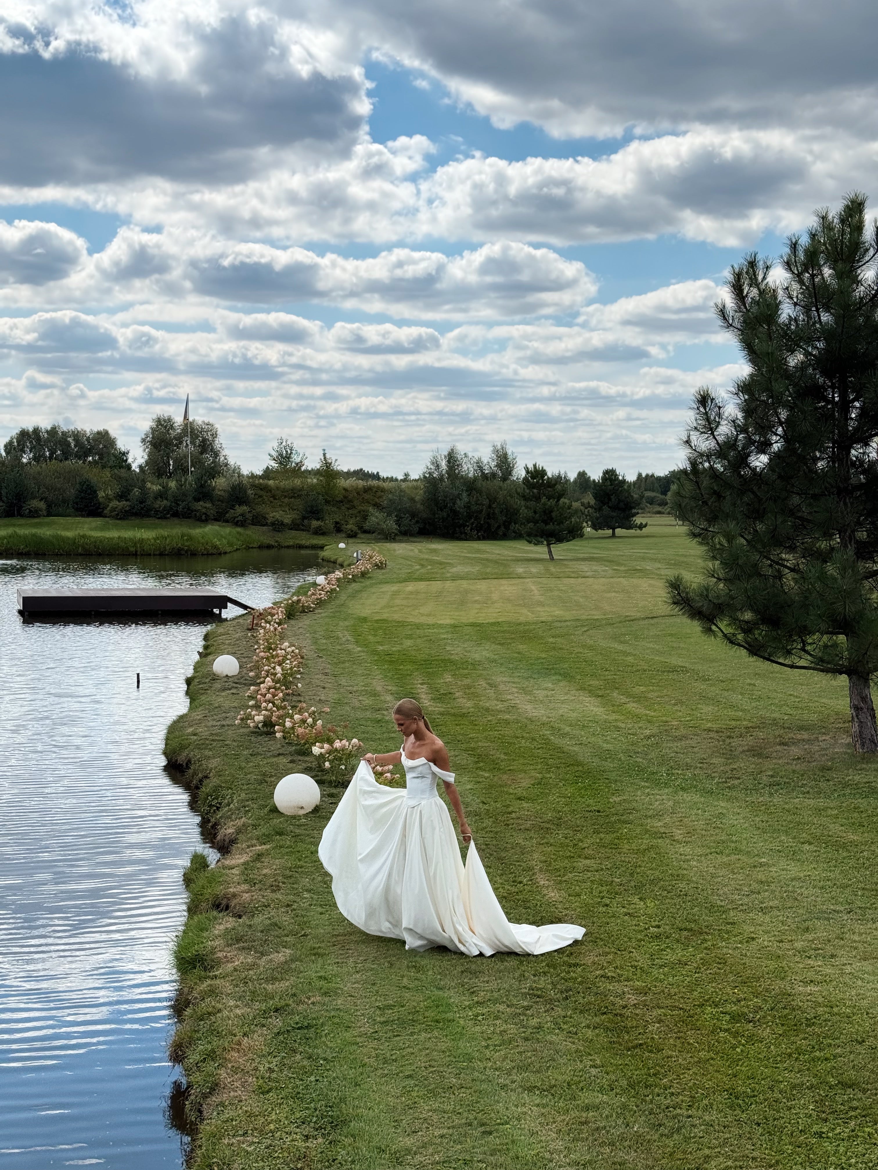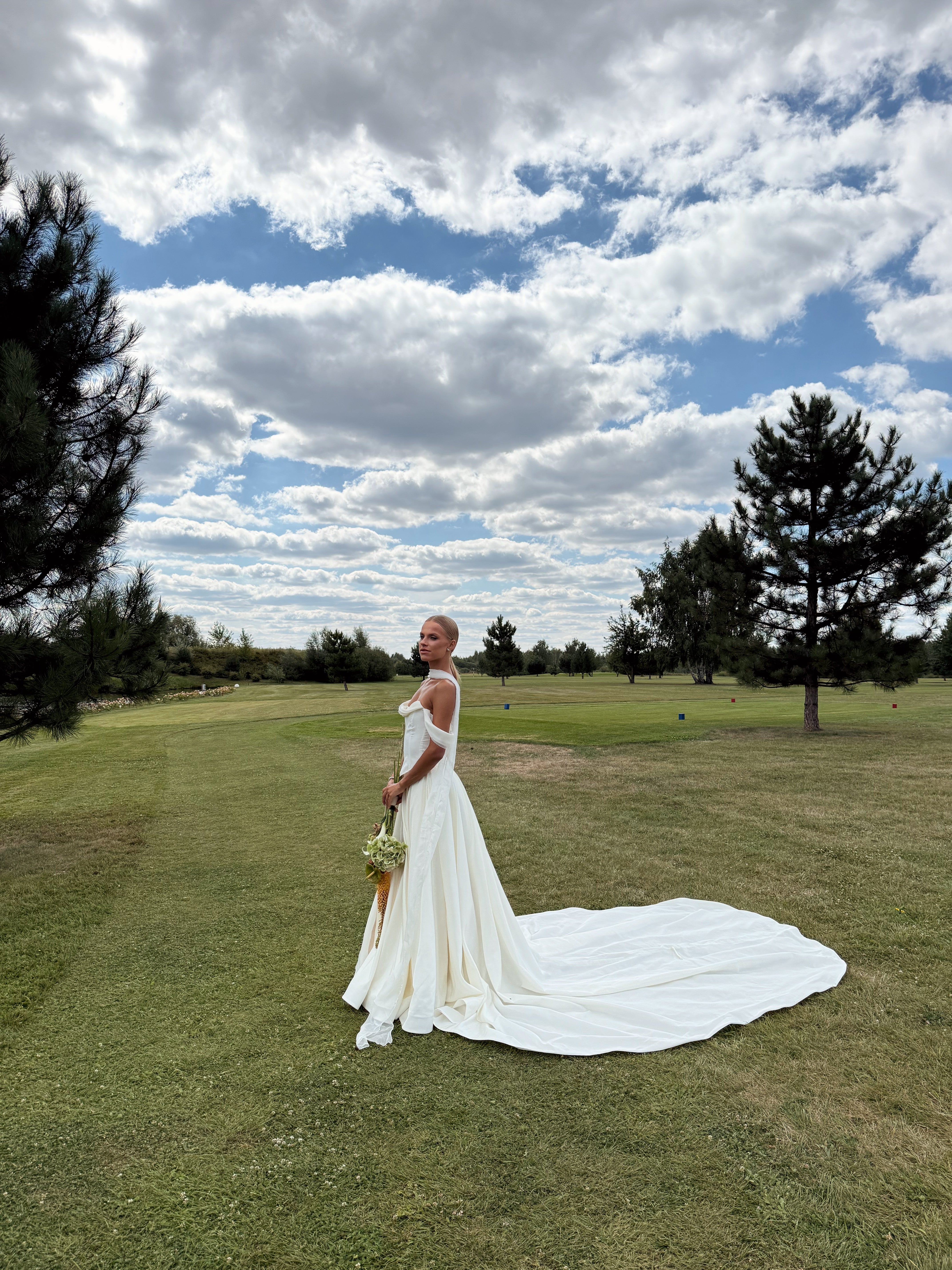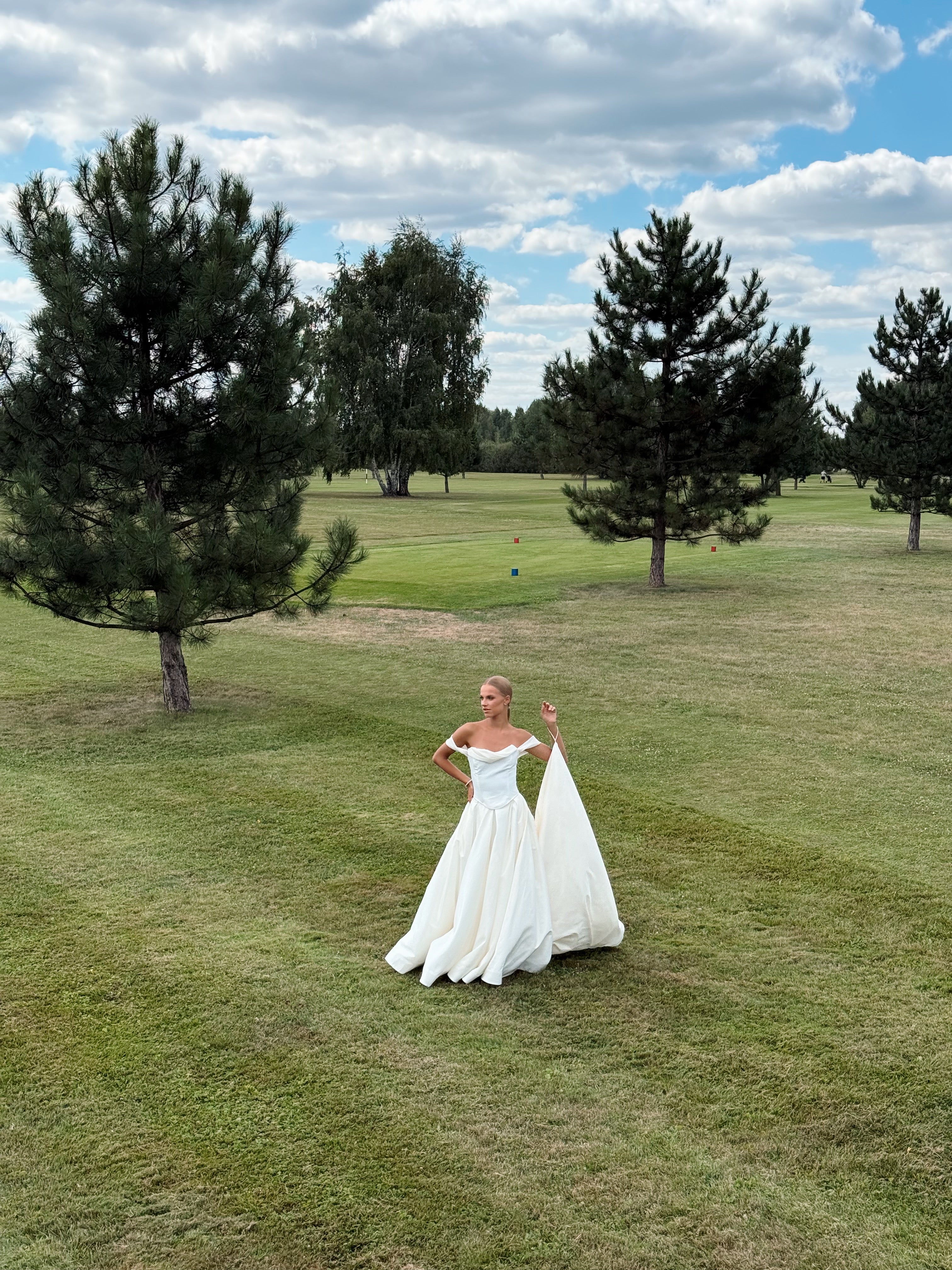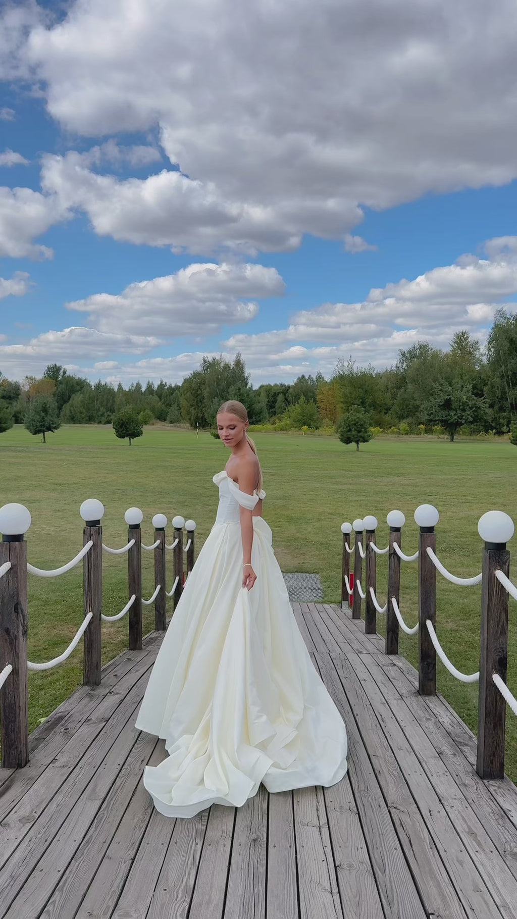The lush A-line wedding skirt creates a stunning wedding silhouette, complemented by an elegant long train. A special feature of the skirt is a special loop for the arms, which ensures comfortable wearing of the train during the ceremony and celebration. This taffeta wedding dress looks royally rich thanks to the material's ability to hold its shape.