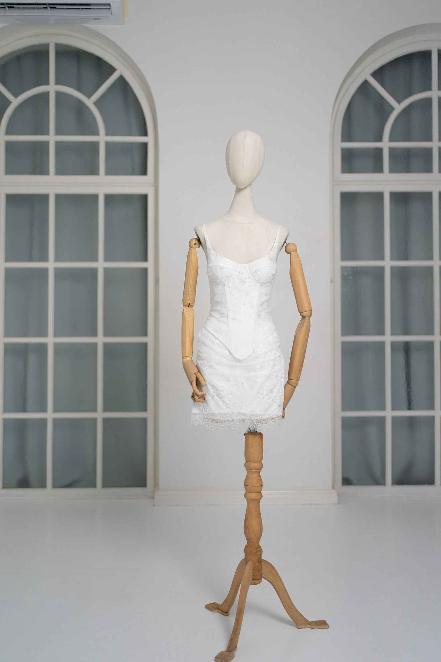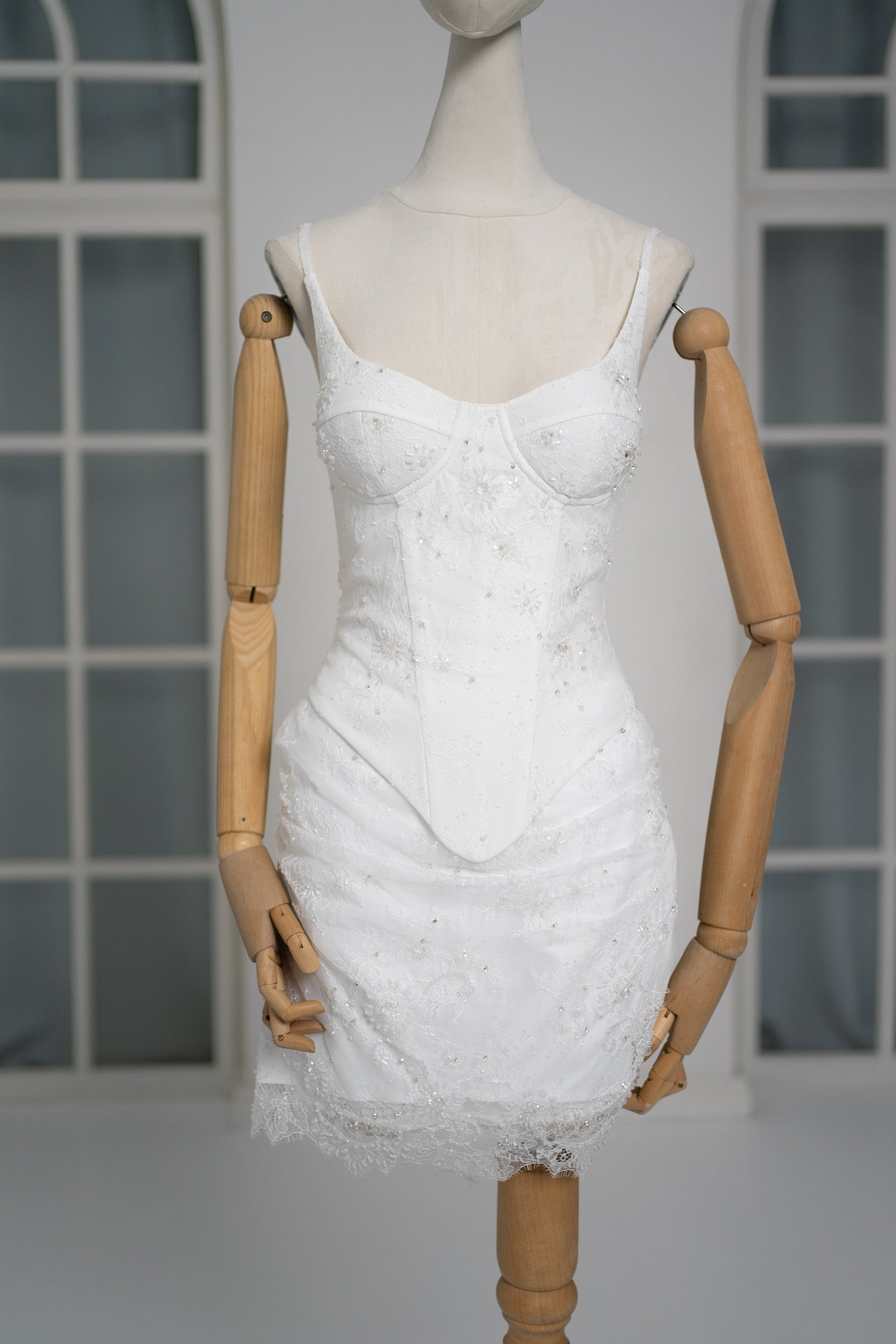 A luxurious lace mini dress with a corset base and hand-finished pearls, creating a festive and refined silhouette