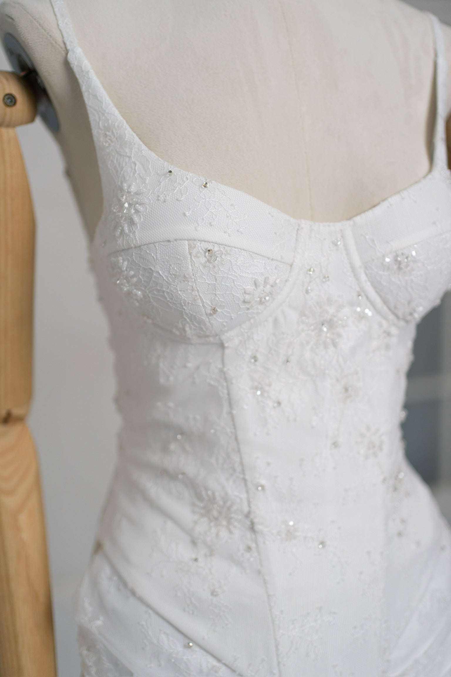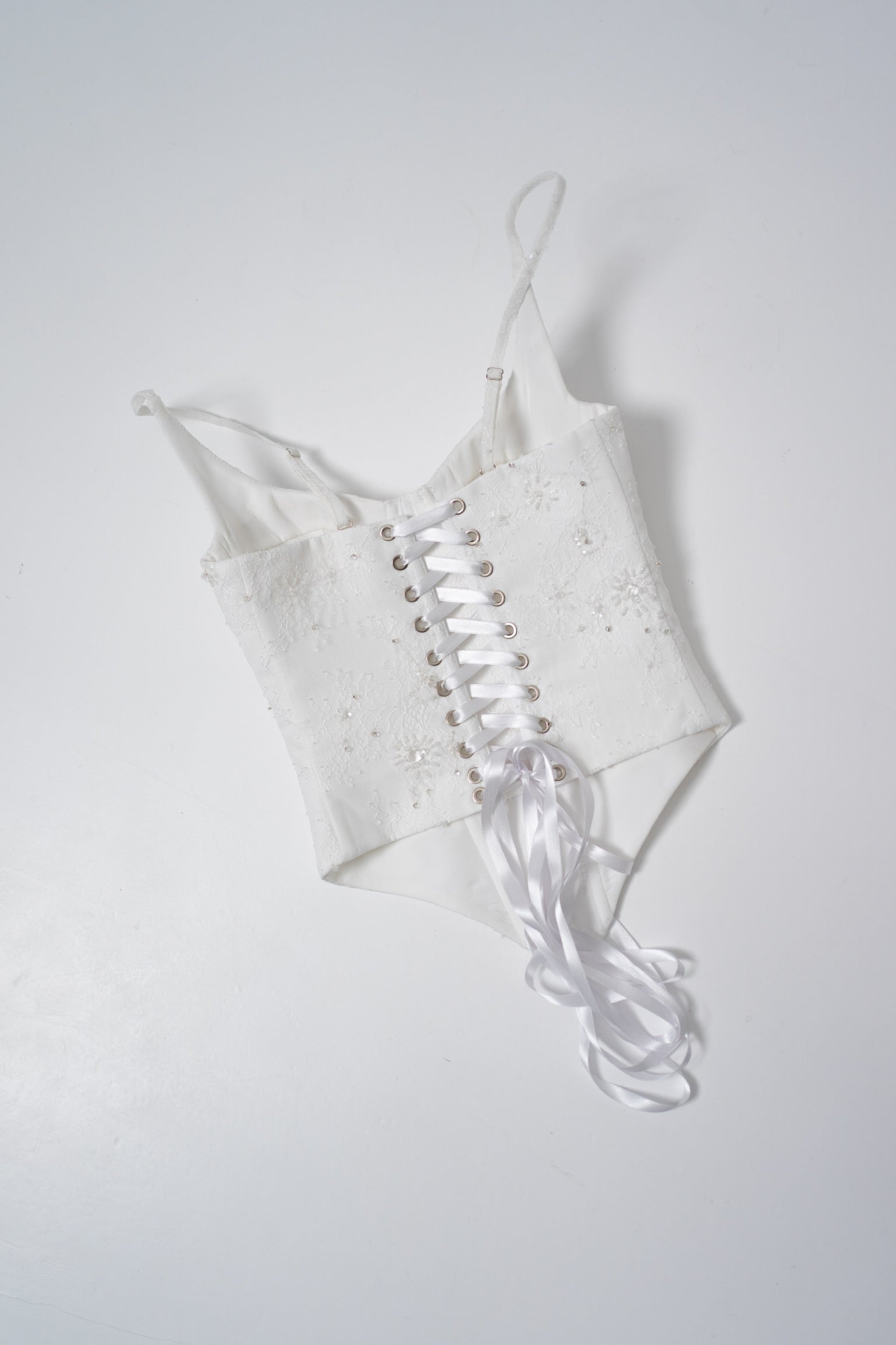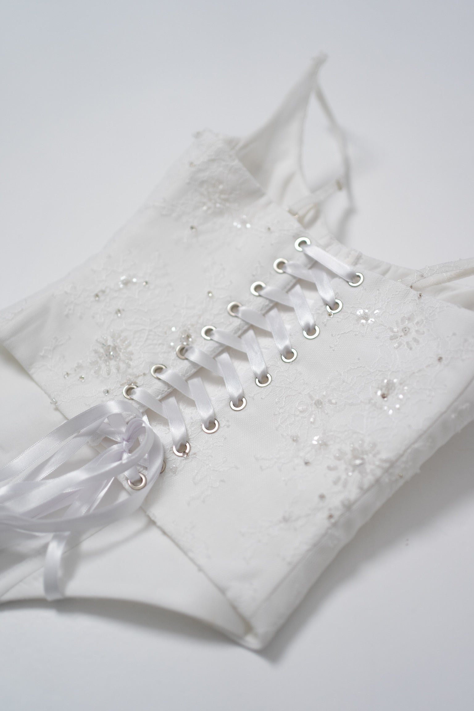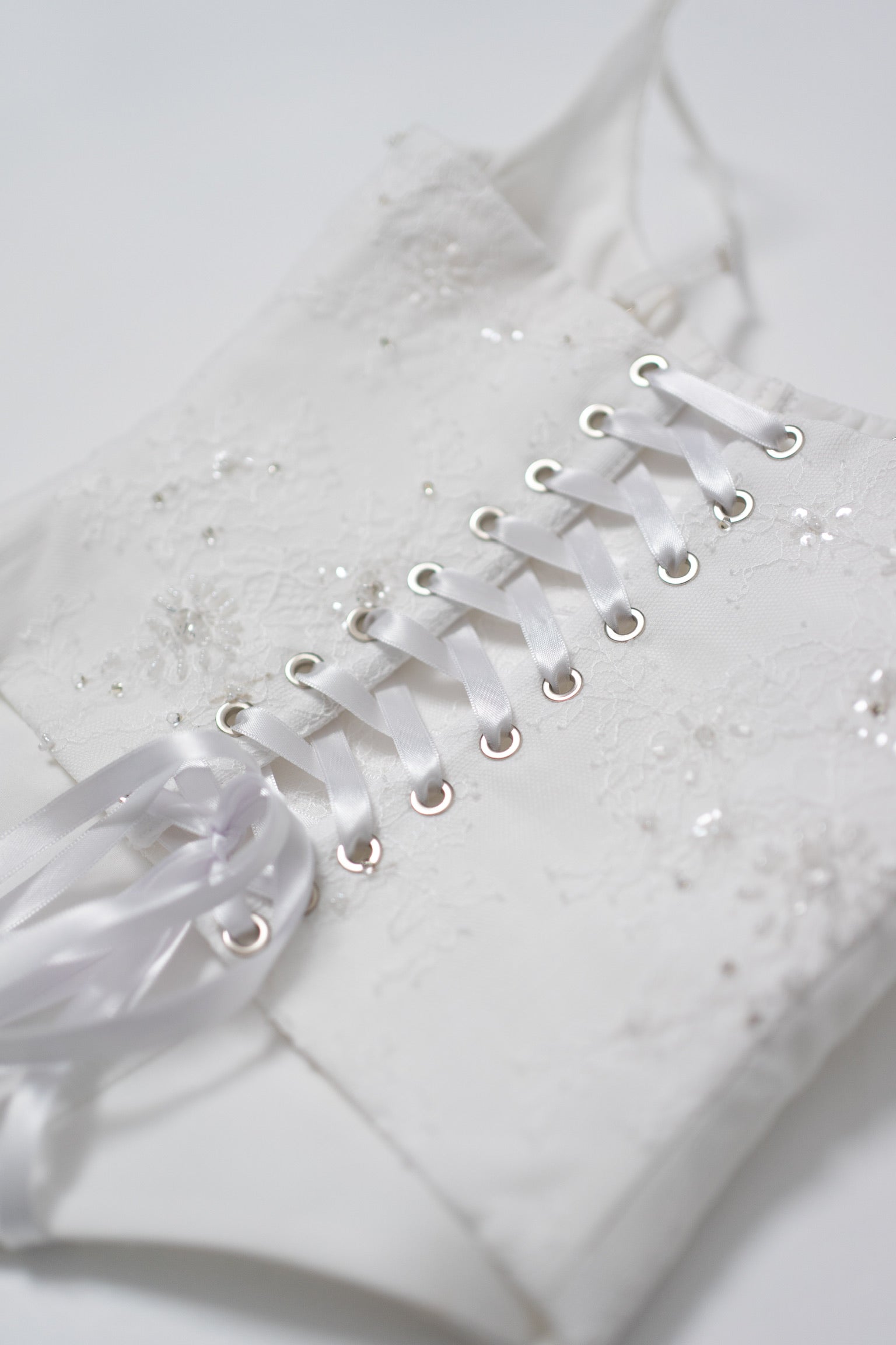 The lacing on the back deserves special attention. It is made of smooth white ribbon that passes through metal eyelets and allows you to adjust the circumference, ensuring comfort and a perfect fit. Thanks to the modular design, the dress can be combined with a fluffy skirt, a long veil, or a cape to create a modified look.