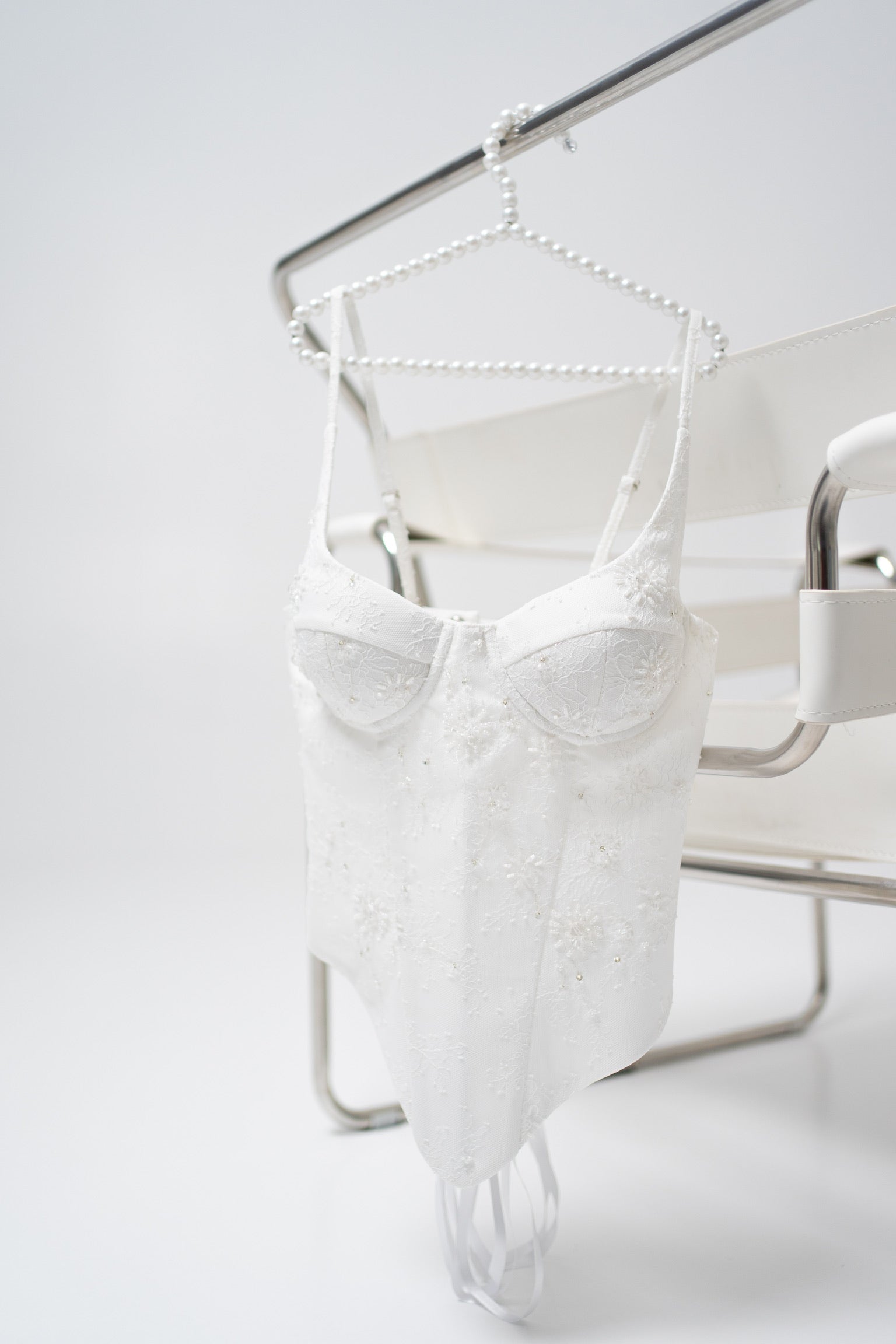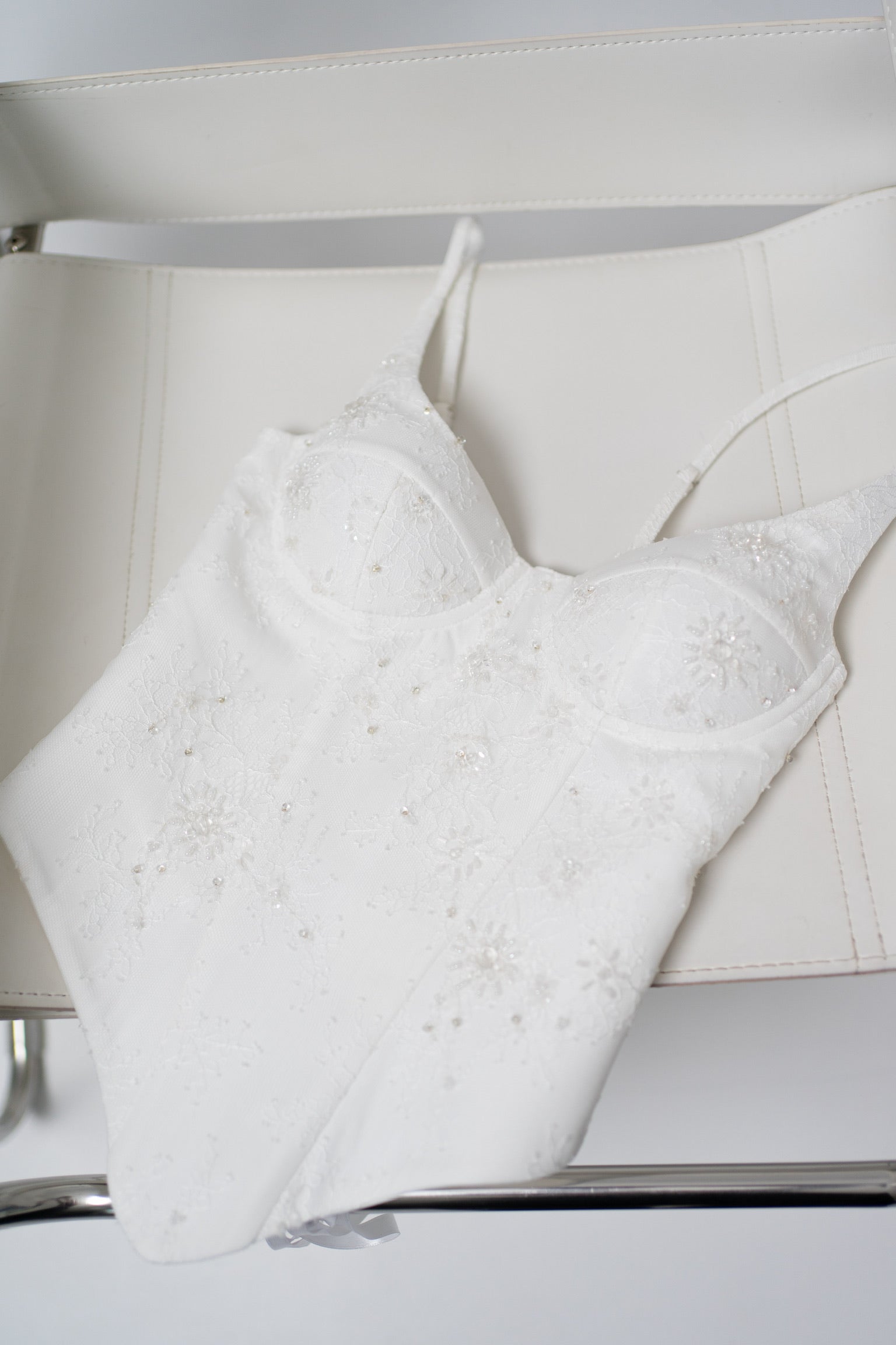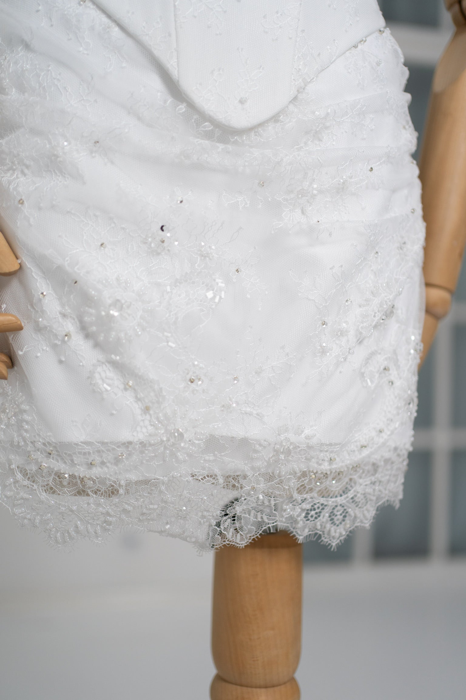 In the center of the wedding corset top is a distinctive elongated insert that visually elongates the body and creates a more defined waist. The side lines are designed to correct the silhouette and provide a snug but comfortable fit. The mini-length skirt echoes the texture of the top: a layer of lace is superimposed on a dense base and drapes softly, emphasizing the natural lines of the hips. The hem is finished with scallops, adding a delicate romanticism and a subtle flounce at the bottom.