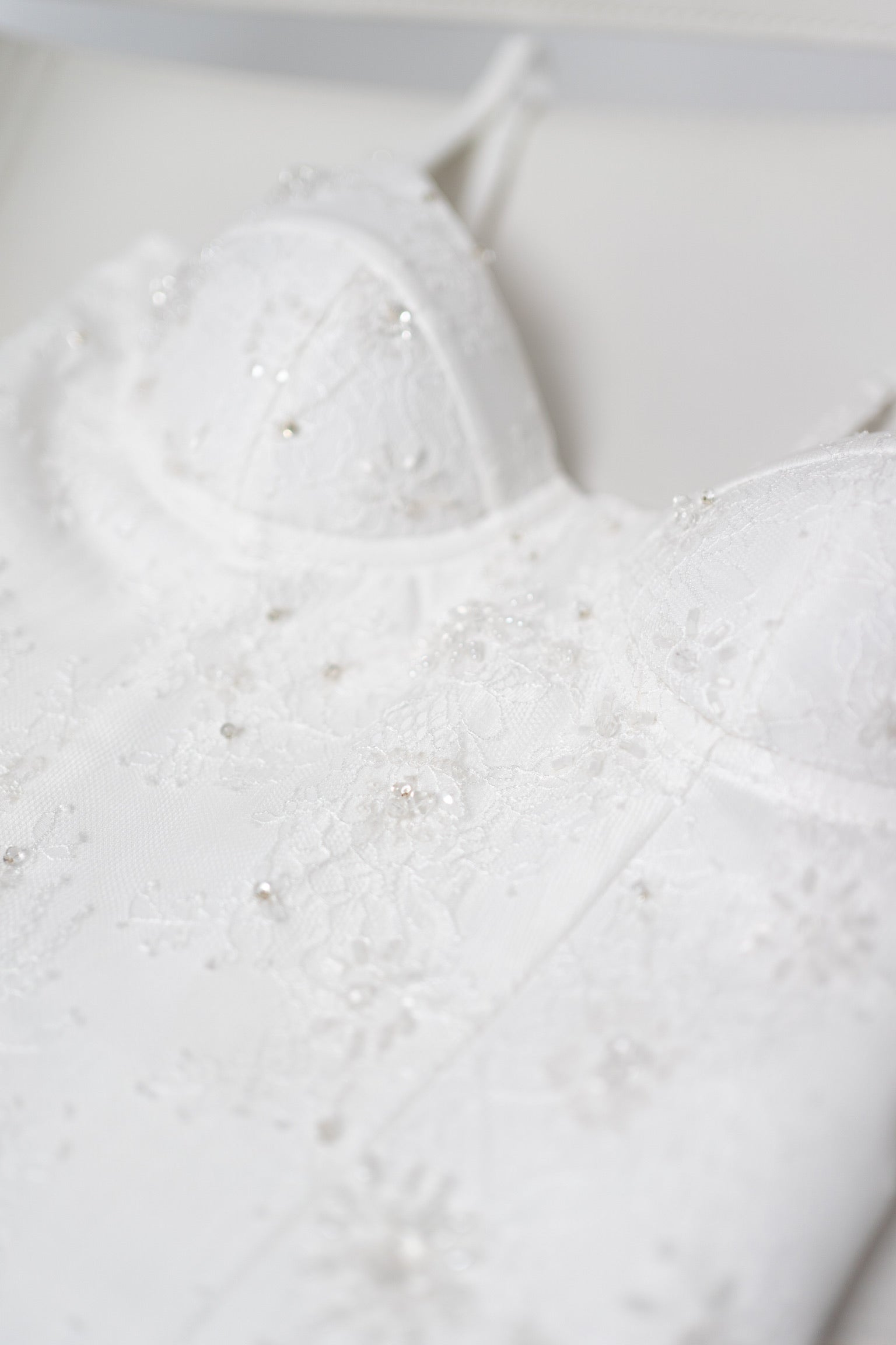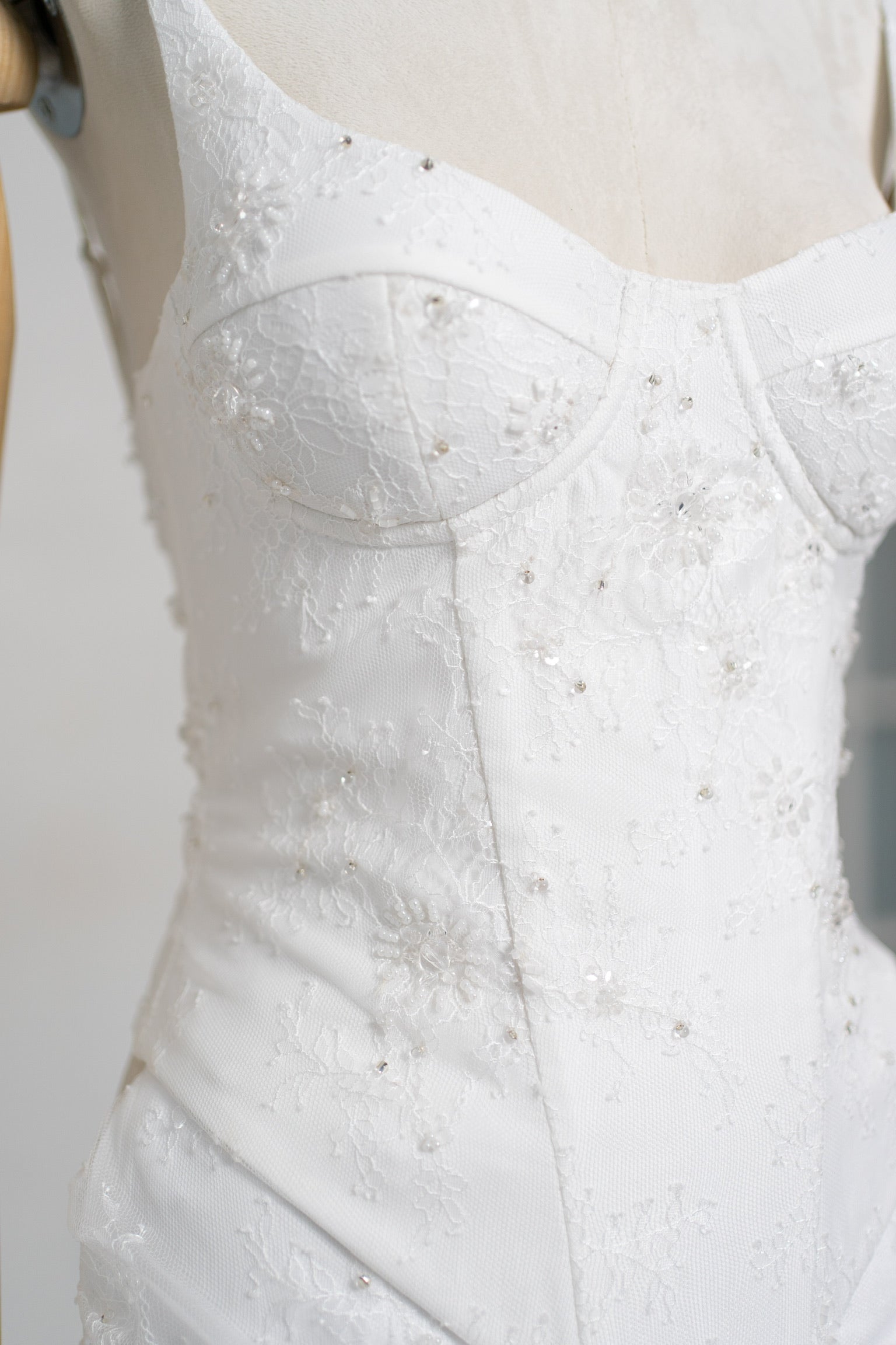 This wedding dress combines a classic corset cut with intricate lace work, making it the perfect choice for a wedding ceremony, civil ceremony, or evening reception. The top of the dress is designed as a structured classic corset top with softly contoured cups that provide stable support and visually lift the bust. The entire corset is covered with delicate lace with a floral pattern, and individual pearls and micro sequins are placed on top — they catch the light, creating a soft shimmer without excessive sparkle.