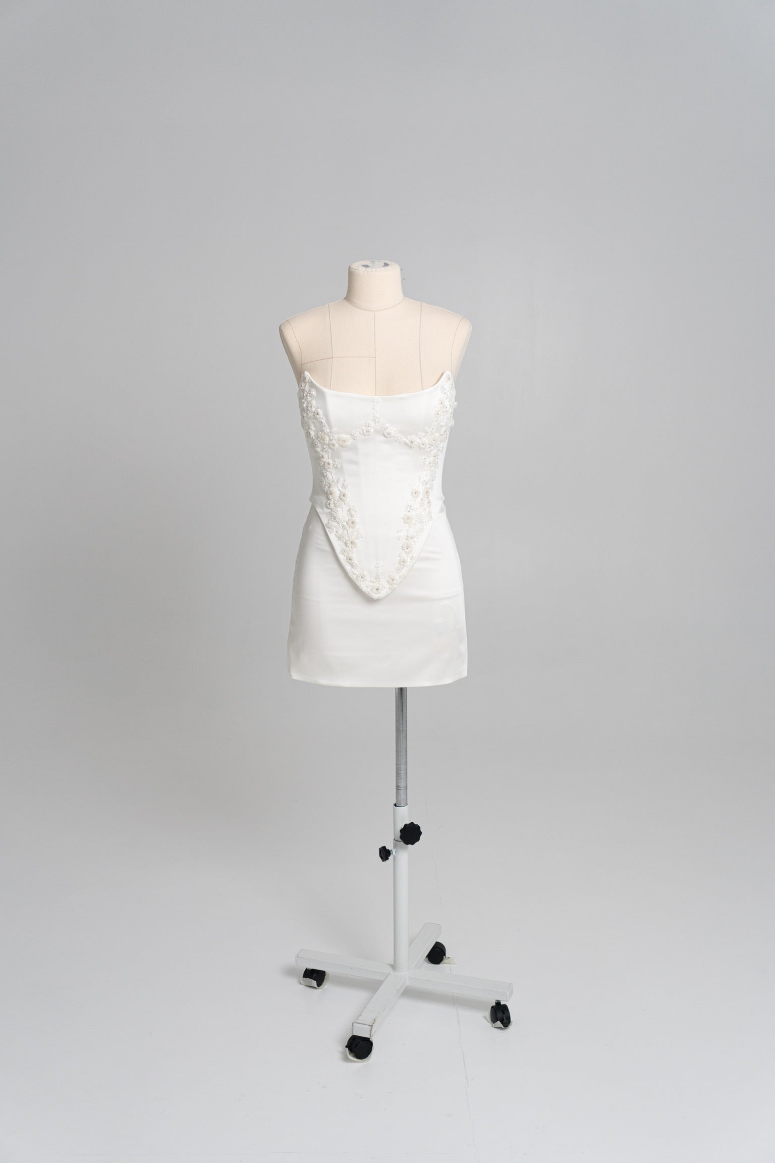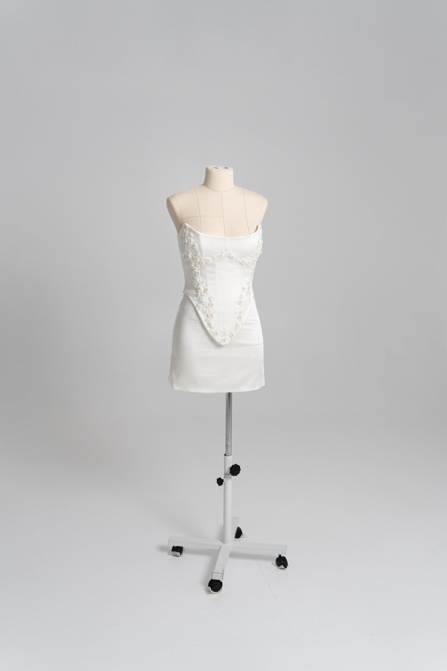 The short taffeta wedding skirt contrasts with the elongated corset, creating a playful yet sophisticated look. The perfect choice for a wedding banquet, photo shoot, or wedding party — for a bride who is not afraid to emphasize her individuality.