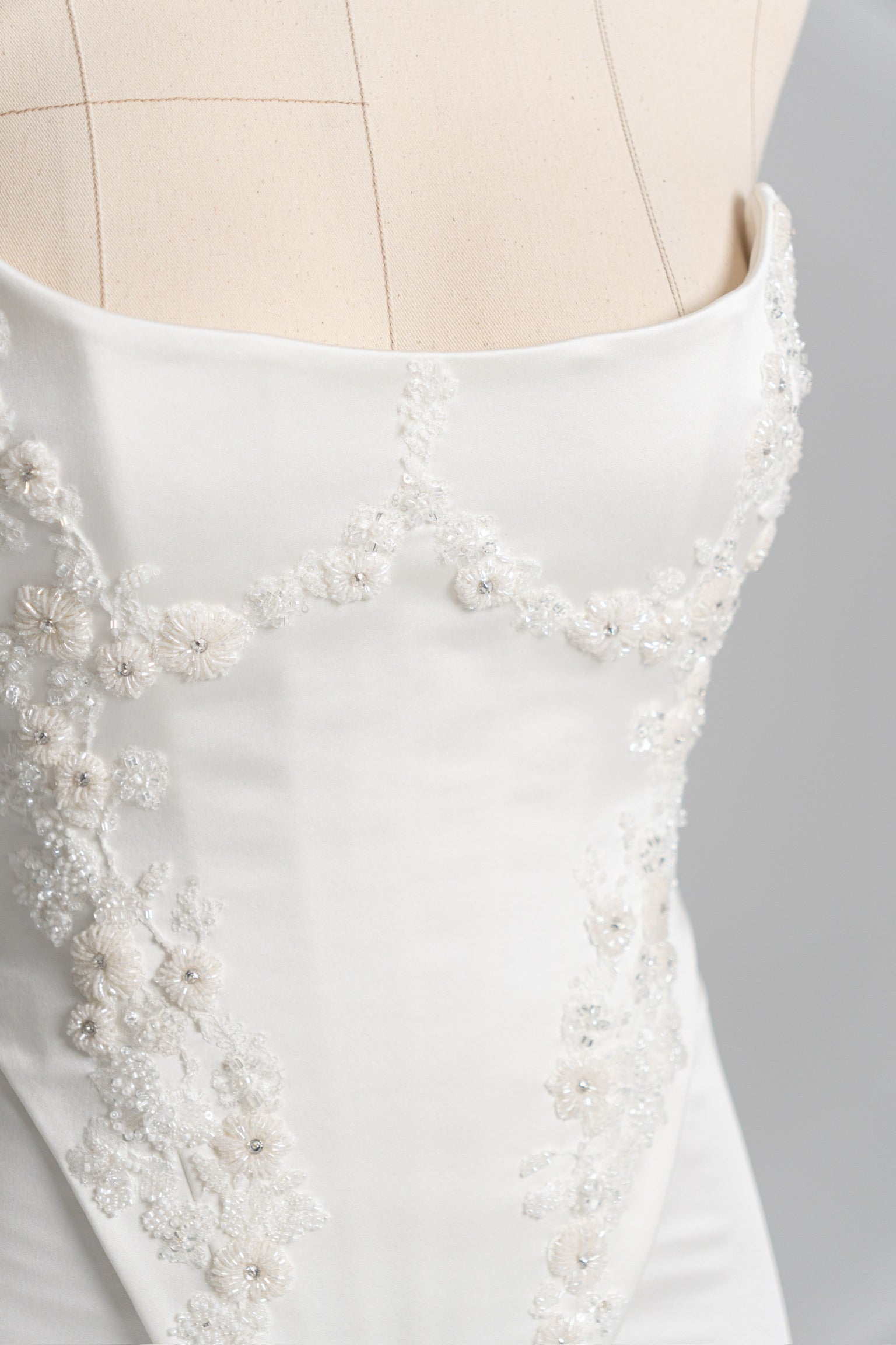 A bold and elegant look for the modern bride. The unique satin corset top with an elongated oval line at the front and back gracefully emphasizes the silhouette. It is decorated with exquisite embroidery — small flowers made with threads of glittering beads inside, as if blooming on the fabric. The embroidery neatly follows the lines of the chest, emphasizing femininity.