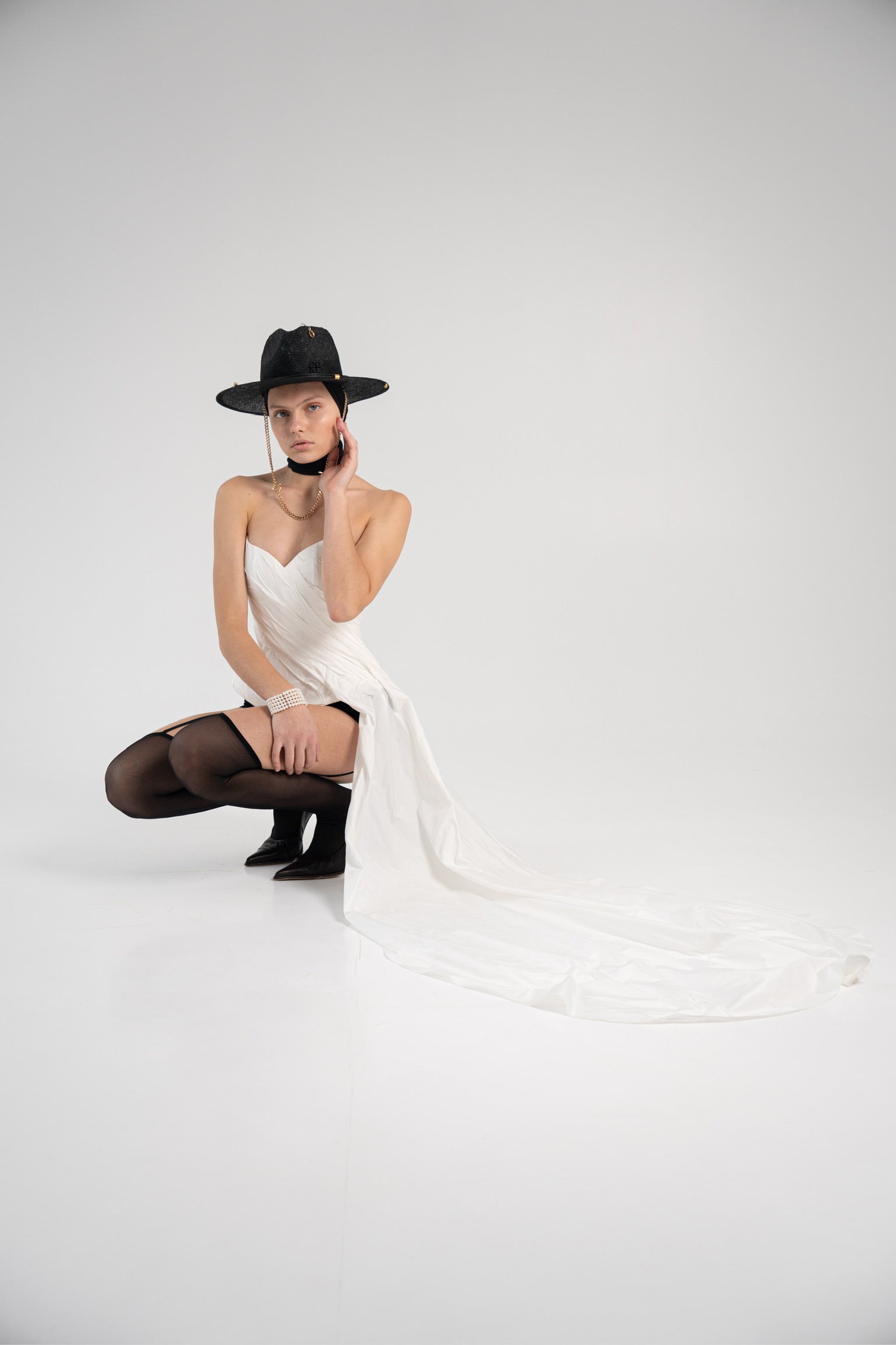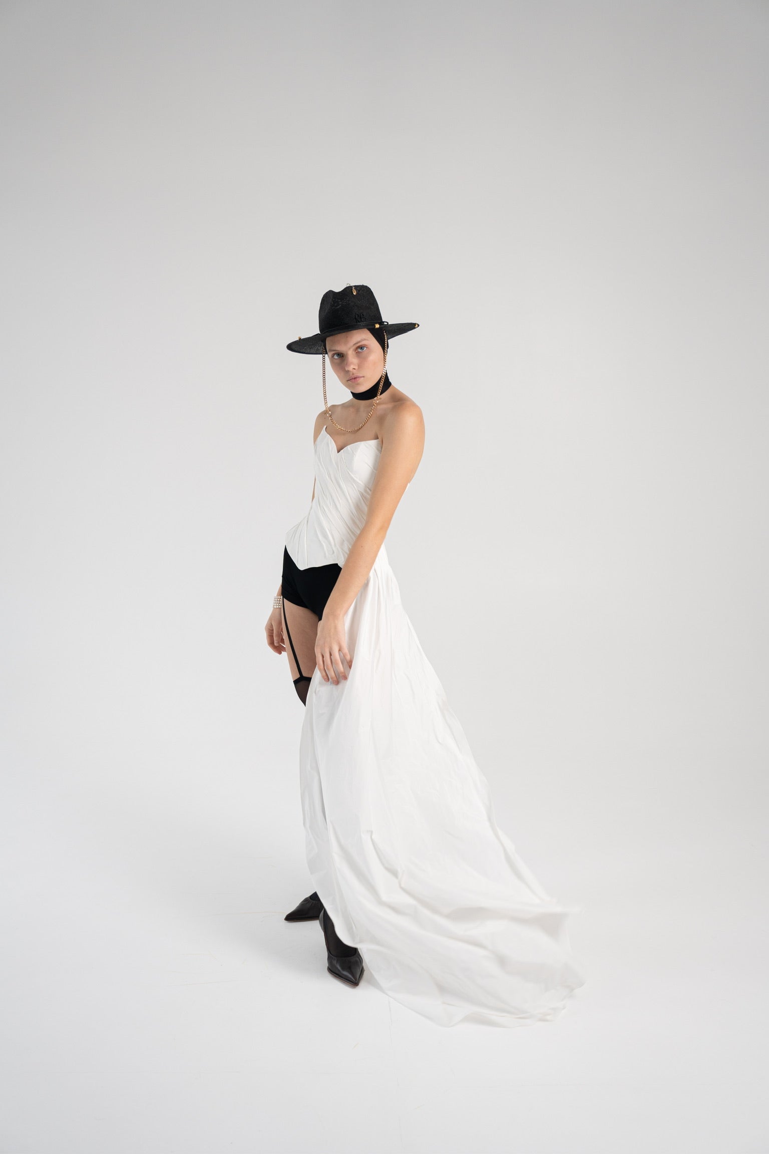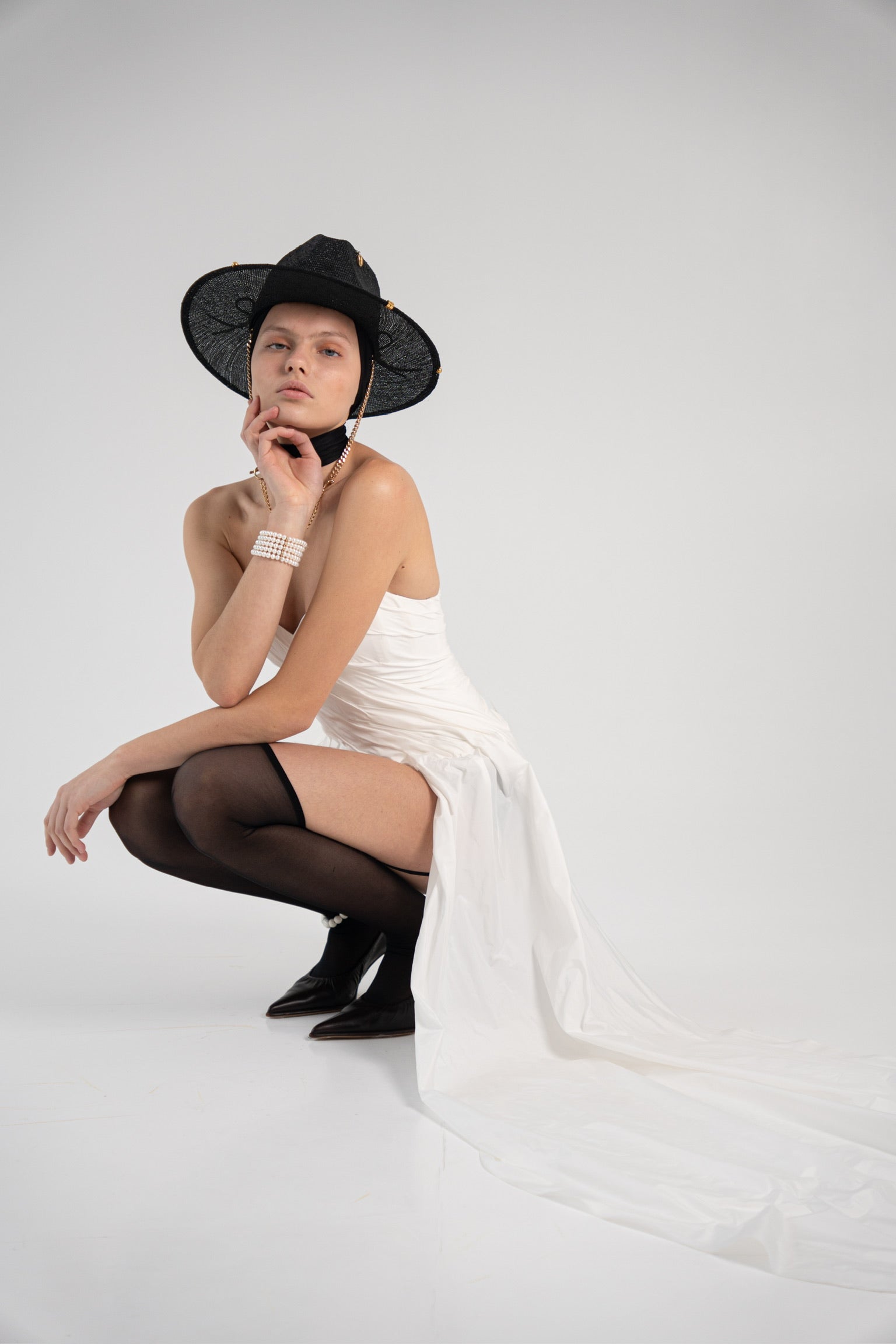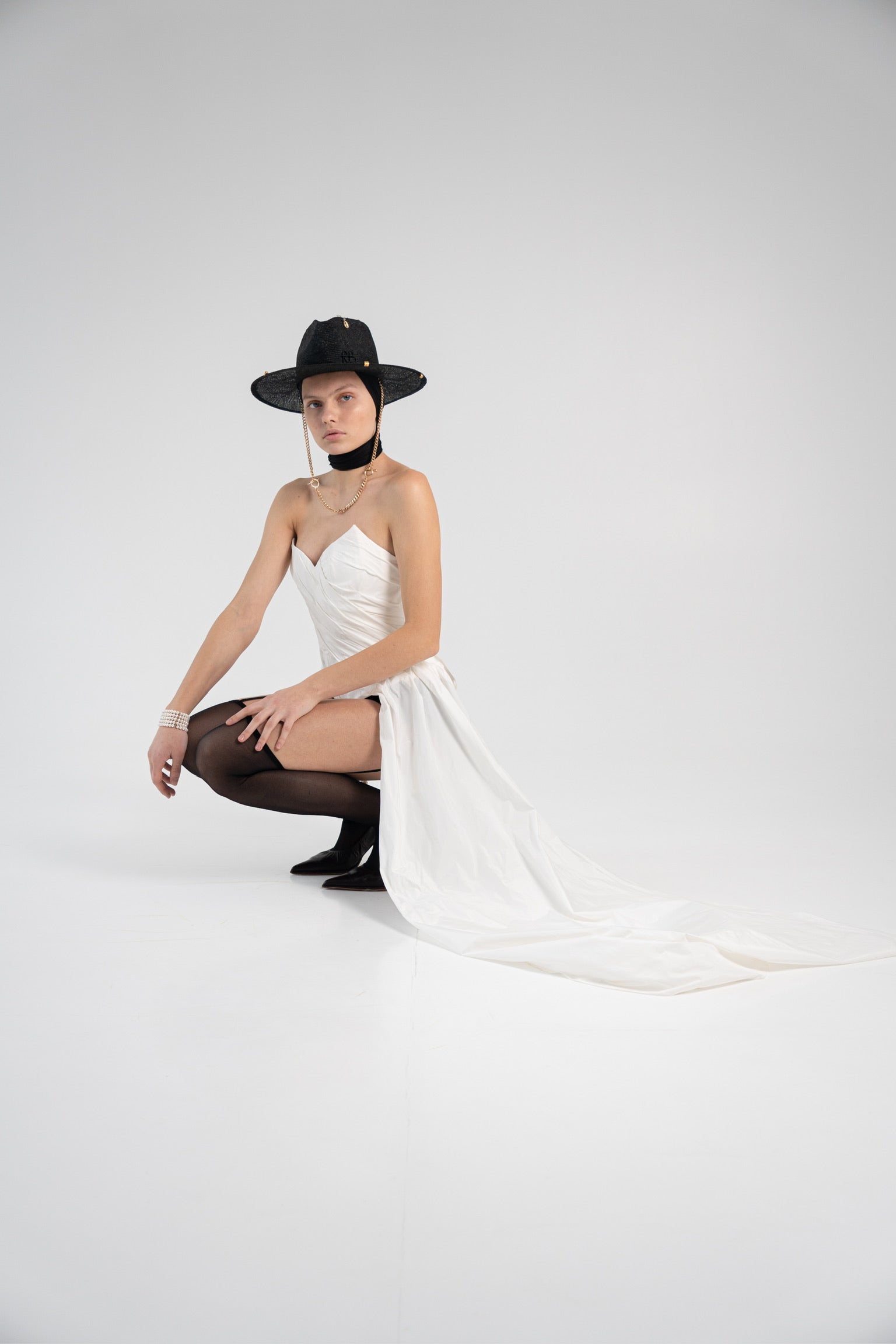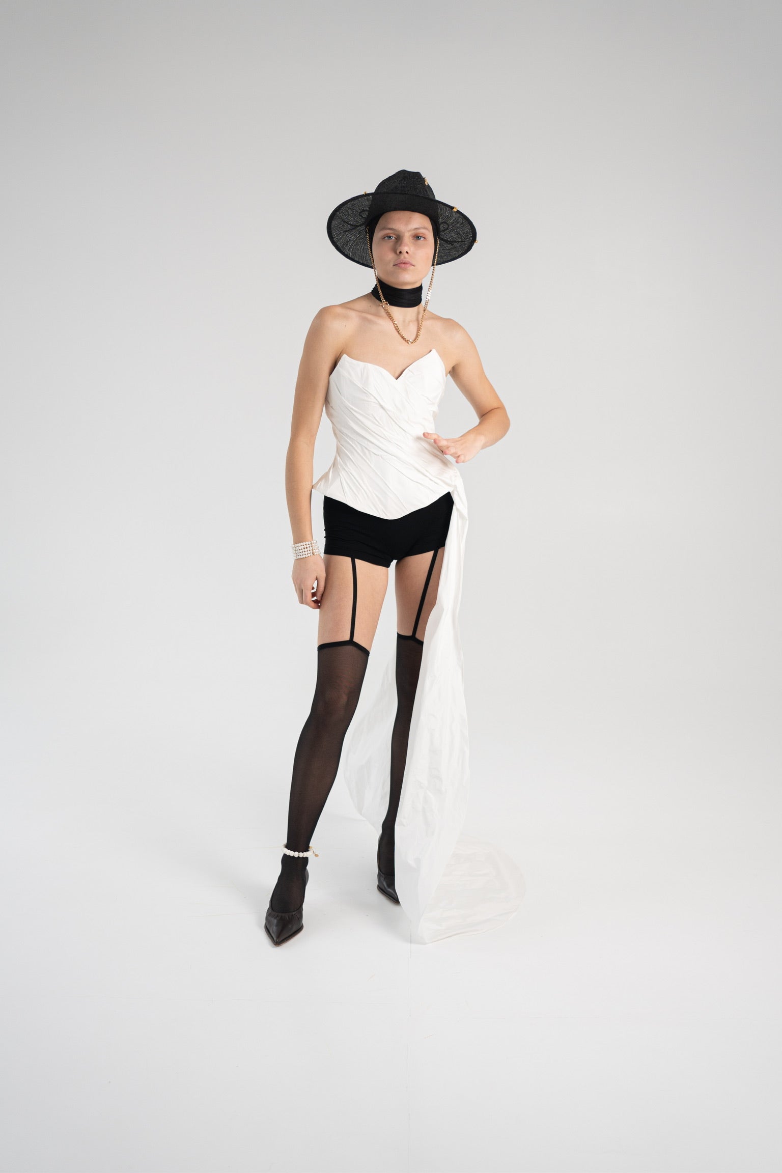 This luxurious black taffeta corset top is a statement piece designed to accentuate the waist and create a dramatic silhouette. The strapless design features structured boning for support and a flattering fit, with a subtle sheen that catches the light beautifully. The piece is adorned with a flowing, elegant tail at the back, adding a touch of grandeur and movement. Perfect for evening events or bold fashion statements, this corset top embodies both sophistication and drama.