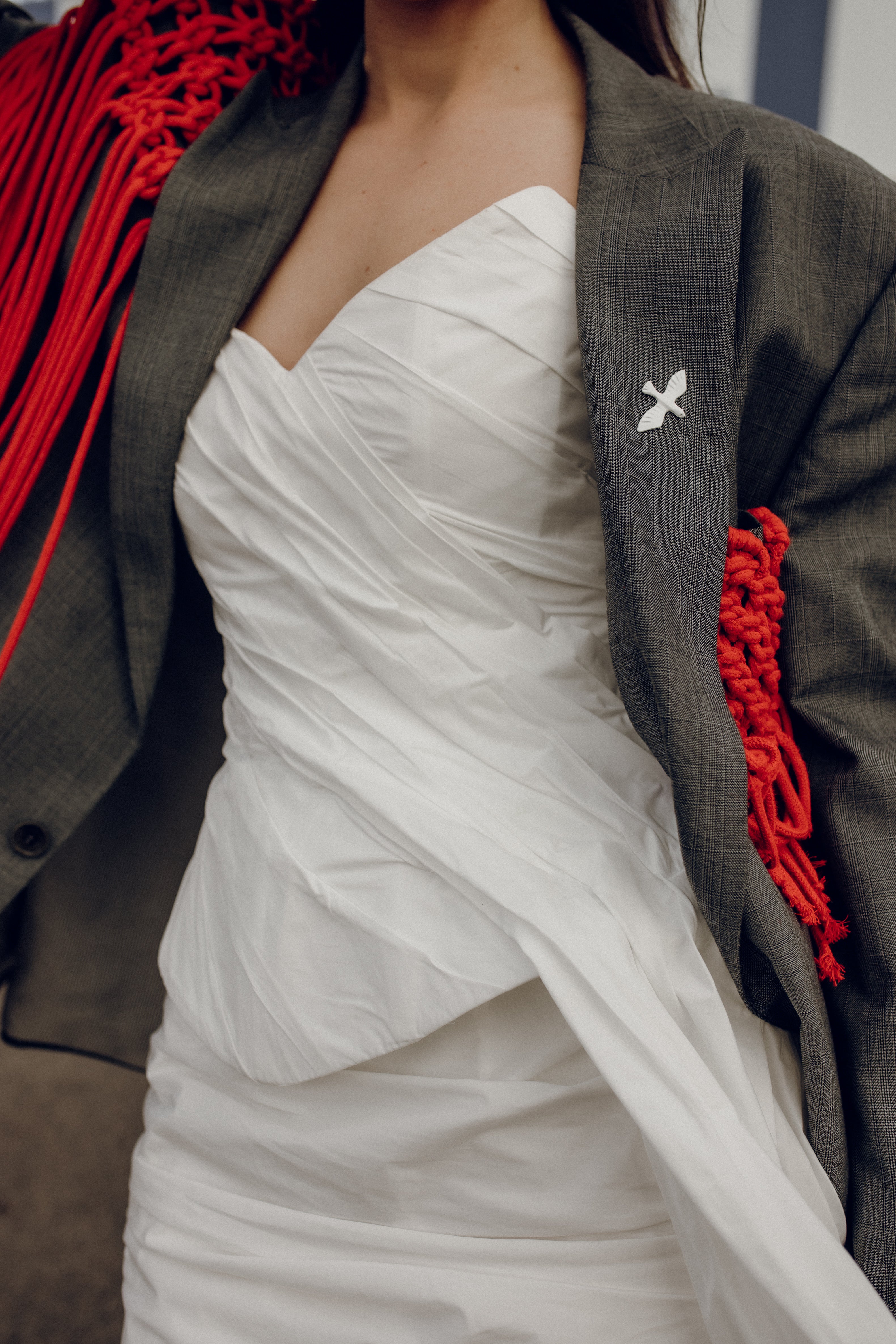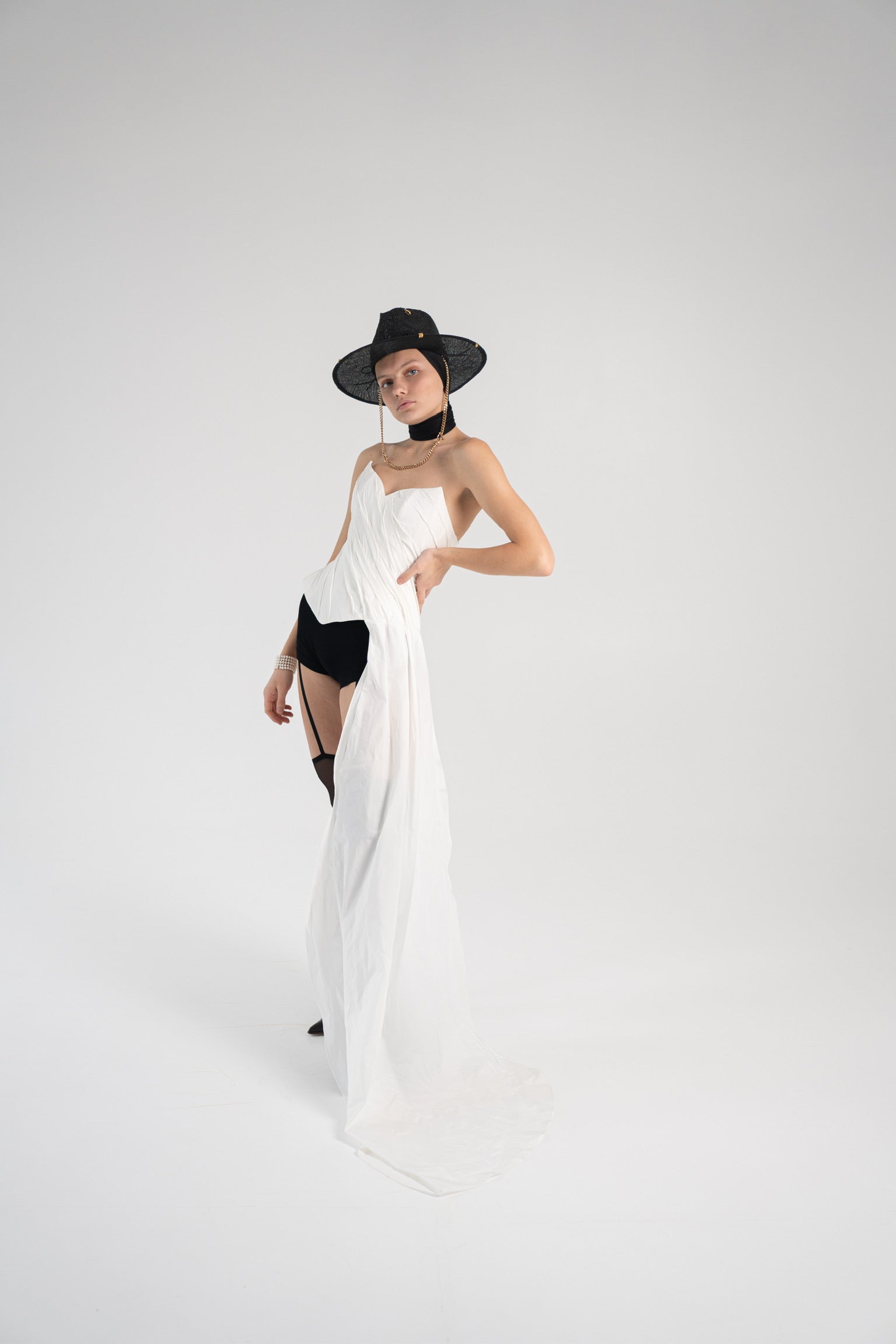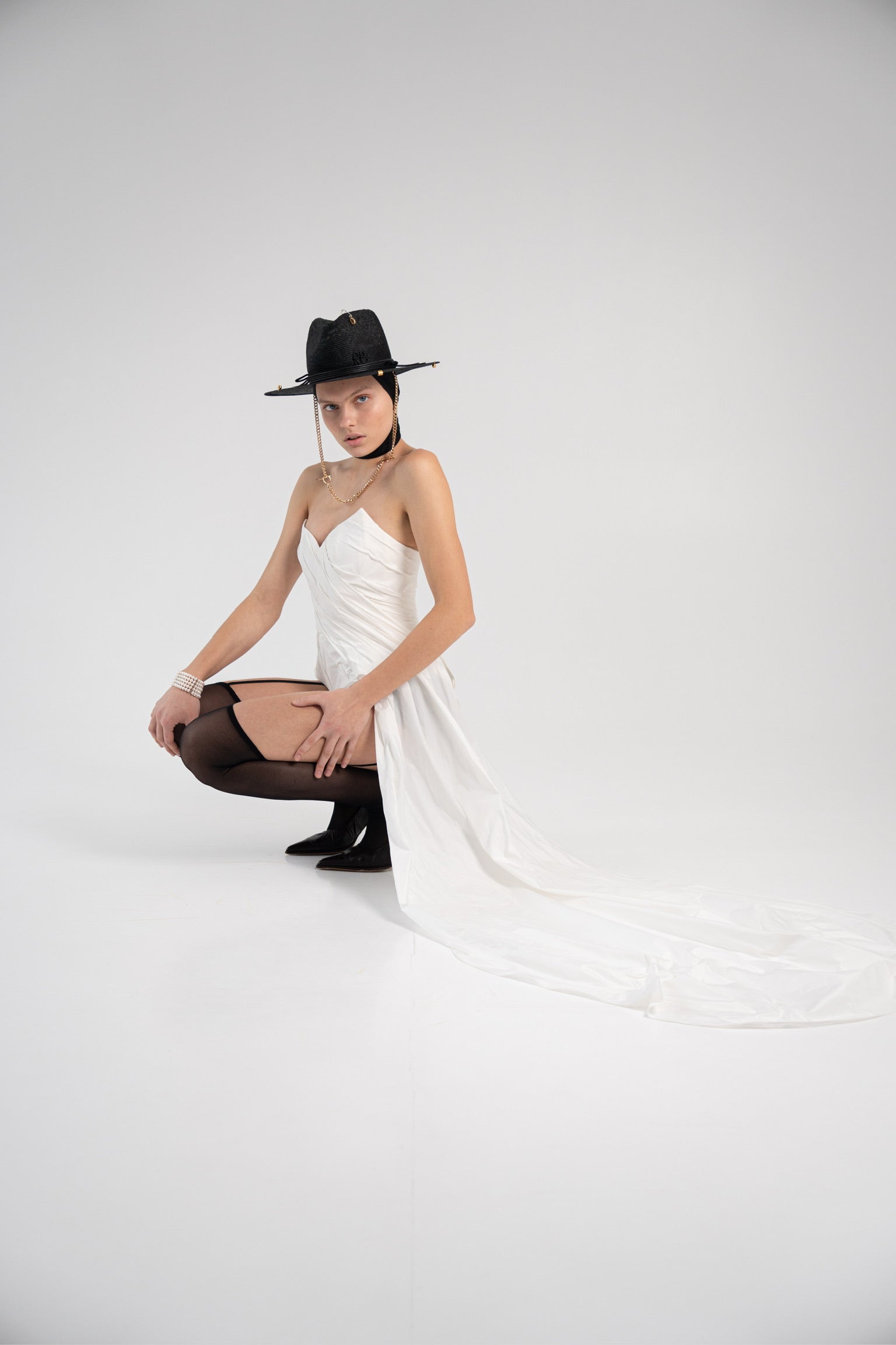 Turn heads in this white taffeta corset top with a strapless corsage, flowing tail, and mini skirt—ideal for parties, proms, and special events.
