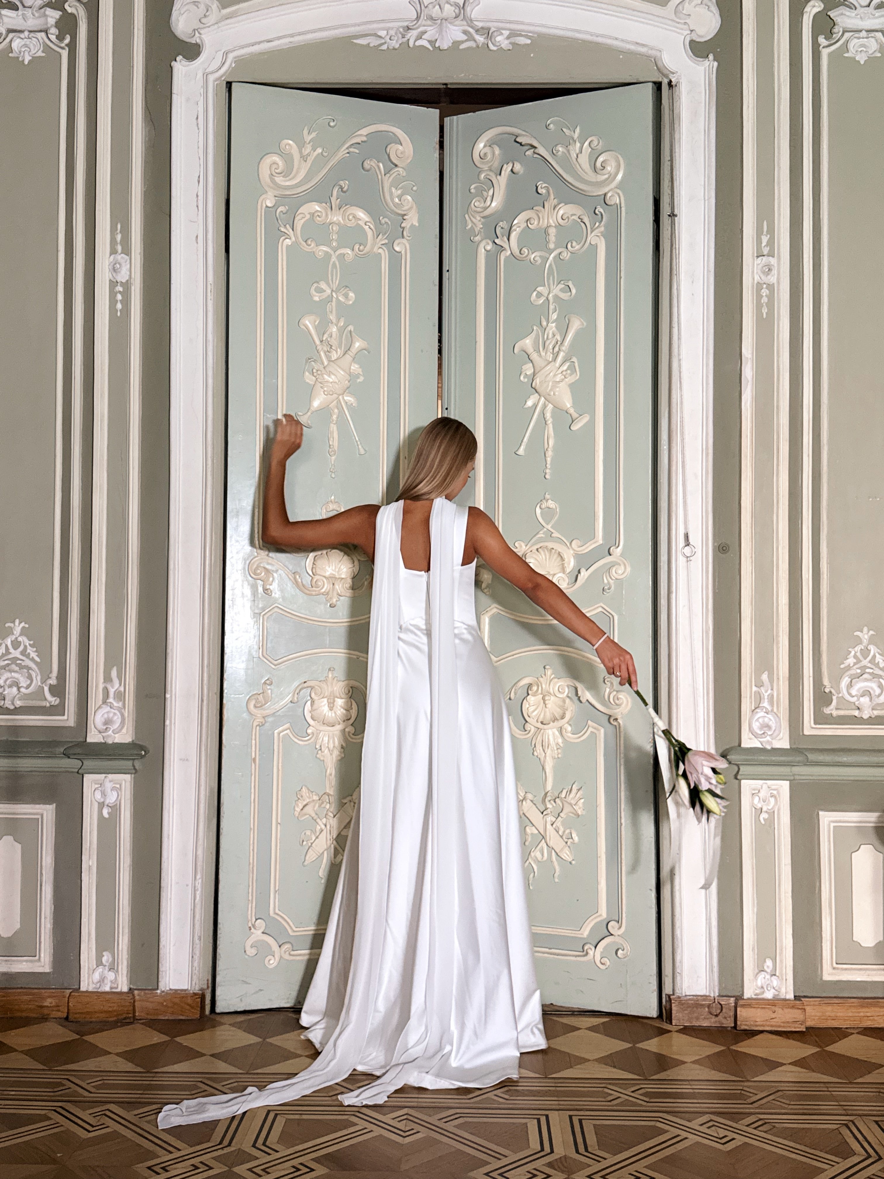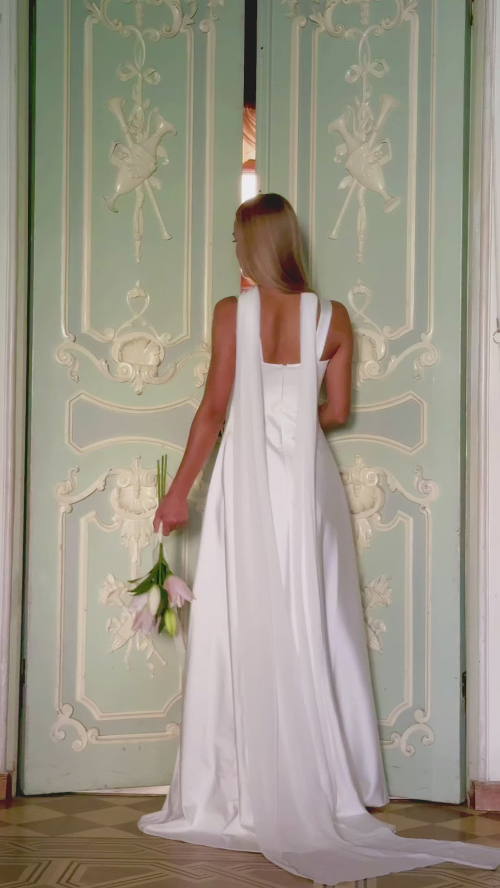 This luxurious A-line wedding dress in ivory satin combines a classic silhouette with the delicate romance of a modern cut. The sweetheart neckline elegantly emphasizes the shoulders and décolleté, creating a feminine and sophisticated look. The soft corset accentuates the waist, while the long, flowing maxi skirt elongates the silhouette, lending it grace.