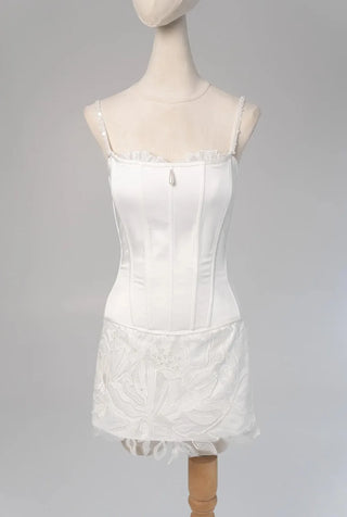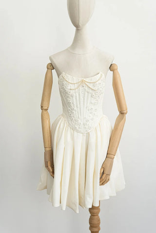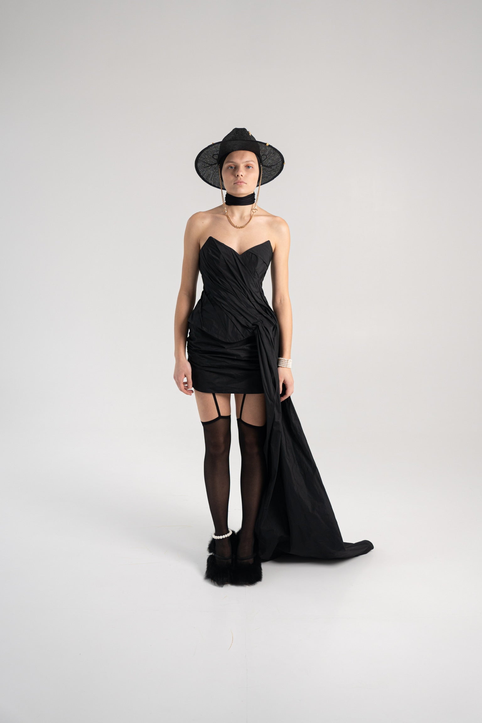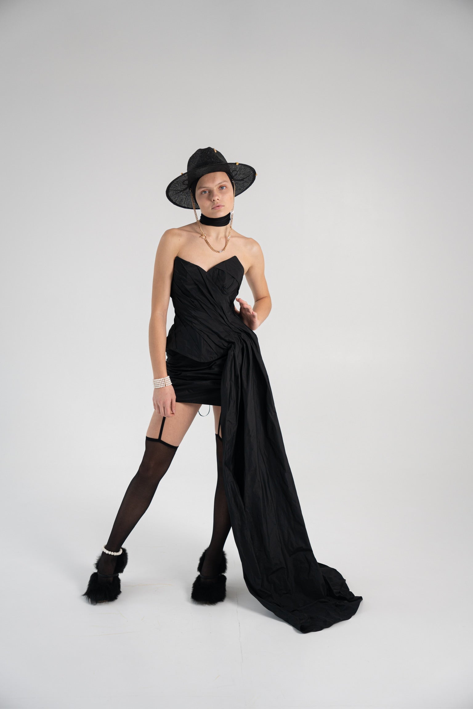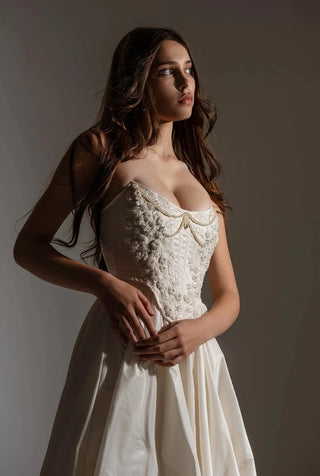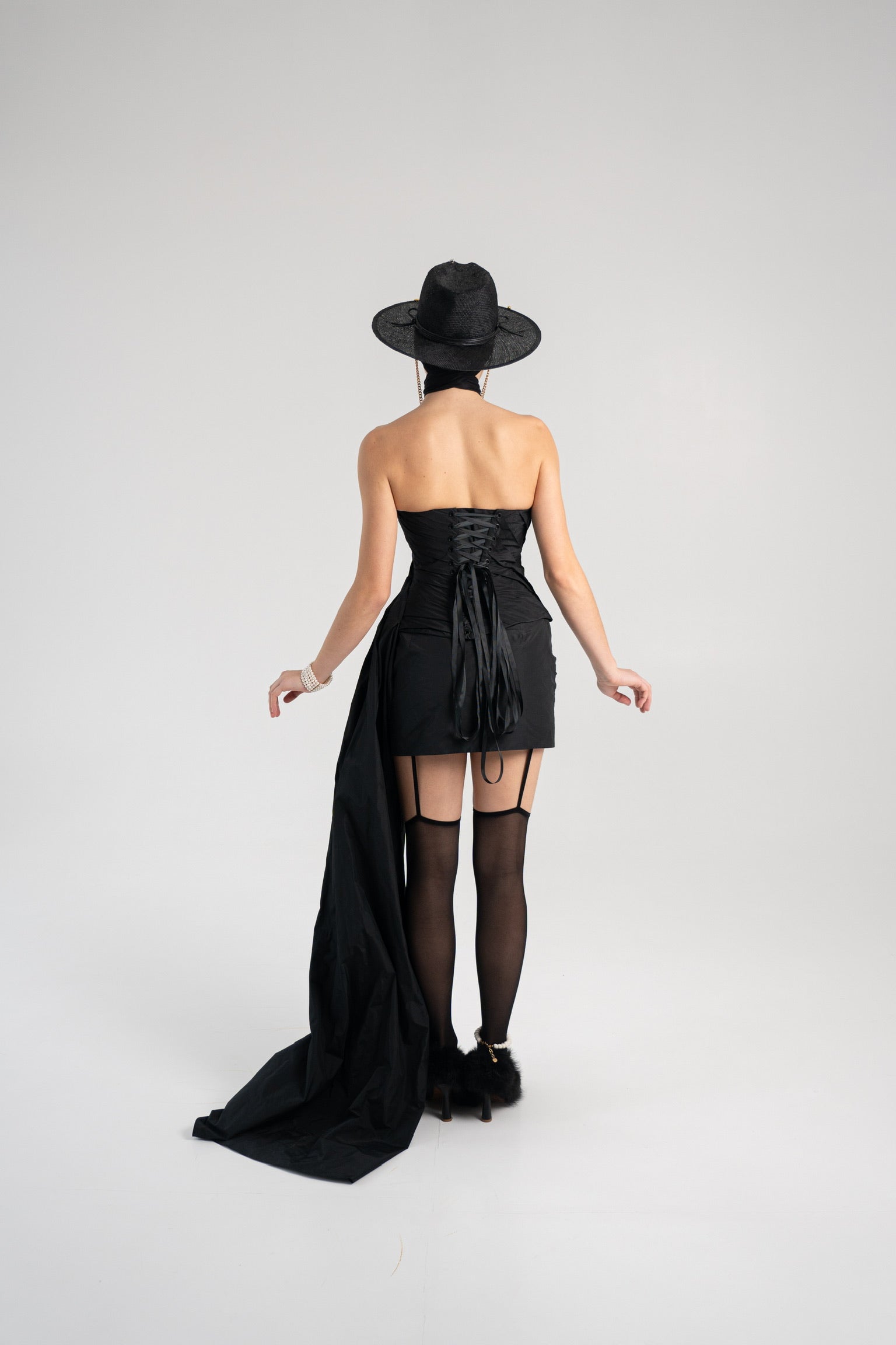 This luxurious coral taffeta corset top is a statement piece designed to accentuate the waist and create a dramatic silhouette. The strapless design features structured boning for support and a flattering fit, with a subtle sheen that catches the light beautifully. The piece is adorned with a flowing, elegant tail at the back, adding a touch of grandeur and movement. Perfect for evening events or bold fashion statements, this corset top embodies both sophistication and drama.