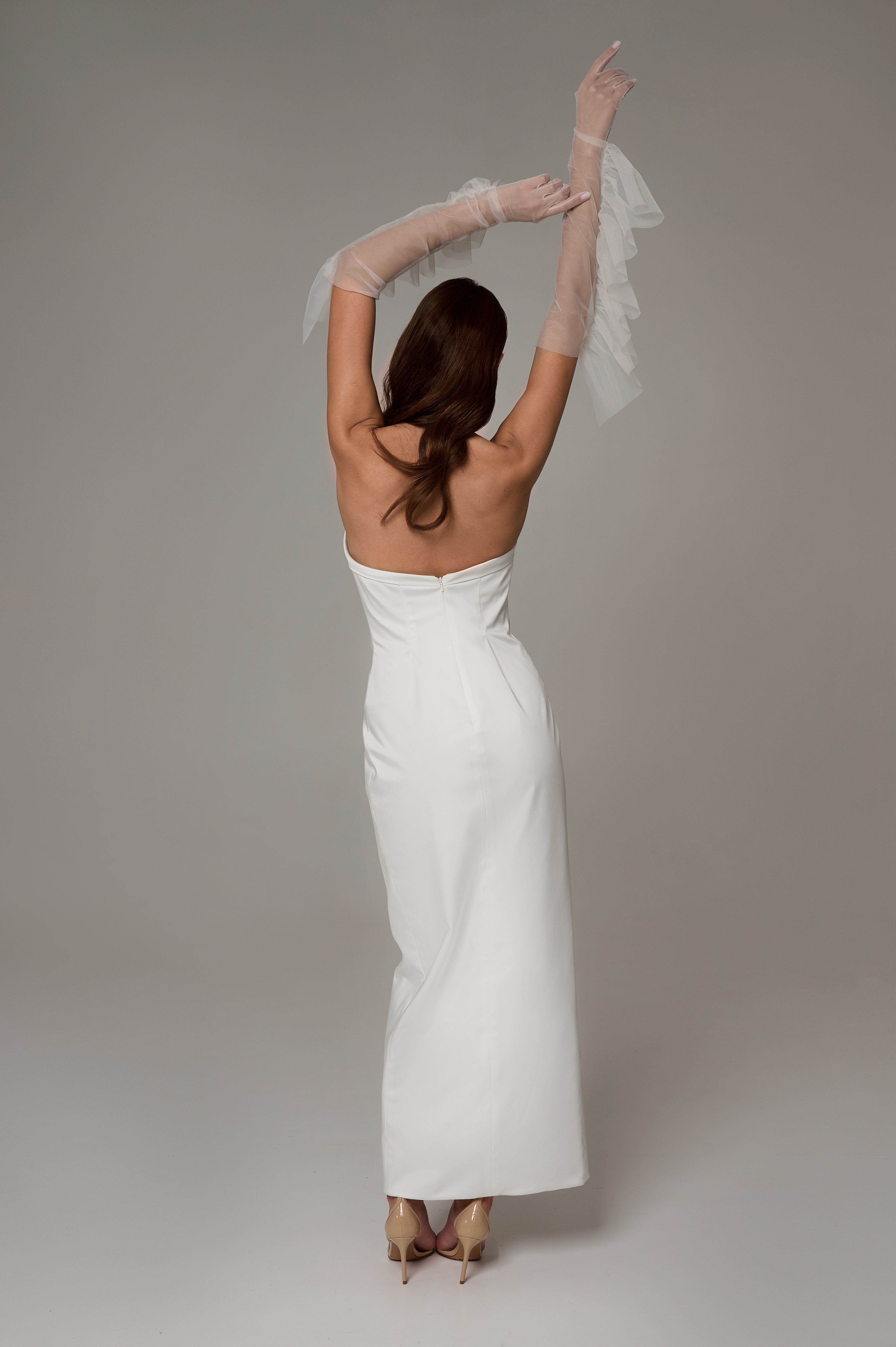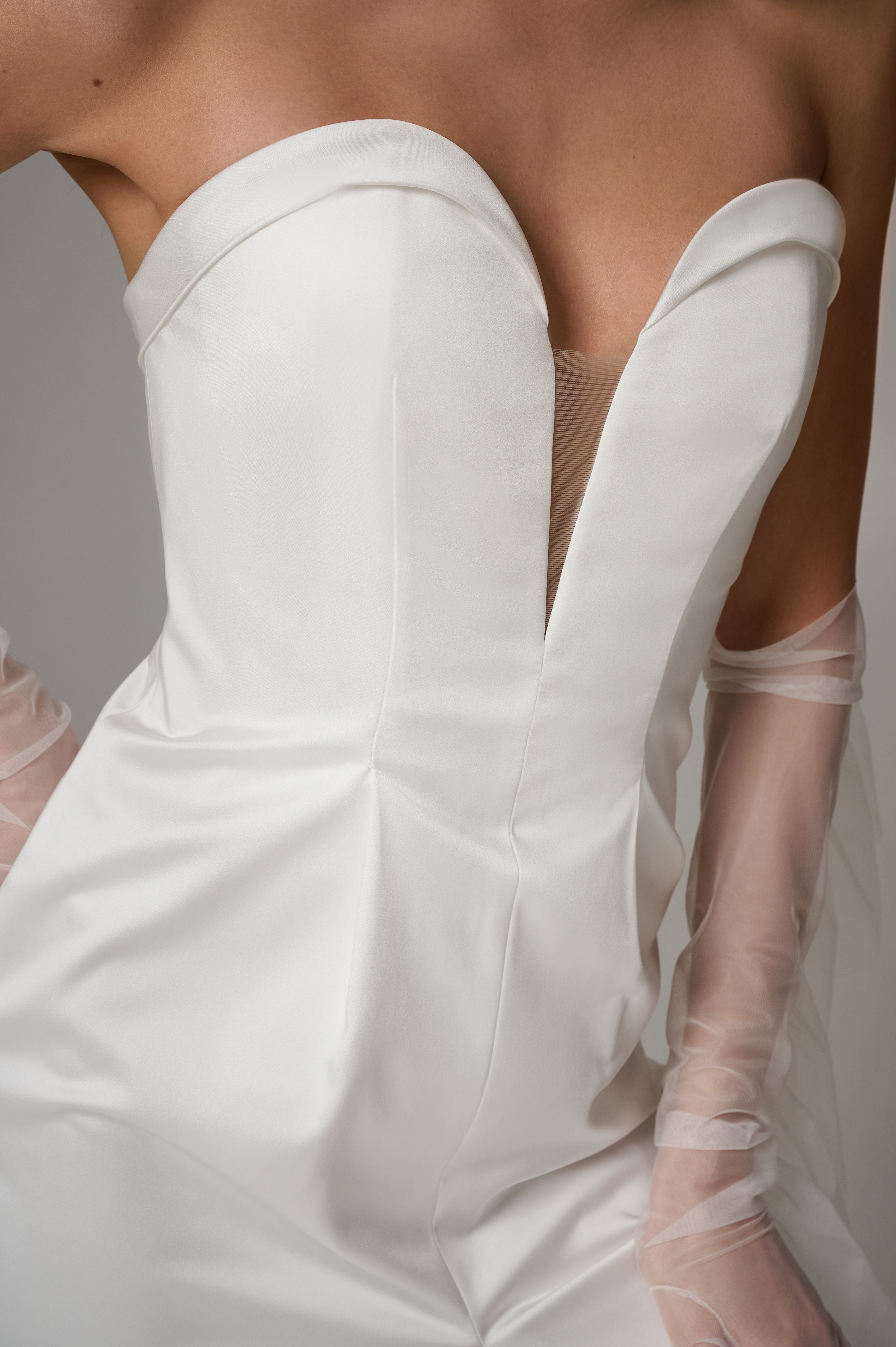 This Satin Ivory Wedding Dress is designed for the modern bride who wants to make a bold yet elegant statement. With its strapless design and deep V-neck, this gown combines sophisticated allure with contemporary charm, making it the perfect choice for an evening reception or a chic second look after the ceremony.