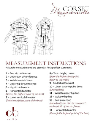 For custom-made corsets or corset dresses, please refer to points 6–14 on the image for additional measurements. These are essential for ensuring a perfect, personalized fit.